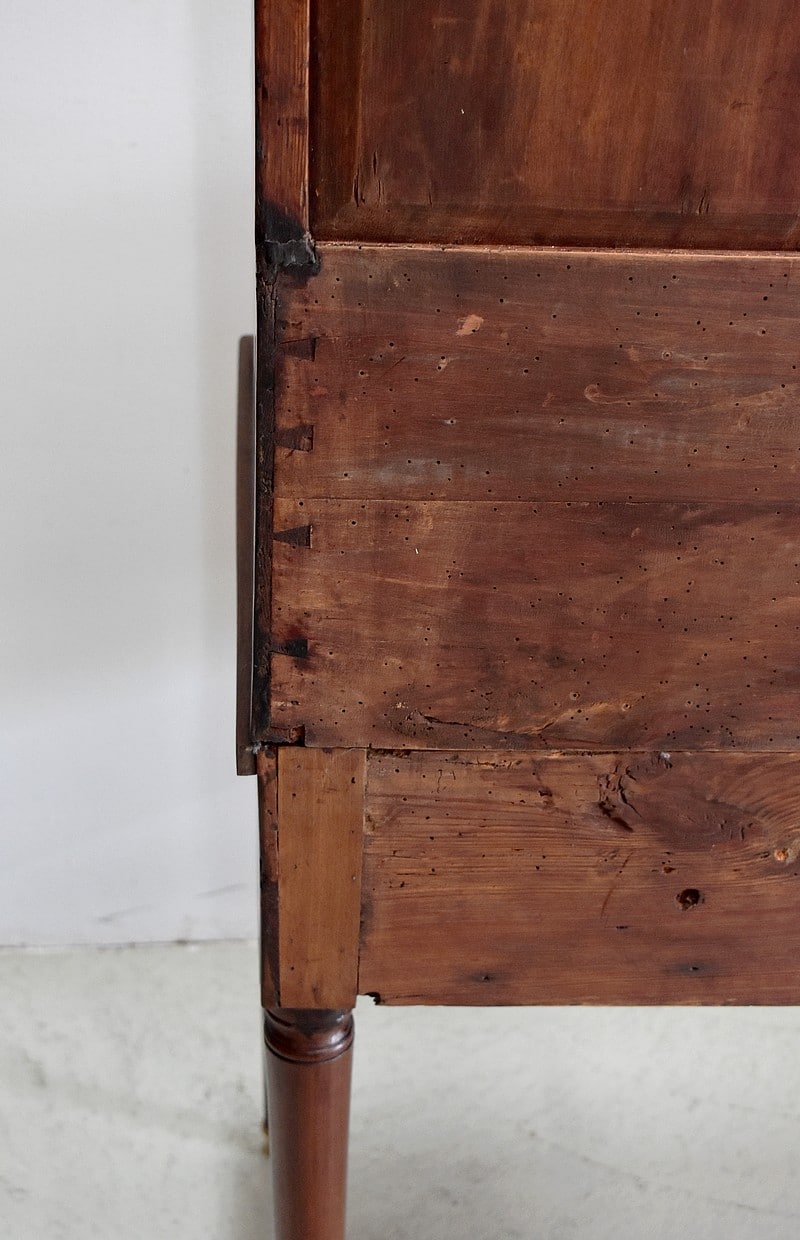 En dessous, deux tiroirs fermant à clef se trouvent en ceinture ornés d’un cadre simple. Toutes les serrures sont anciennes et les clefs changées.