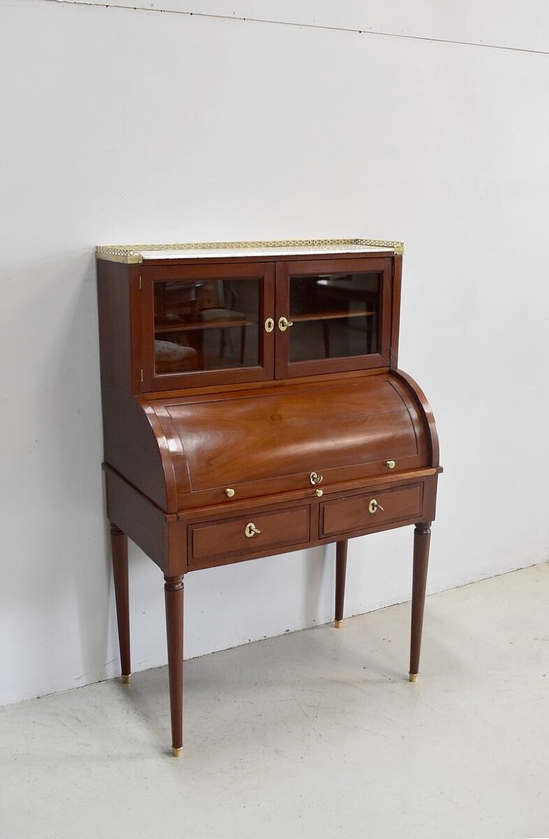 Bonheur du jour Louis XVI à Cylindre et à gradin en Acajou de Cuba massif et placage d’Acajou. Son dessus en marbre blanc avec ses marque d’usure est ceinturé d’une galerie en laiton ajourée.