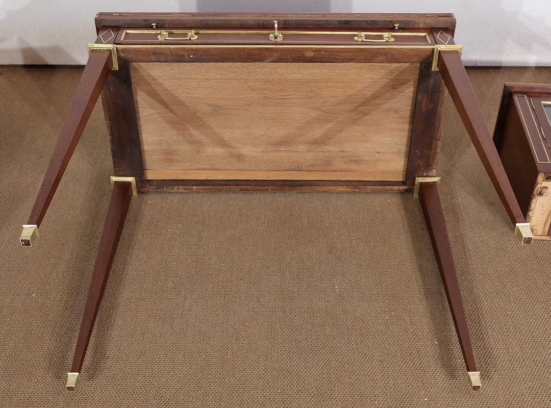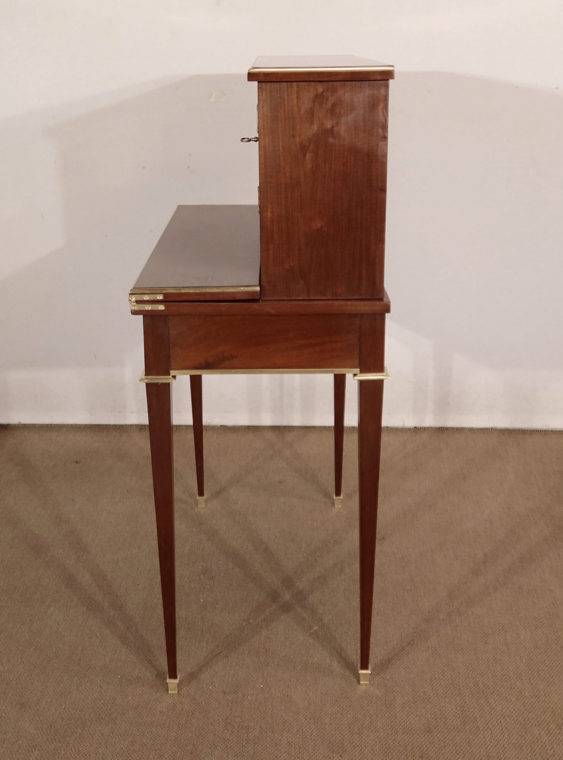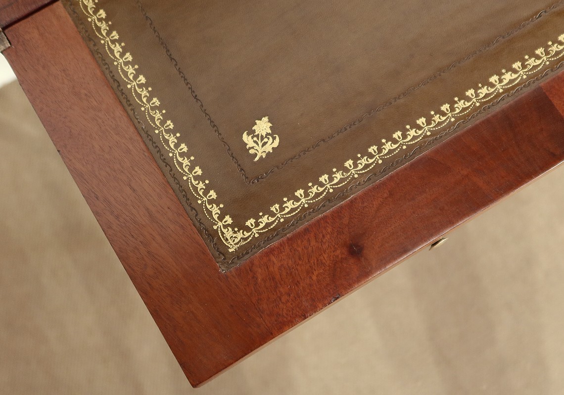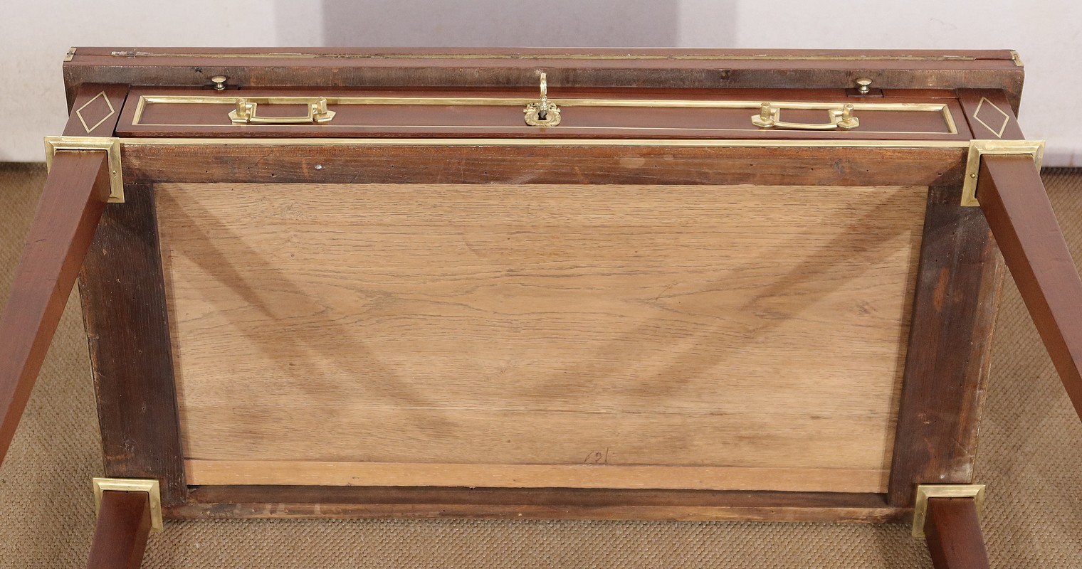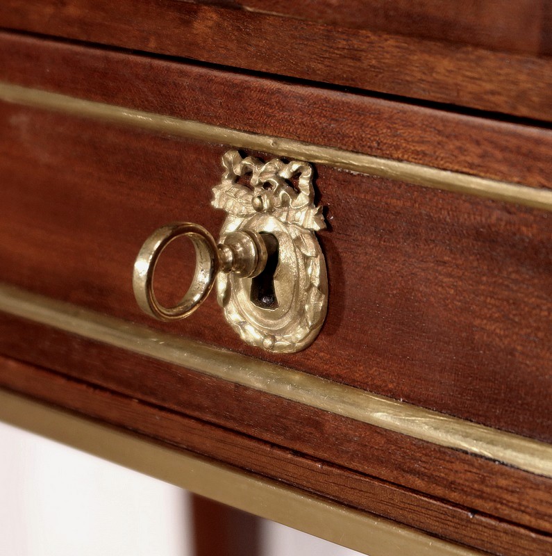 Sa ceinture est munie d’un tiroir unique dont la façade à défoncement est entourée en partie intérieur d’un quart de rond en laiton. Deux poignées de tirage Louis XVI en laiton, encadrent une serrure authentique en état de fonctionnement, bénéficiant d’une entrée ovalisée en bronze surmontée d’un nœud Louis XVI. De chaque côté, une incrustation en laiton formant un losange apporte une touche d’originalité à ce bien. Au dessus, deux tirettes avec boutons «lentille » permettent le maintien de la partie écritoire qui se déploie grâce à des charnières. Nous découvrons une partie intérieure foncée d’un cuir vert amande avec vignette à froid, vignette dorée et angles aux motifs dorés également.