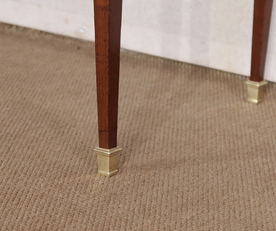 L’ensemble repose sur quatre pieds gainés se terminant par un sabot laiton avec une partie haute entourée, en saillie, d’une moulure en laiton.