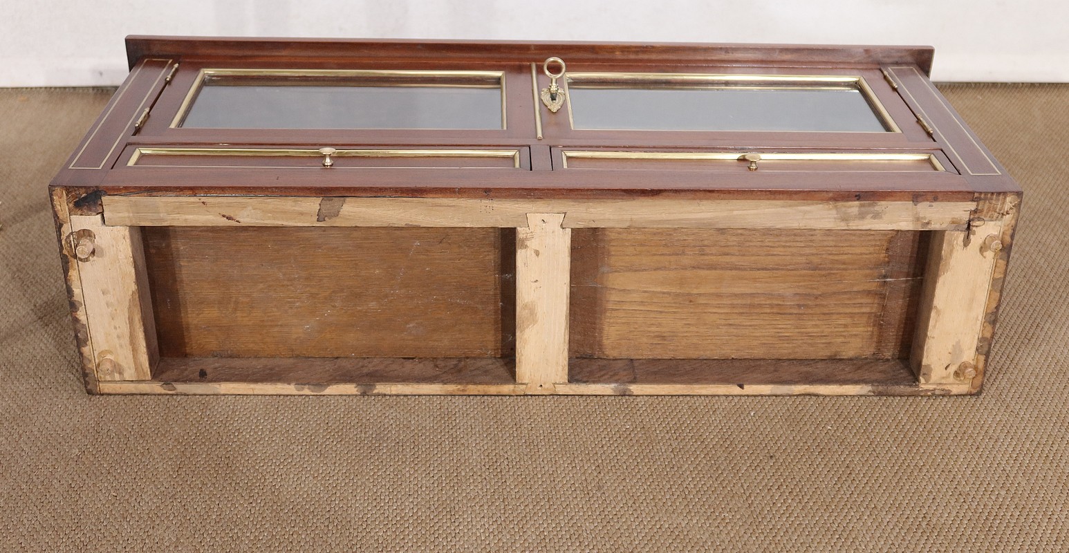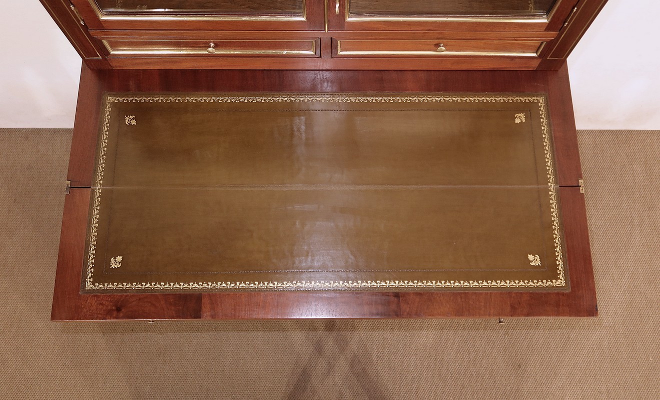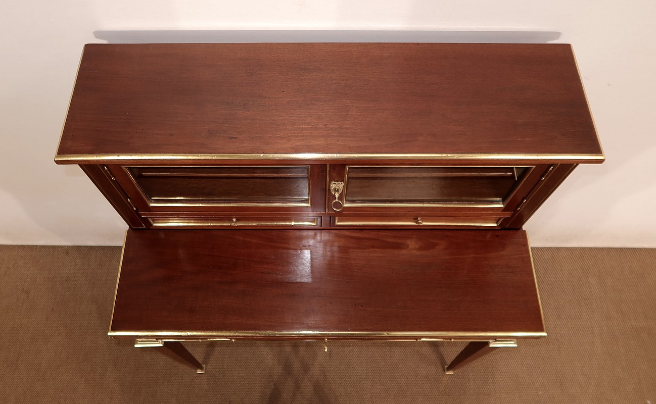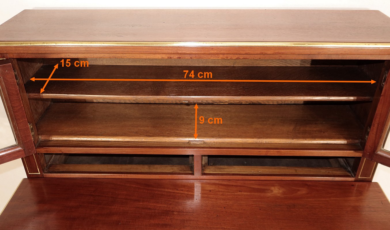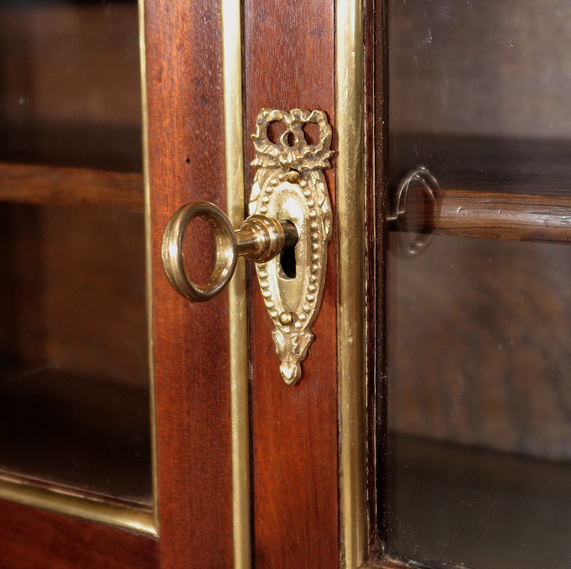 Au dessus, deux petites portes à encadrement en acajou massif sont vitrées sur des pommelles discrètes en laiton. La porte droite se referme sur la partie gauche par un petit couvre-joint en laiton. Nous retrouvons une serrure d’origine avec clé en état de fonctionnement agrémentée d’une entrée louis XVI perlée.