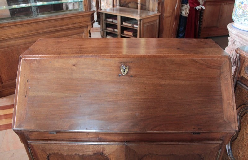 Rare Buffet-Scriban Louis XV en noyer de la région Nantaise, dans le goût des meubles de port. Il ouvre par un abattant et 2 portes à médaillons en partie basse. L’abattant découvre un intérieur à mouvement avec 4 petits tiroirs, 1 porte, 2 casiers verticaux et 1 casier secret.