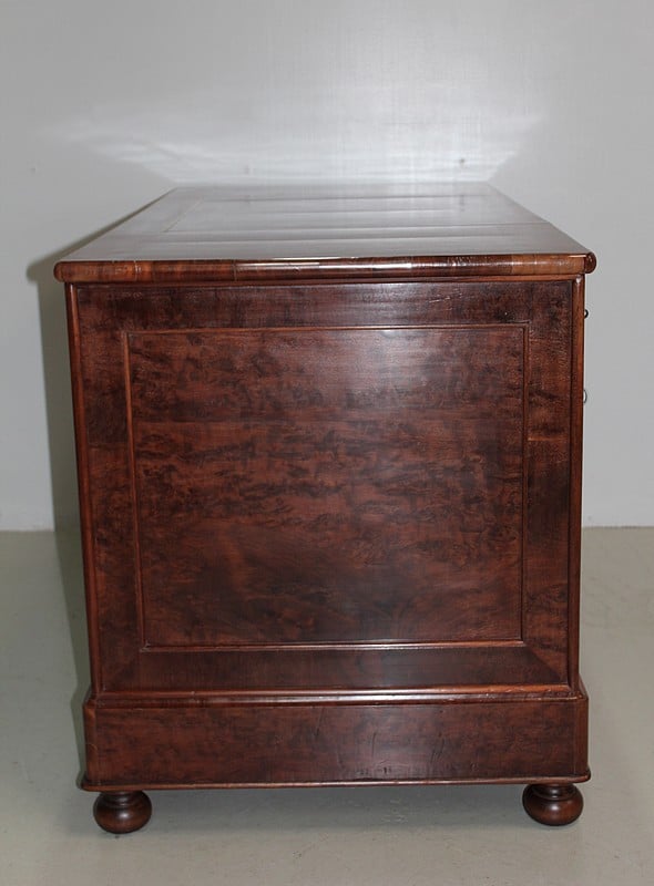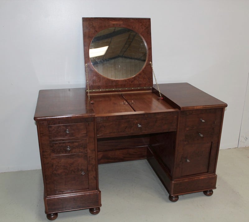 Bureau de milieu à caissons en placage d’acajou moucheté du Honduras, sur chêne.