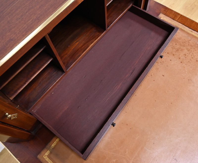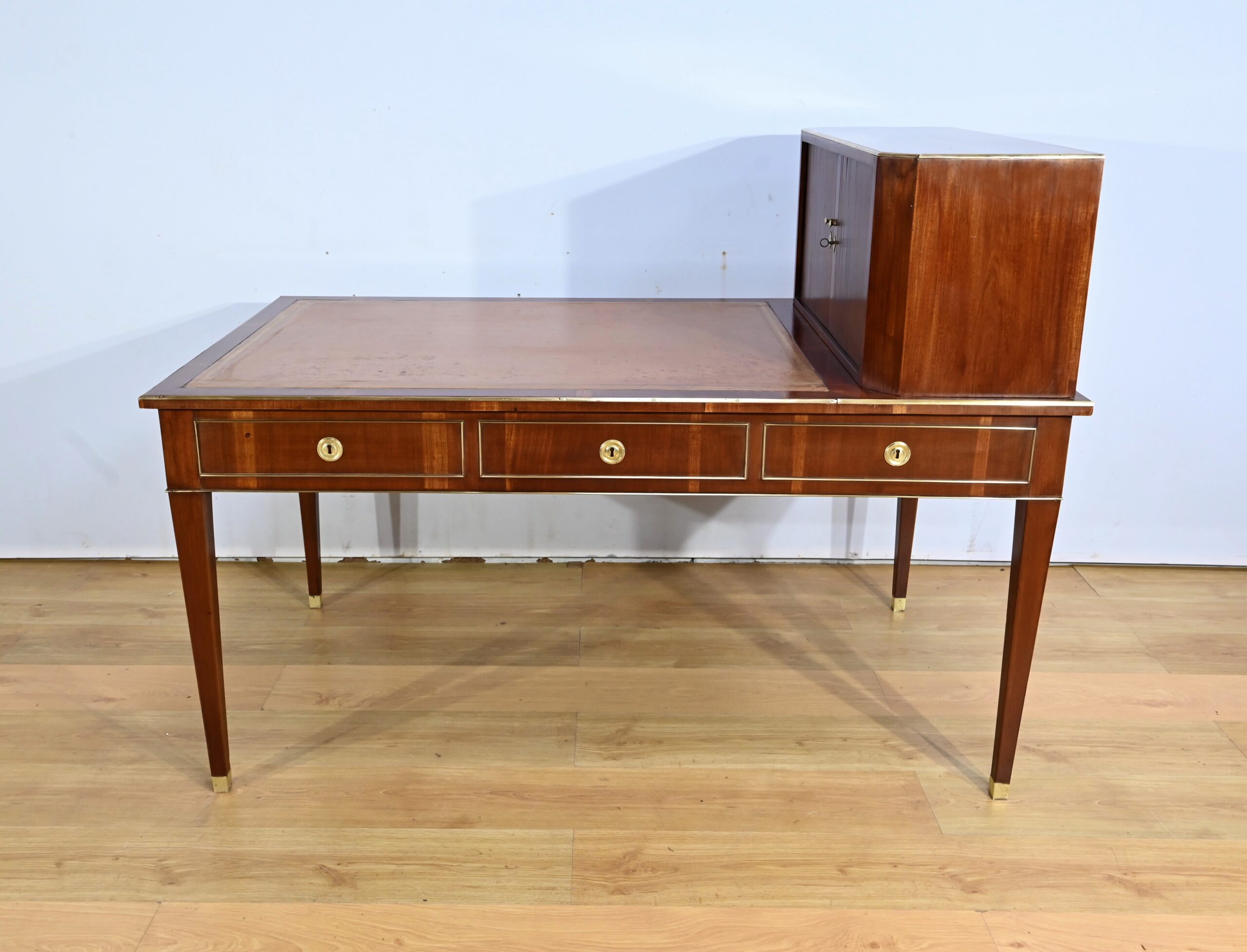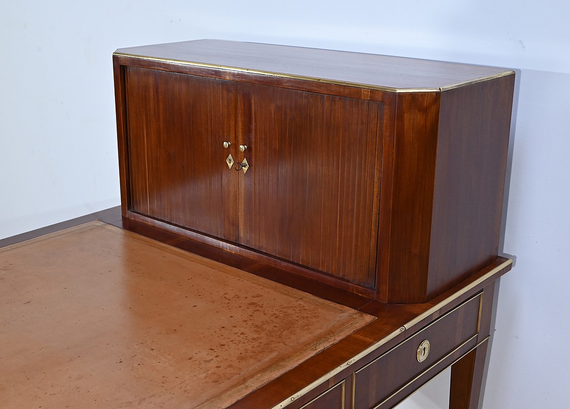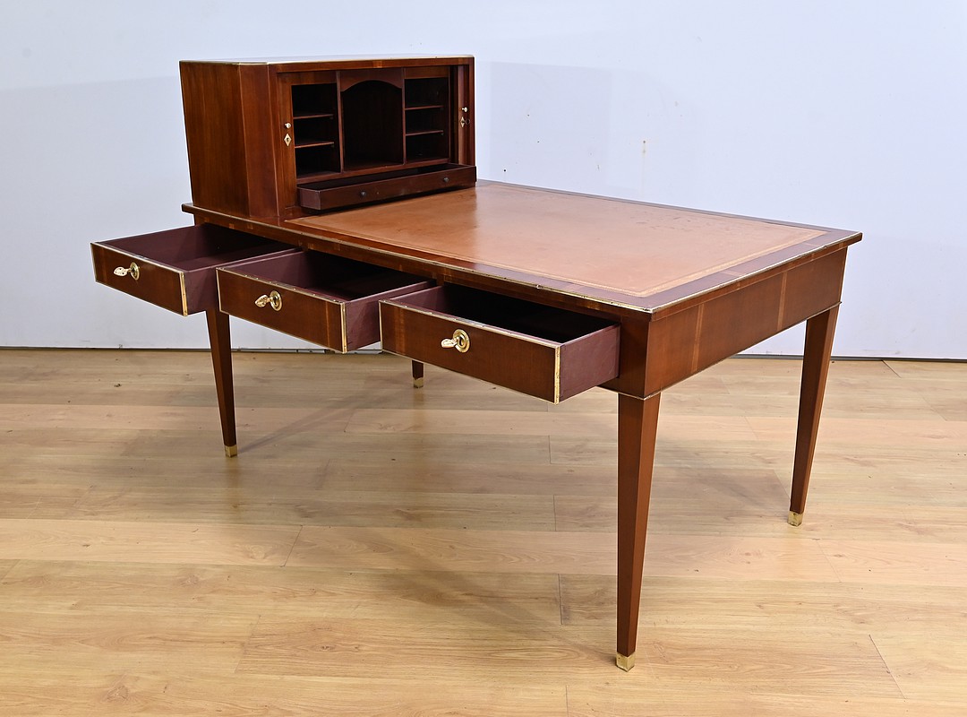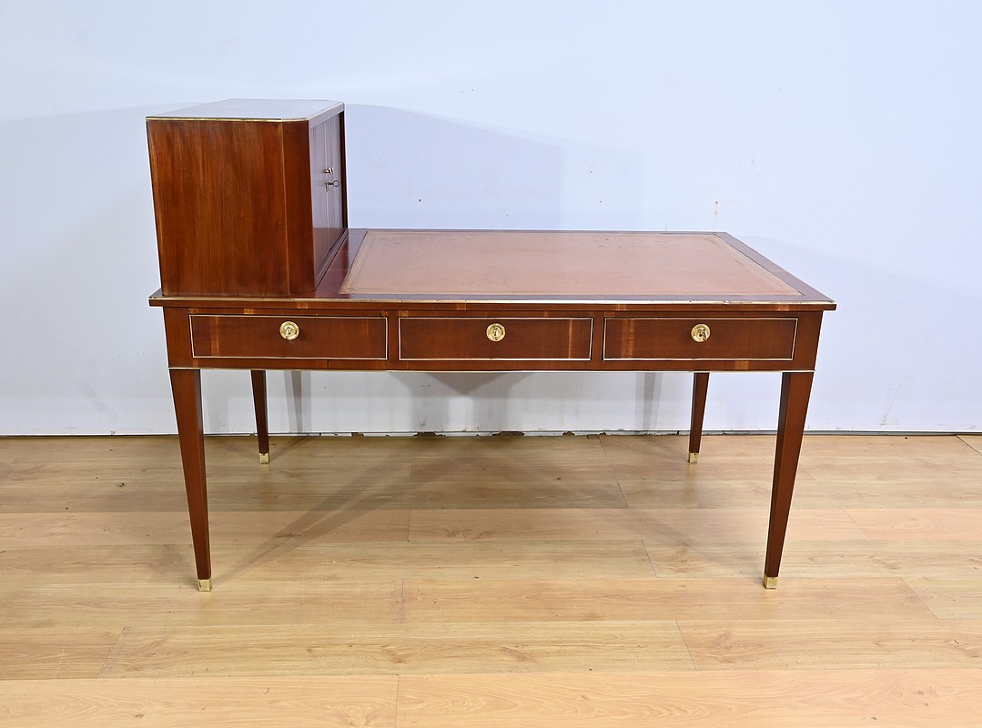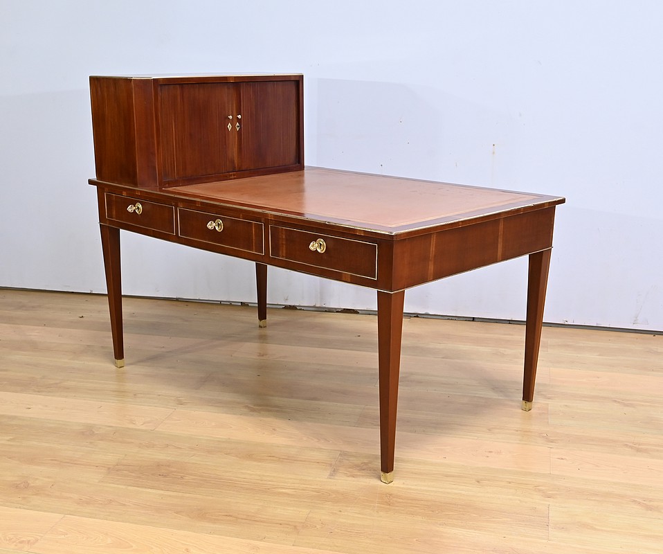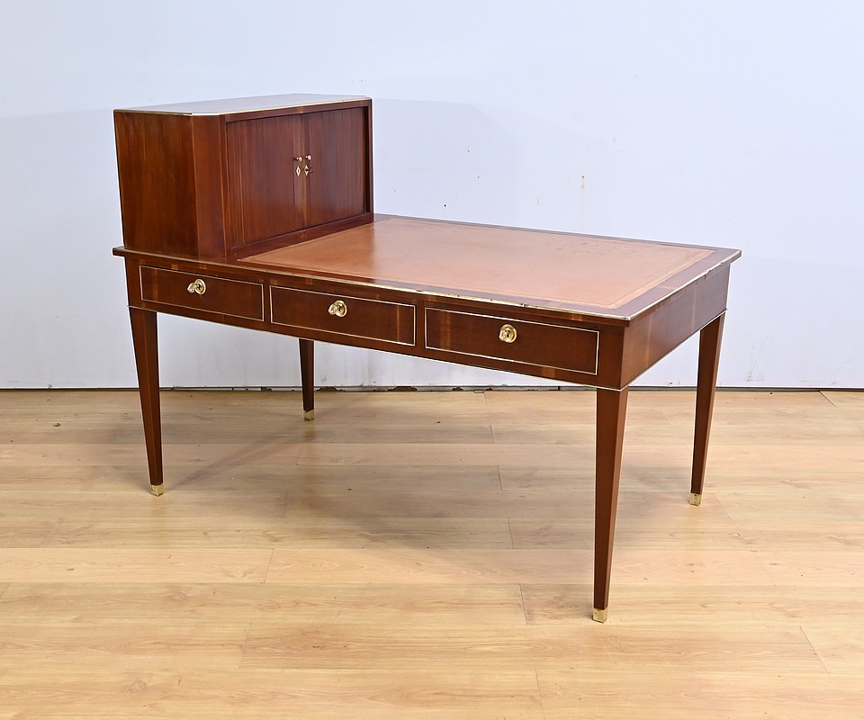 Bureau Directoire ouvrant par trois tiroirs identiques en ceinture. Ces derniers sont pourvus de serrures en état de fonctionnement avec clé pique et entrée circulaire en bronze doré. Les pieds gaines fuselés se terminent par des sabots sobres. Le pourtour du bureau est doté de baguettes en laiton soulignant également la ceinture et les façades des tiroirs. La façade opposée du bureau est munie de trois faux tiroirs. Le dessus de ce meuble est garni d’un cuir épais avec vignette dorée. Ce bureau a la particularité d’être composé d’un cartonnier à rideaux découvrant niches et tiroir, apportant fonctionnalité et originalité à ce meuble.