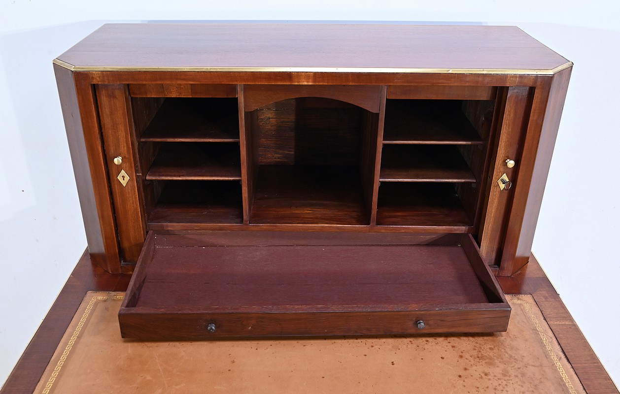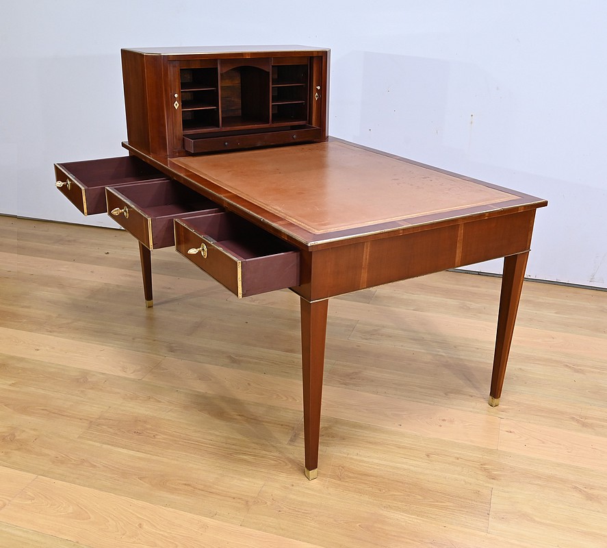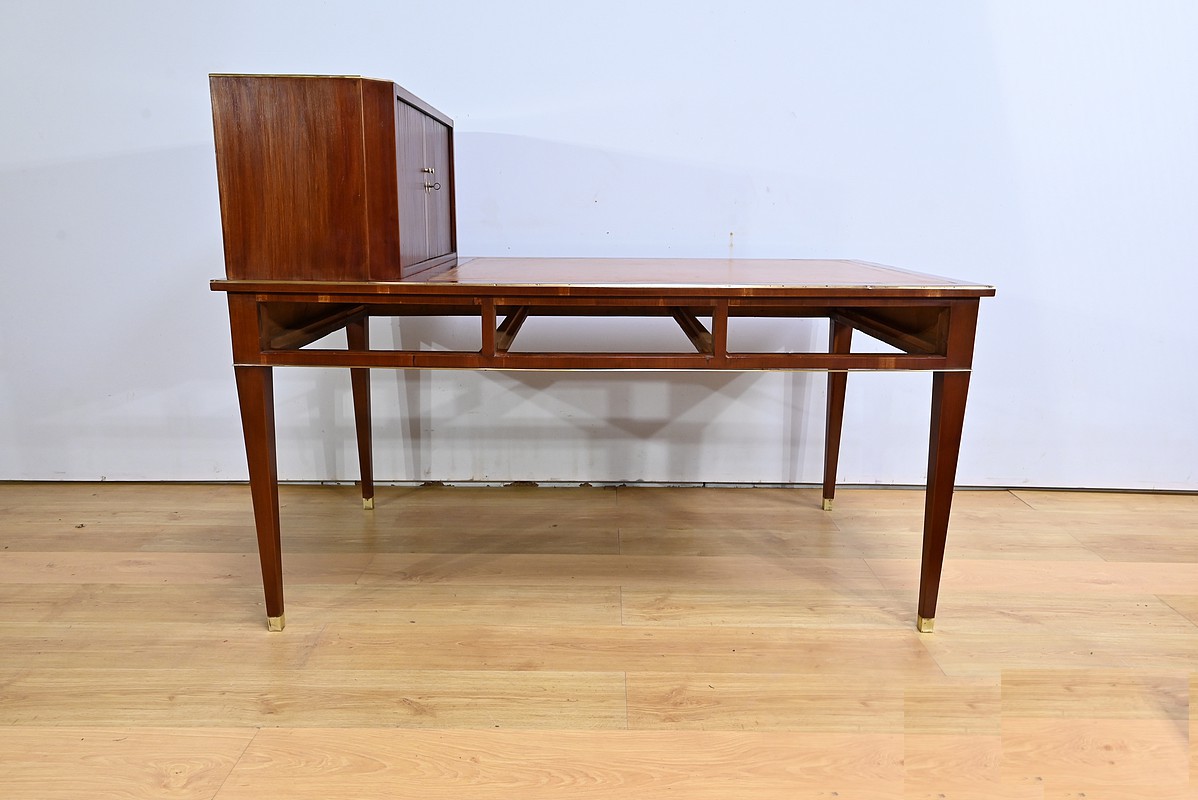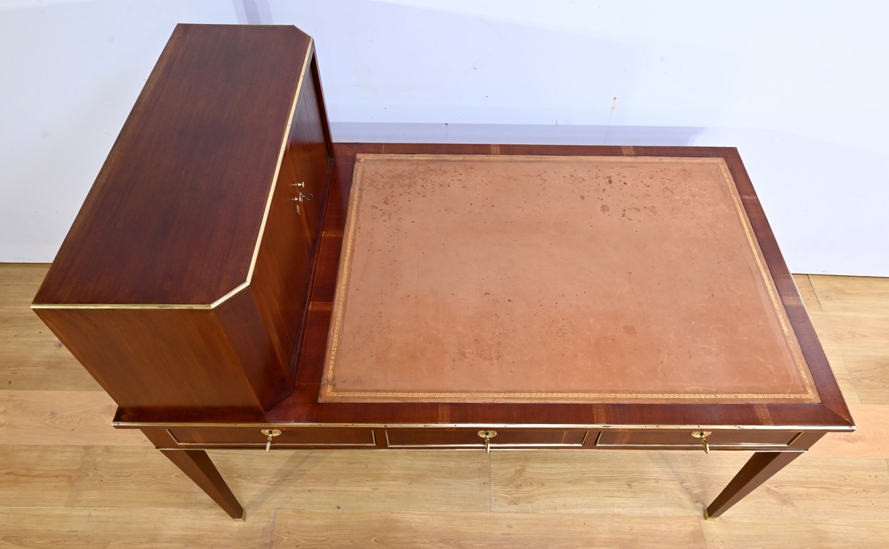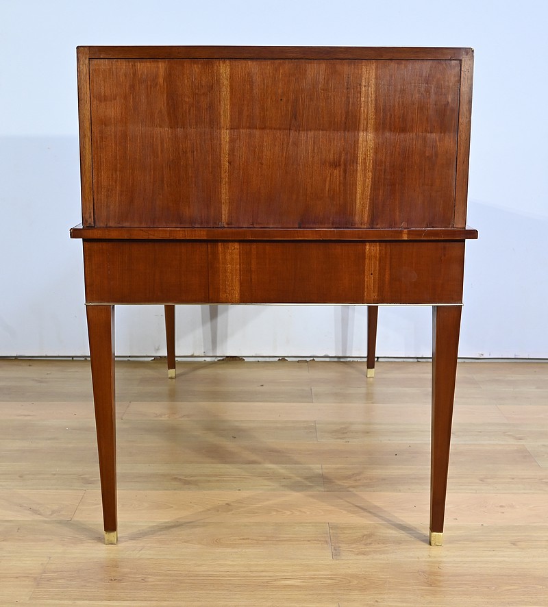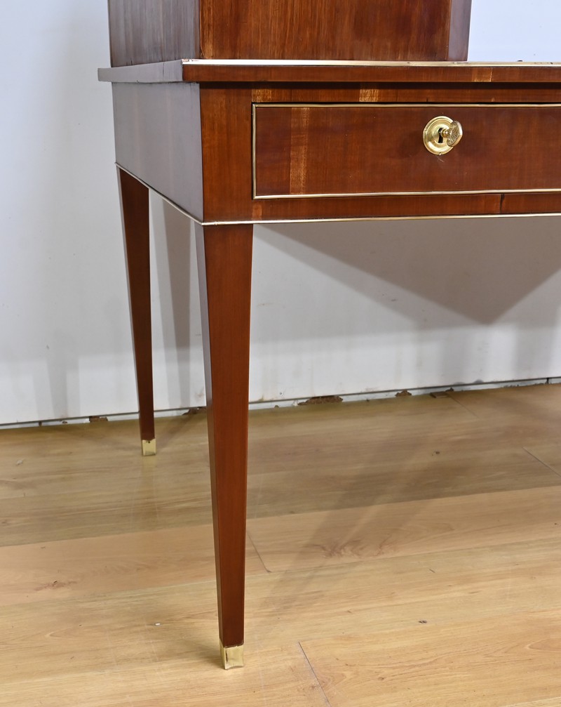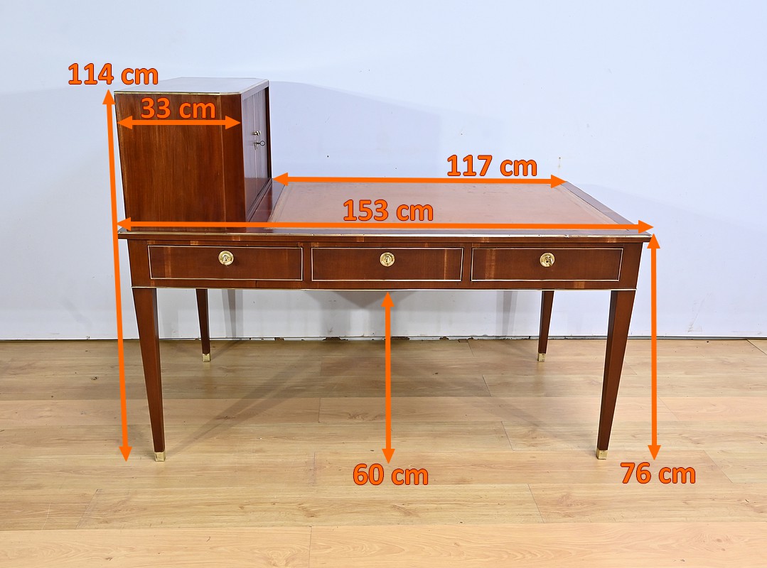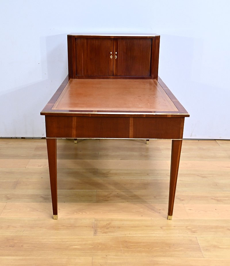 Bureau Directoire ouvrant par trois tiroirs identiques en ceinture. Ces derniers sont pourvus de serrures en état de fonctionnement avec clé pique et entrée circulaire en bronze doré. Les pieds gaines fuselés se terminent par des sabots sobres. Le pourtour du bureau est doté de baguettes en laiton soulignant également la ceinture et les façades des tiroirs. La façade opposée du bureau est munie de trois faux tiroirs. Le dessus de ce meuble est garni d’un cuir épais avec vignette dorée. Ce bureau a la particularité d’être composé d’un cartonnier à rideaux découvrant niches et tiroir, apportant fonctionnalité et originalité à ce meuble.