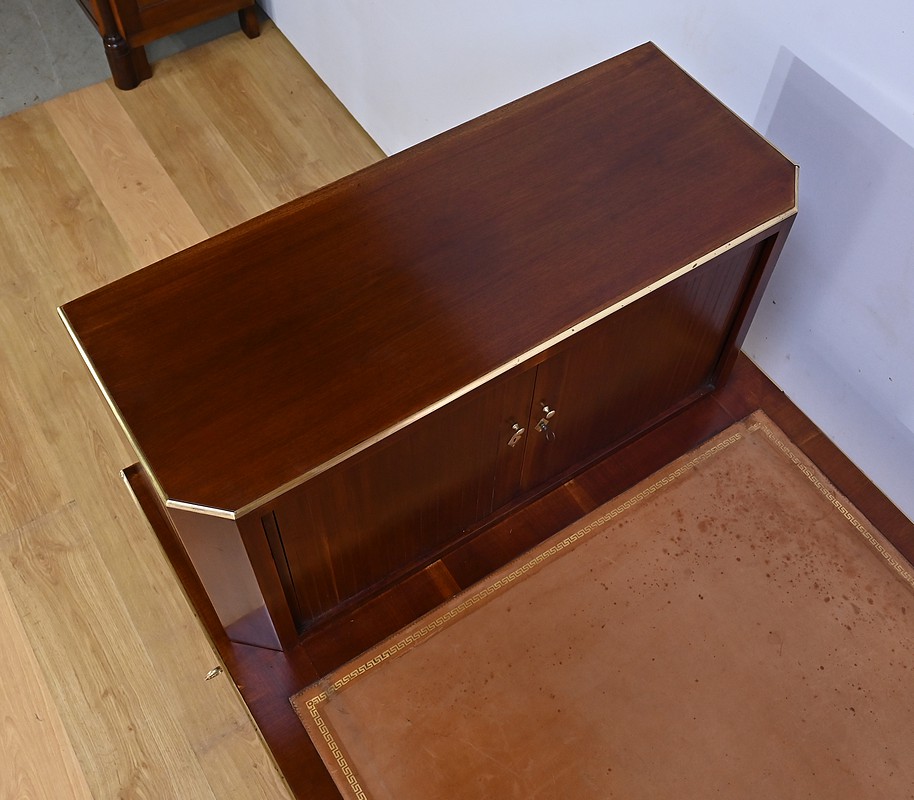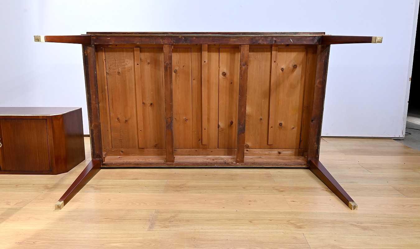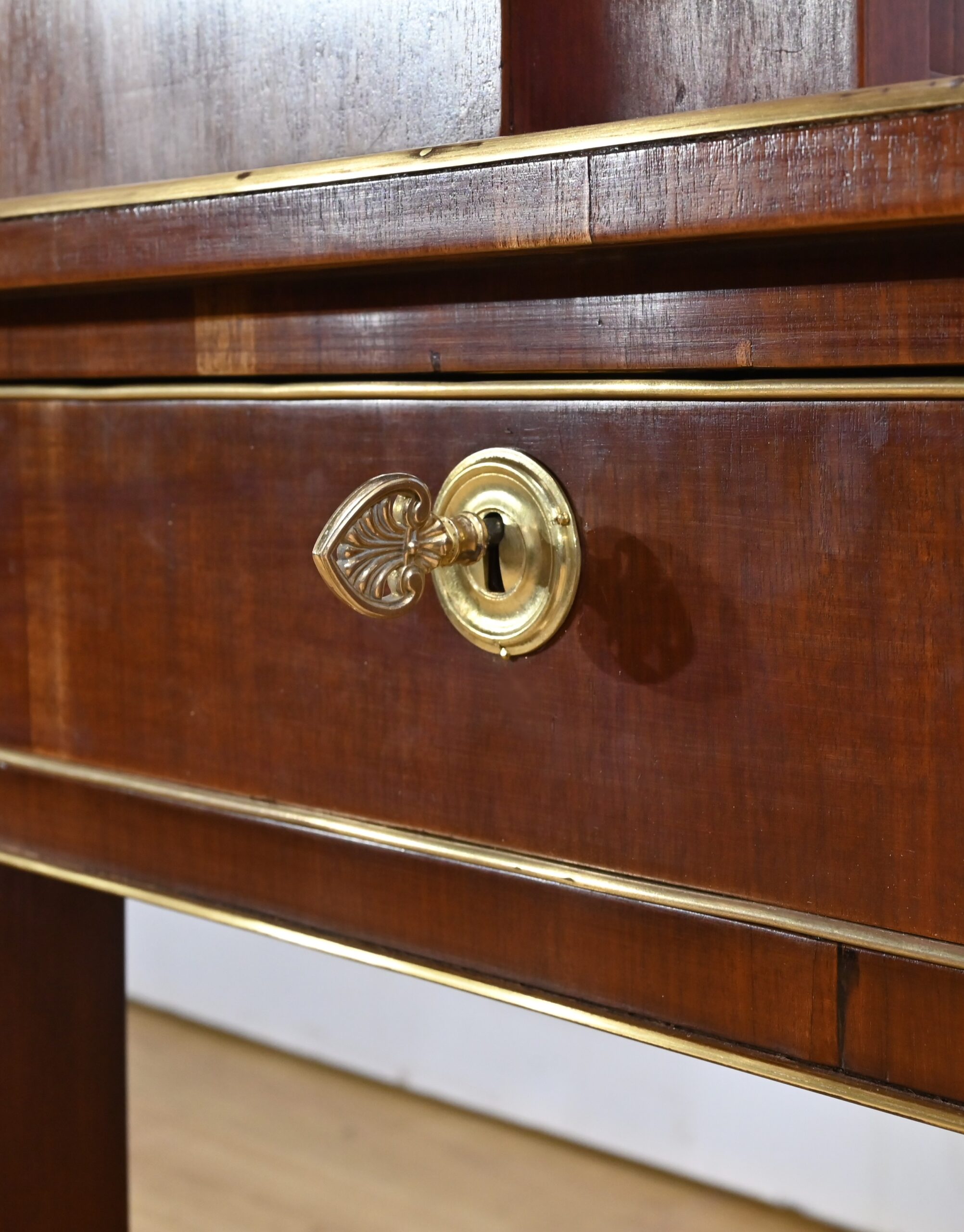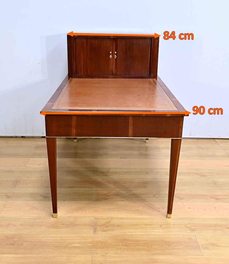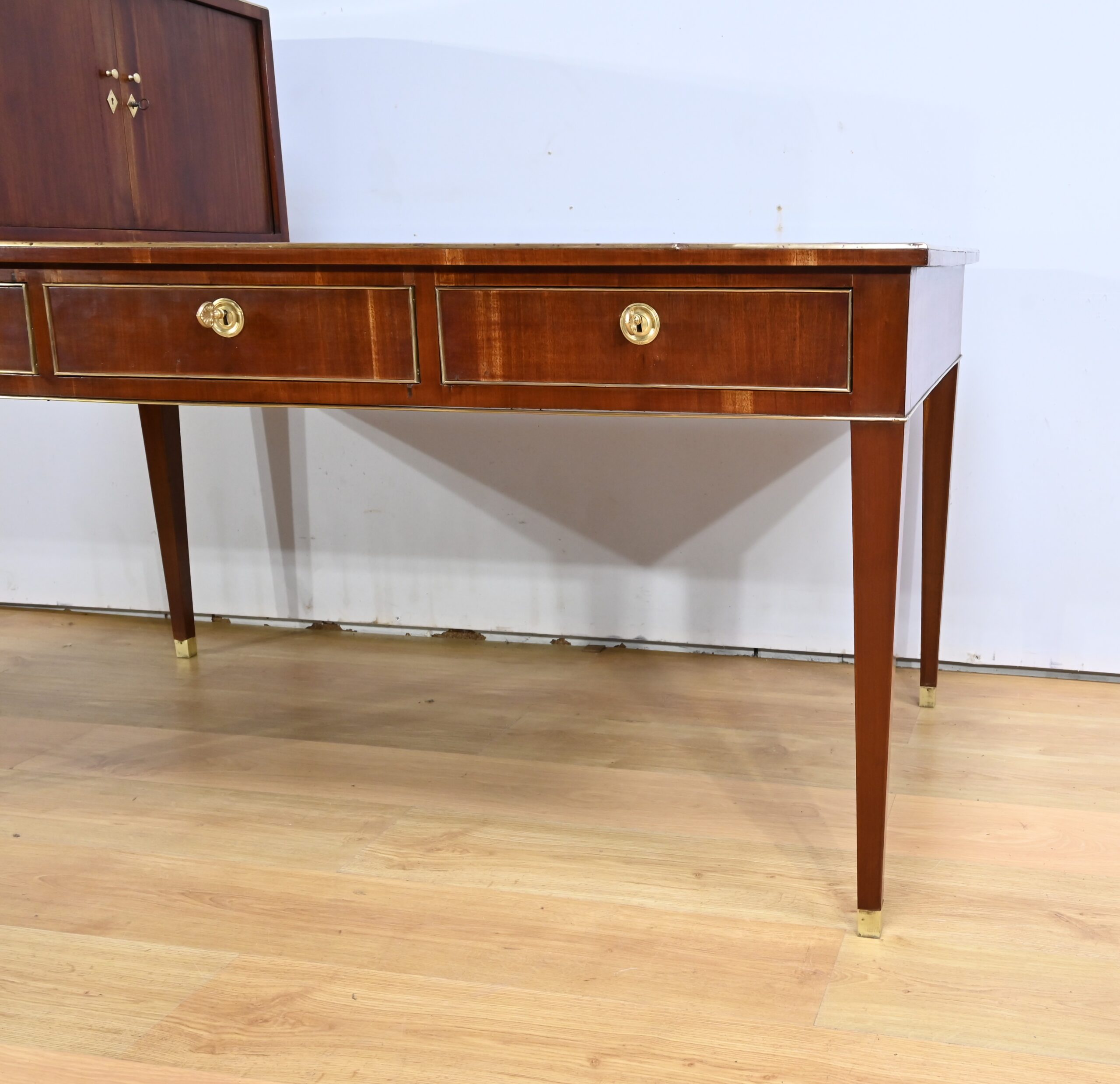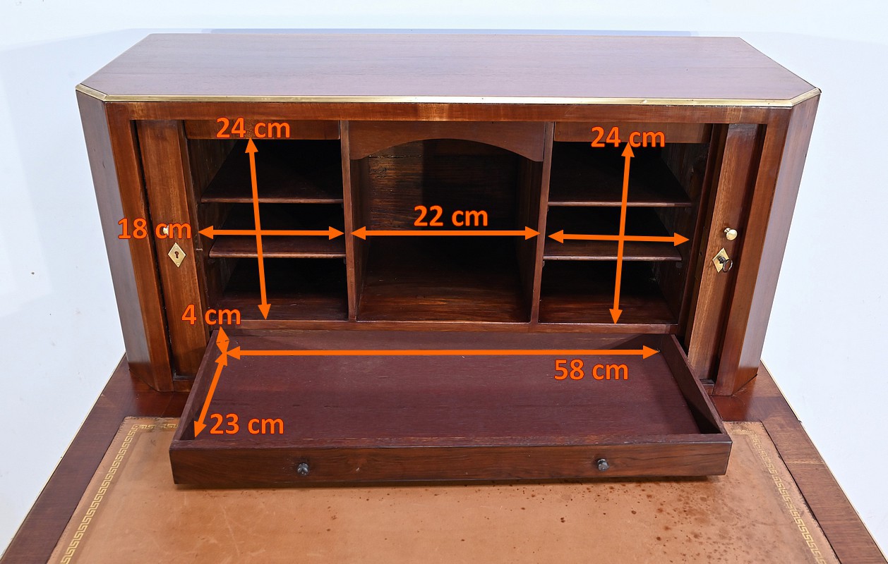 Bureau Directoire ouvrant par trois tiroirs identiques en ceinture. Ces derniers sont pourvus de serrures en état de fonctionnement avec clé pique et entrée circulaire en bronze doré. Les pieds gaines fuselés se terminent par des sabots sobres. Le pourtour du bureau est doté de baguettes en laiton soulignant également la ceinture et les façades des tiroirs. La façade opposée du bureau est munie de trois faux tiroirs. Le dessus de ce meuble est garni d’un cuir épais avec vignette dorée. Ce bureau a la particularité d’être composé d’un cartonnier à rideaux découvrant niches et tiroir, apportant fonctionnalité et originalité à ce meuble.