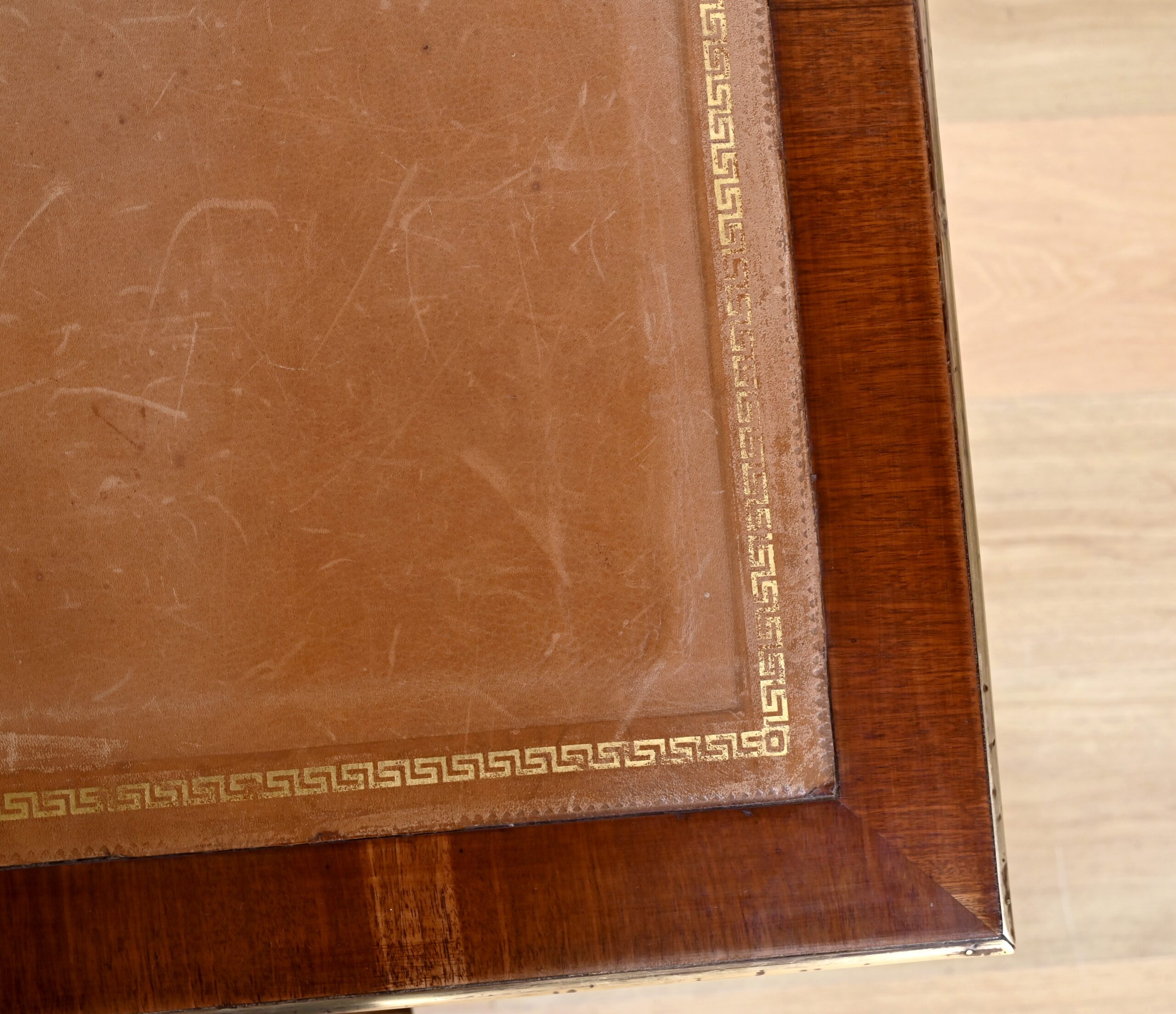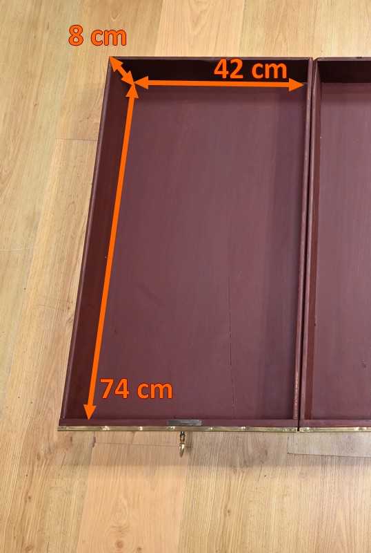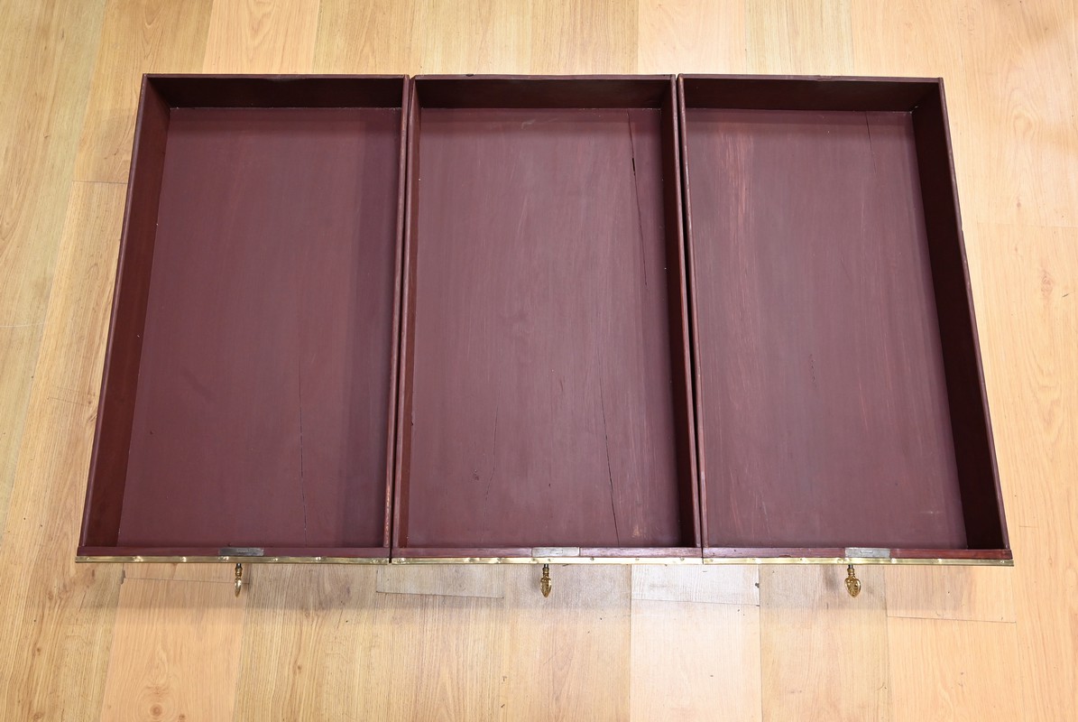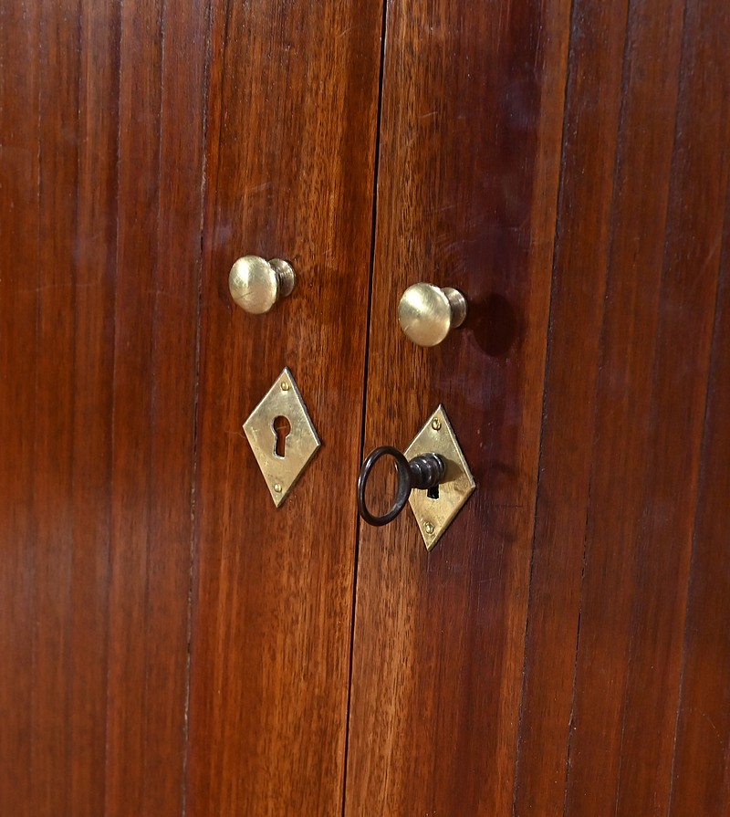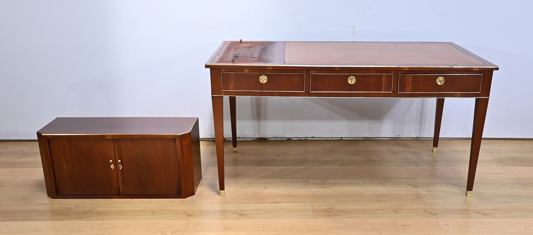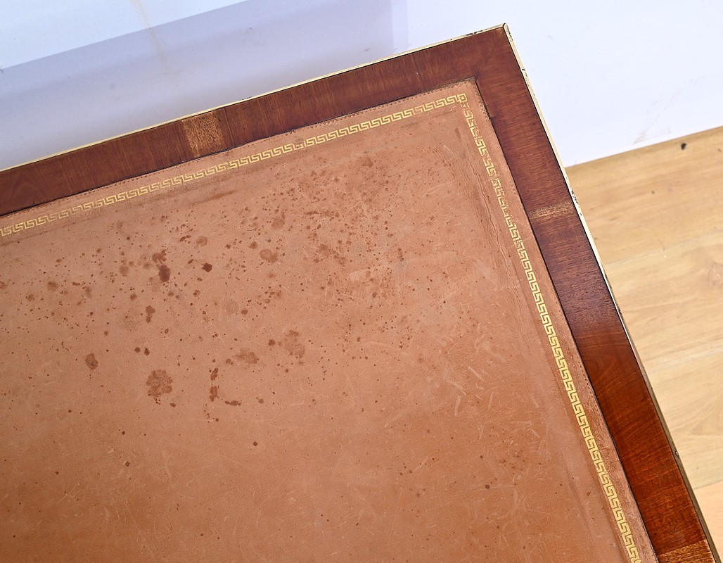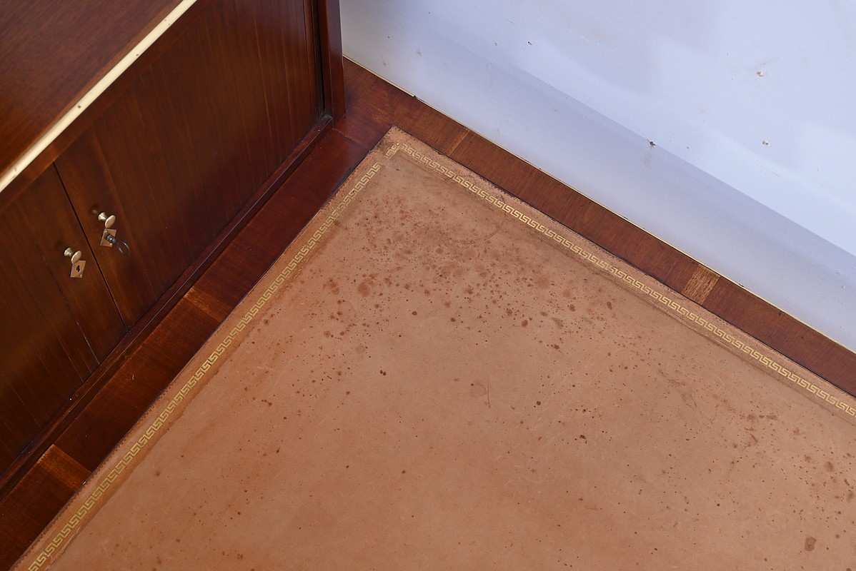 Bureau Directoire ouvrant par trois tiroirs identiques en ceinture. Ces derniers sont pourvus de serrures en état de fonctionnement avec clé pique et entrée circulaire en bronze doré. Les pieds gaines fuselés se terminent par des sabots sobres. Le pourtour du bureau est doté de baguettes en laiton soulignant également la ceinture et les façades des tiroirs. La façade opposée du bureau est munie de trois faux tiroirs. Le dessus de ce meuble est garni d’un cuir épais avec vignette dorée. Ce bureau a la particularité d’être composé d’un cartonnier à rideaux découvrant niches et tiroir, apportant fonctionnalité et originalité à ce meuble.