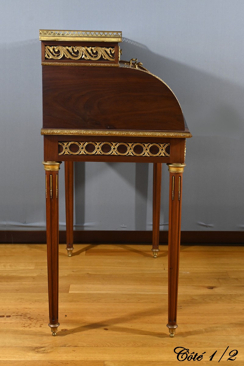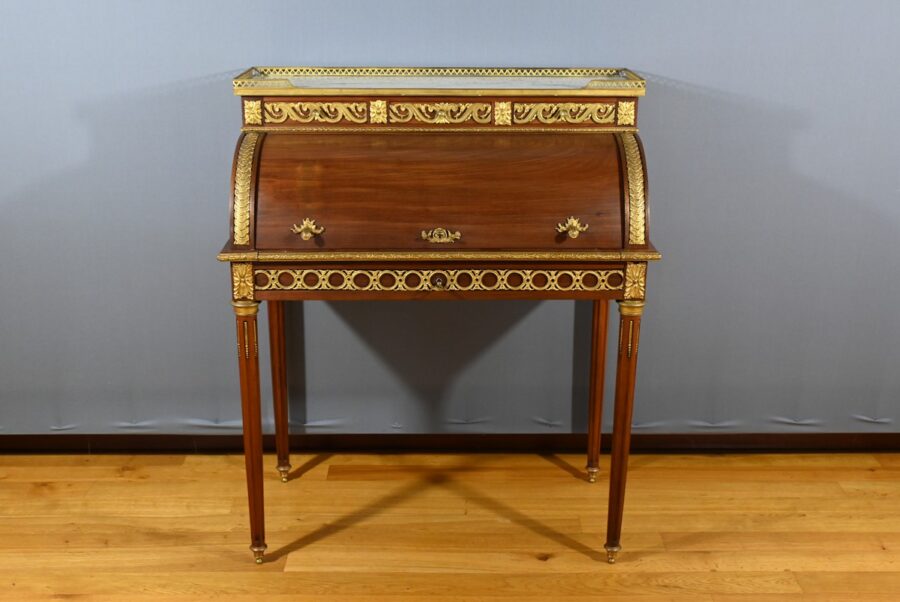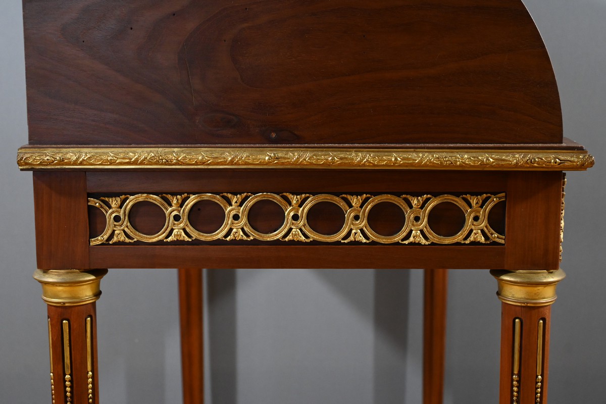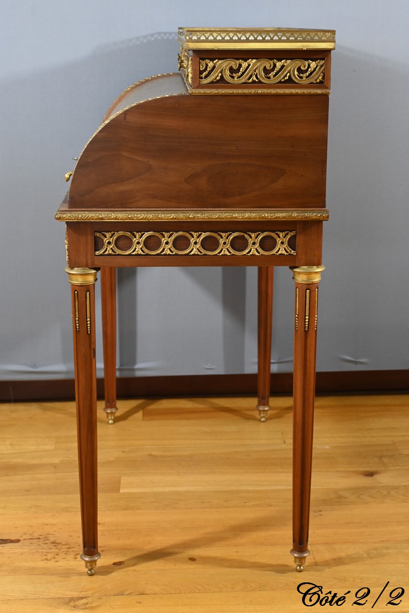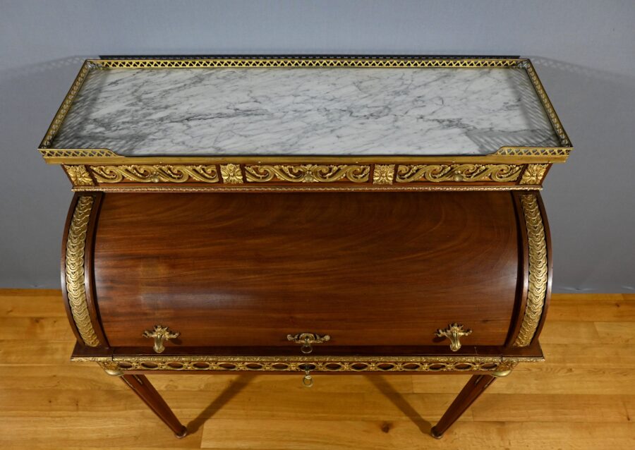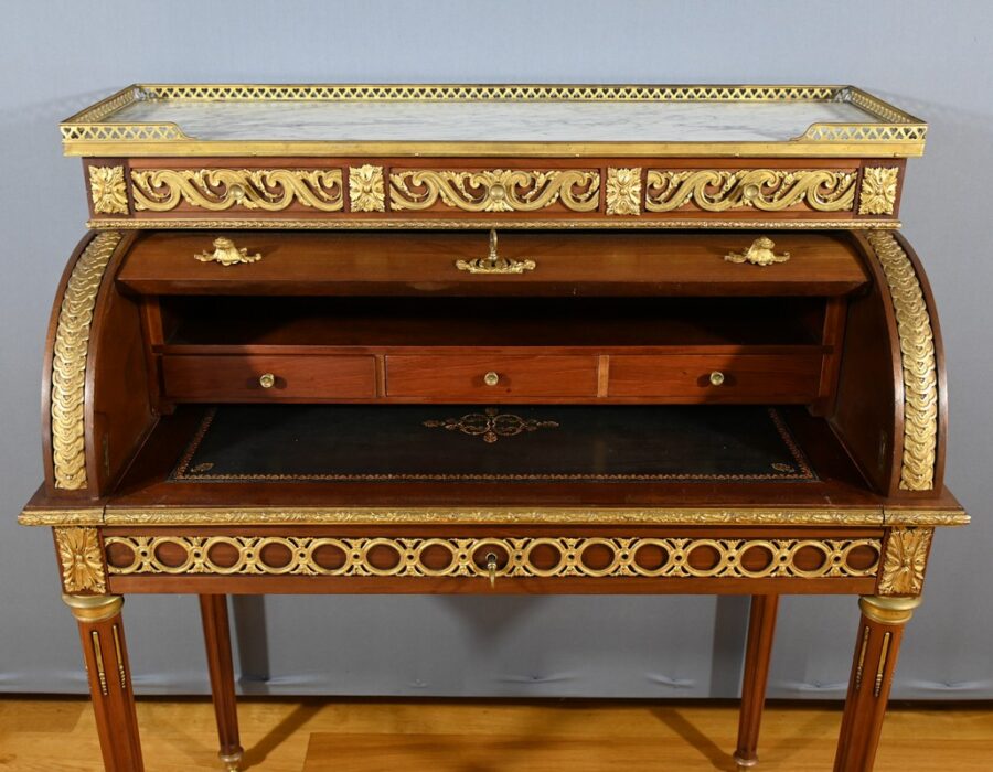 Ce petit bureau à cylindre de style Louis XVI en placage d’acajou est une pièce d’exception, alliant élégance et fonctionnalité.