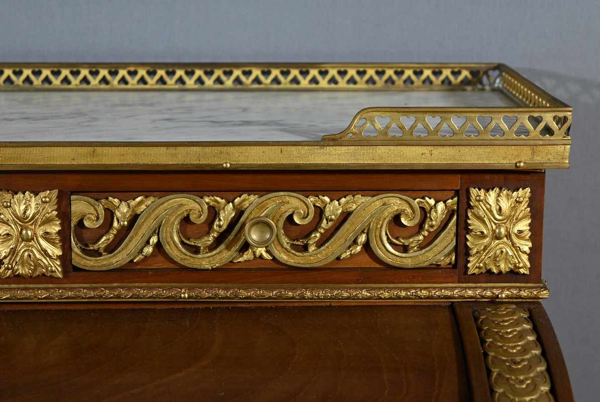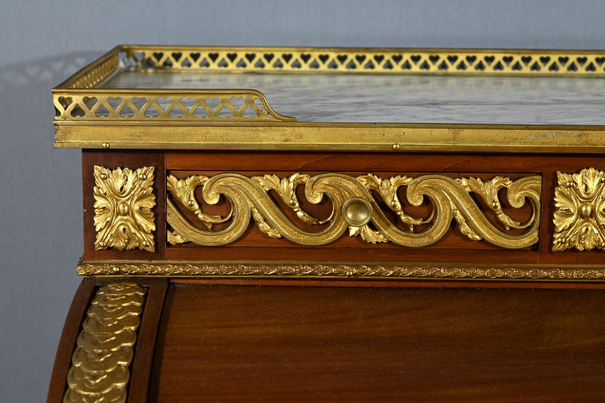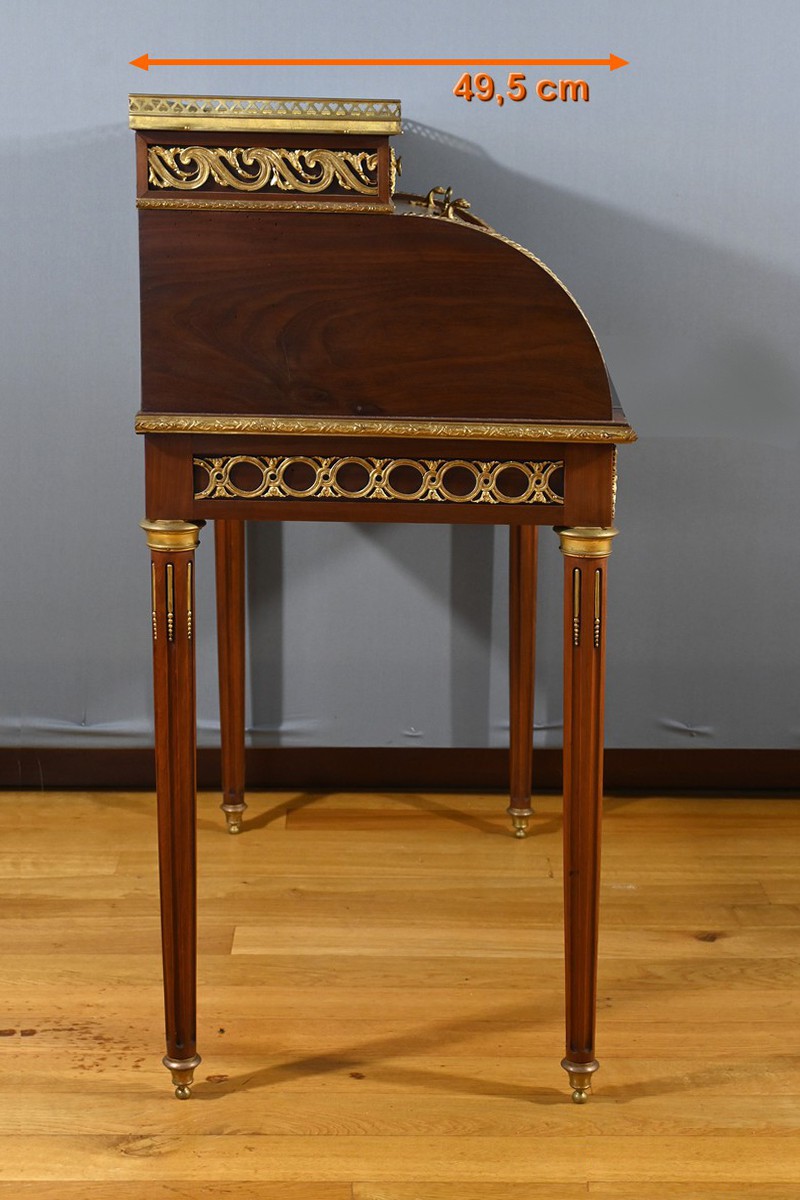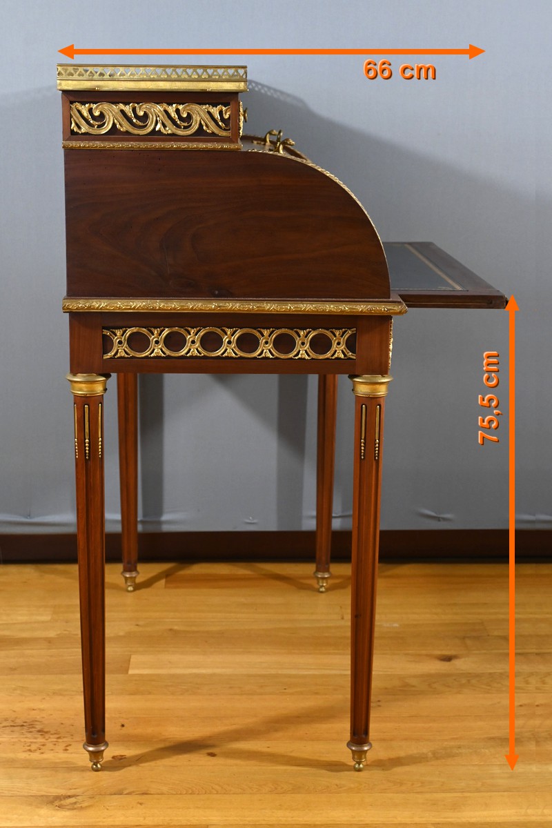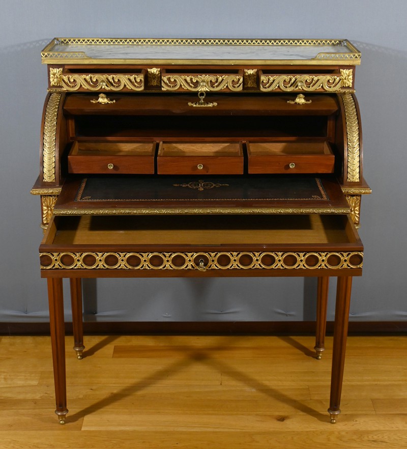 Ce petit bureau à cylindre de style Louis XVI en placage d’acajou est une pièce d’exception, alliant élégance et fonctionnalité.