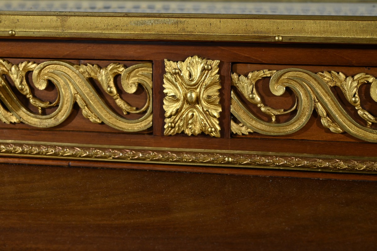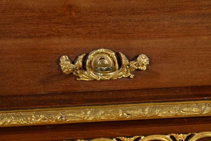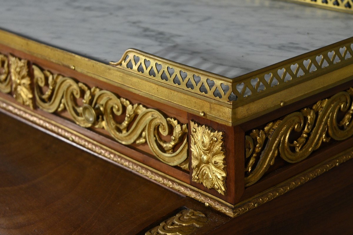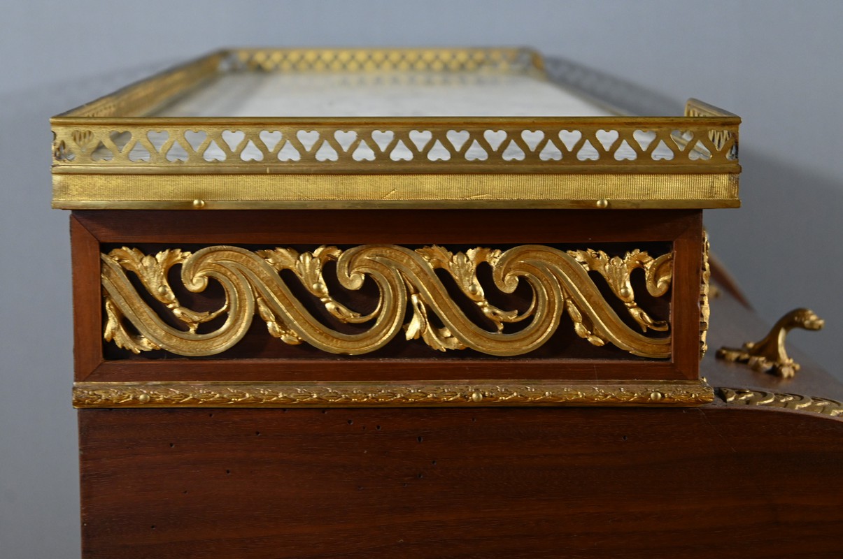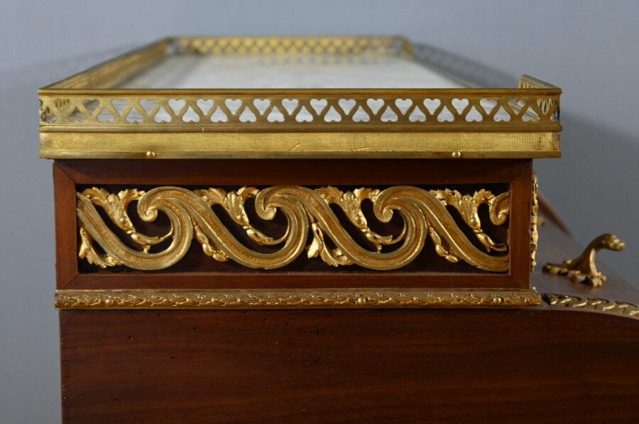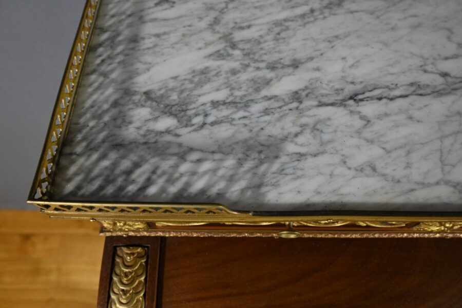 Le dessus en marbre blanc veiné de gris, ceinturé d’une galerie de laiton ajouré, ajoute une touche de sophistication et de raffinement à l’ensemble.