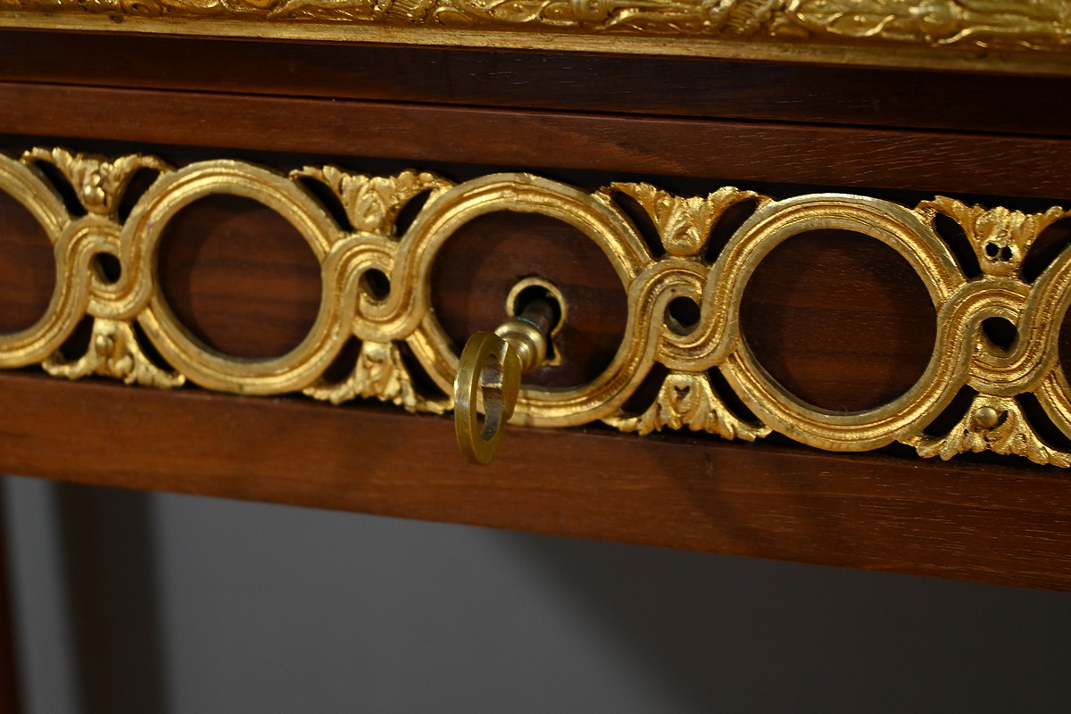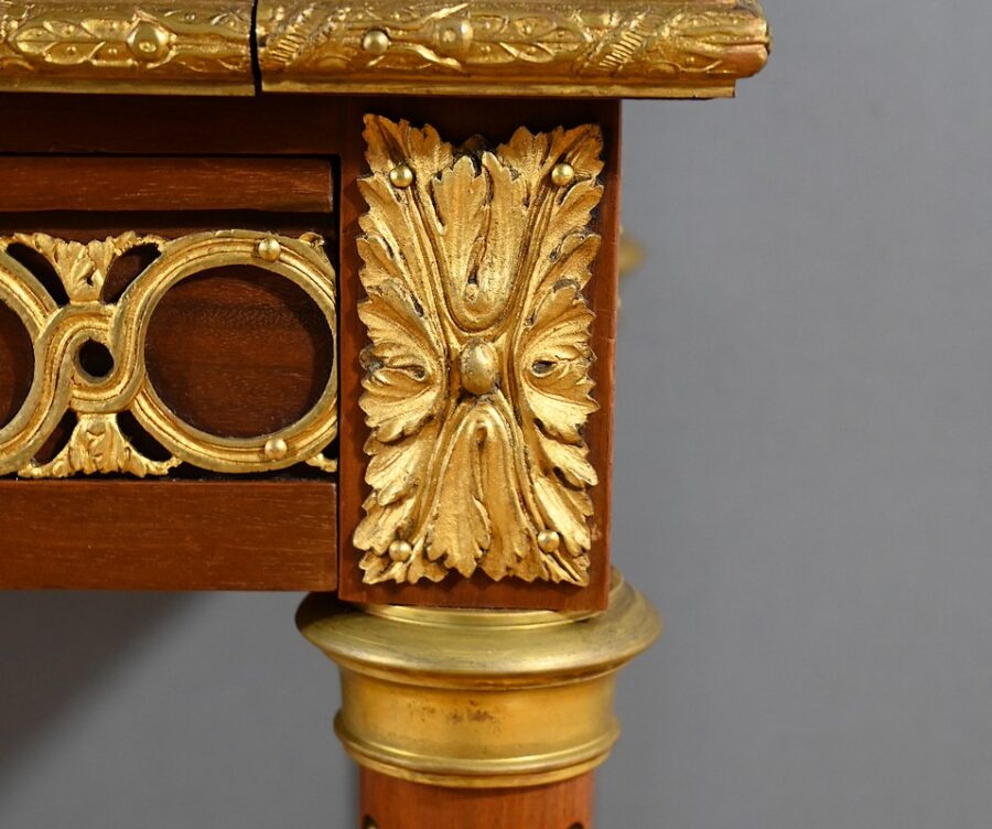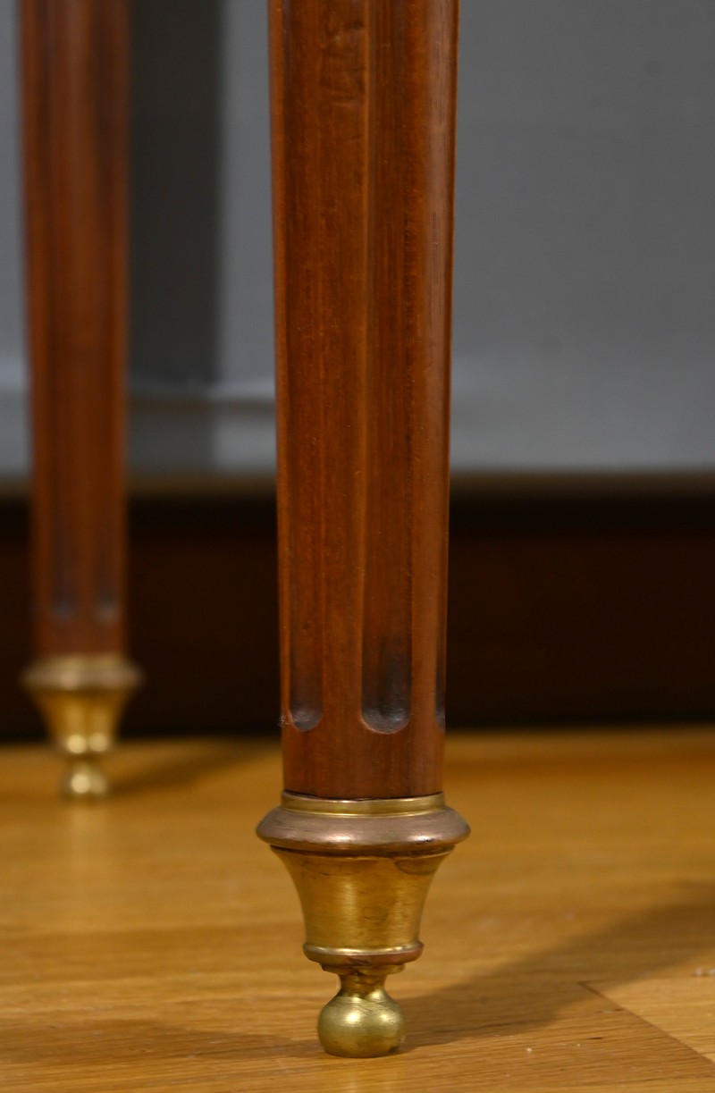 Le piètement fuselé à cannelures rudentées, terminé par des sabots de bronze, témoigne de l’artisanat exceptionnel de l’époque Louis XVI.