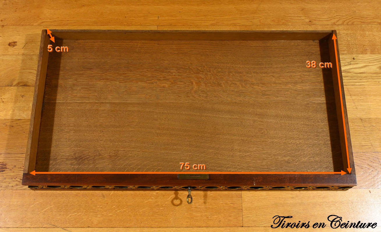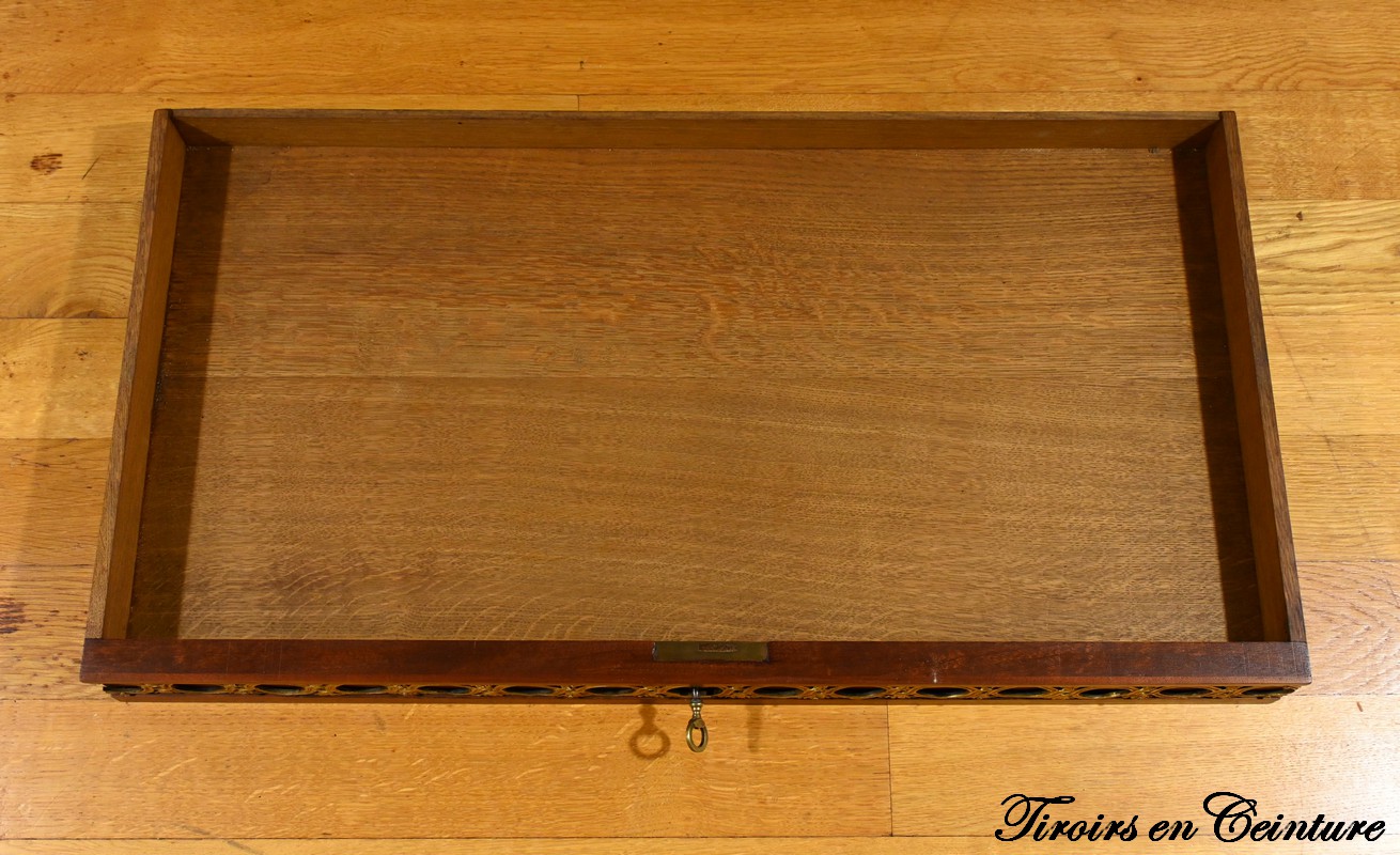 Il s’ouvre par un cylindre, un tiroir en ceinture et trois petits tiroirs en partie supérieure, offrant un espace de rangement pratique pour les documents et les objets personnels.