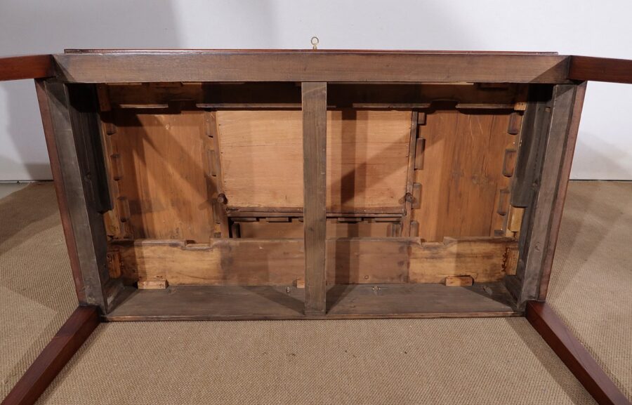Au fond, se situent quatre tiroirs identiques munis d’une façade en loupe d’érable agrémentée d’un bouton en acajou. En dessous, quatre faux tiroirs avec une façade identique apparaissent à l’ouverture de la tablette d’écriture. Nous retrouvons également huit niches en acajou.