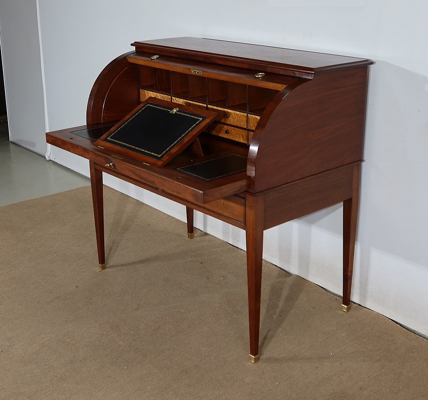 Ce bureau cylindre Directoire possède des côtés épurés soulignés par un jonc.