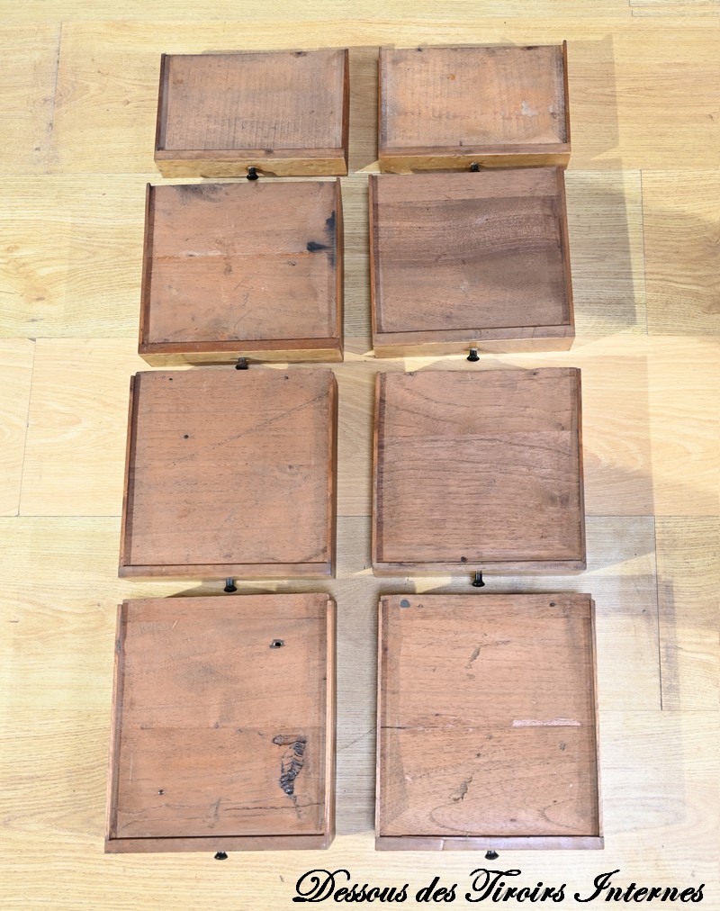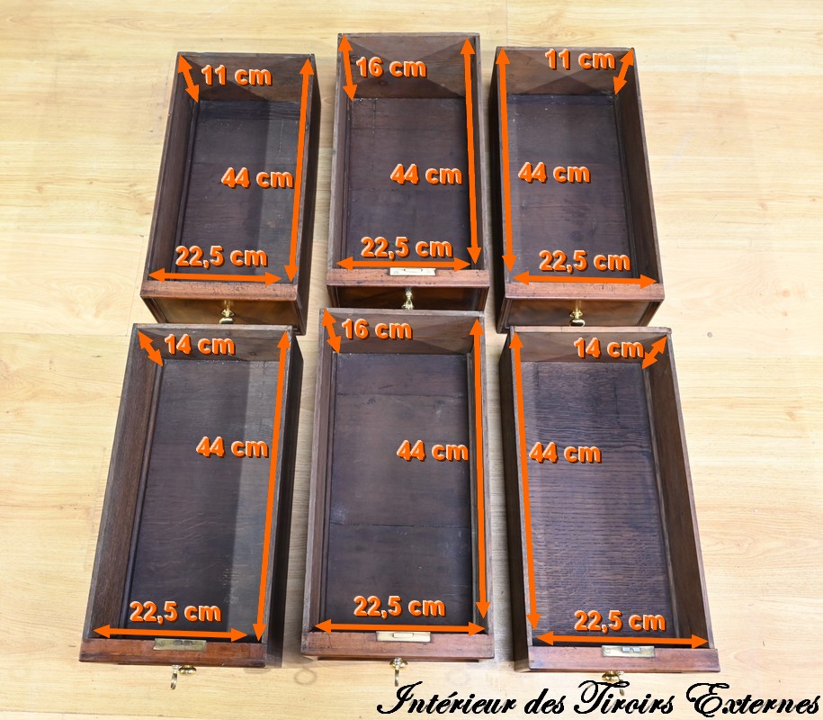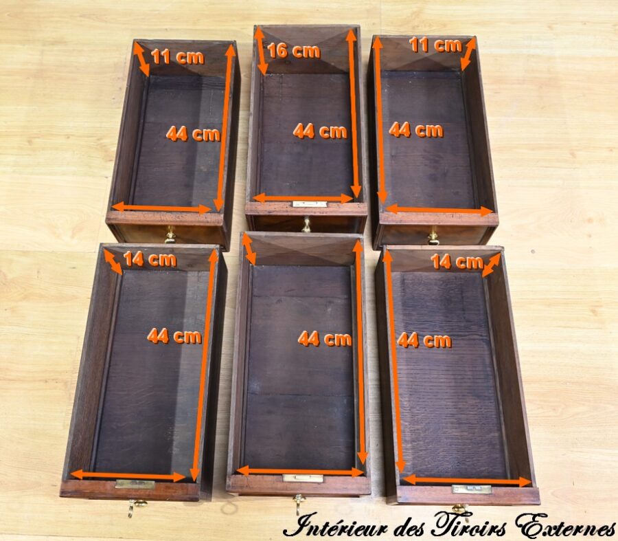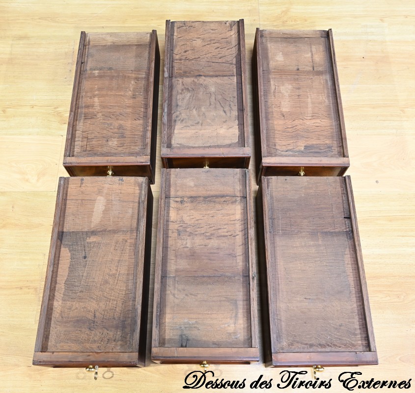Ces 6 tiroirs, dont 4 présentent des serrures d’origine avec entrées filet et clés ajustées, sont munis de boutons ronds à cuvette en laiton