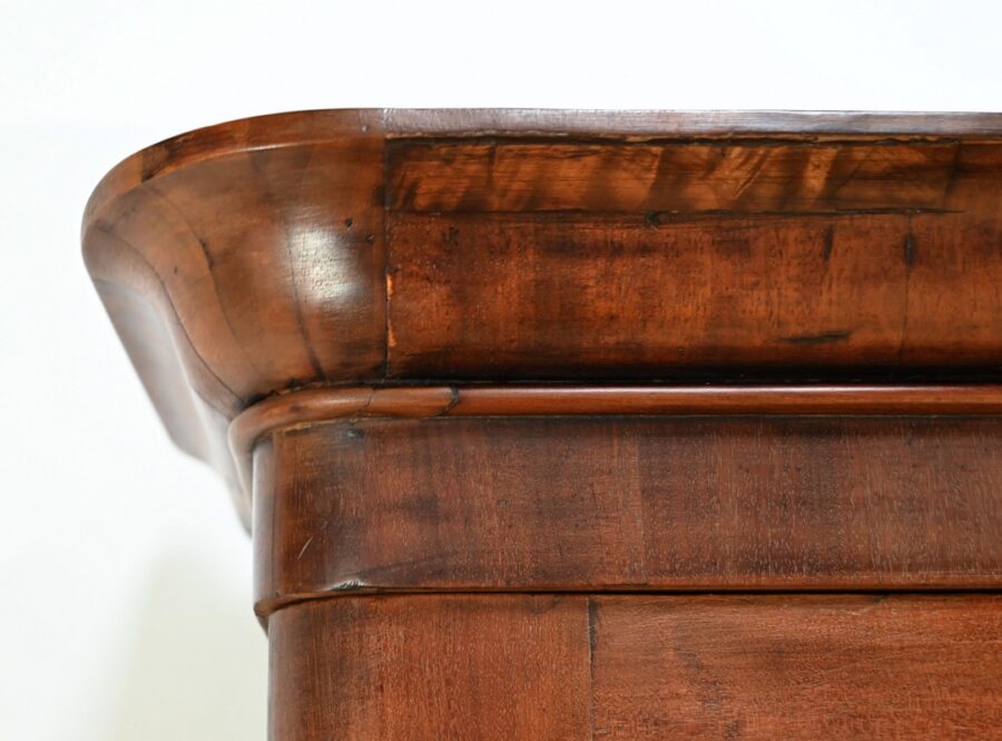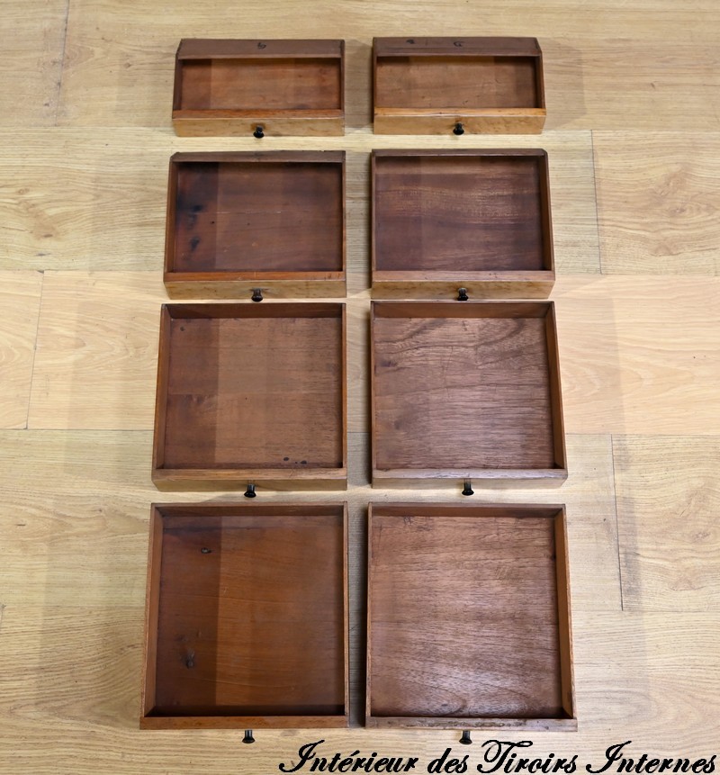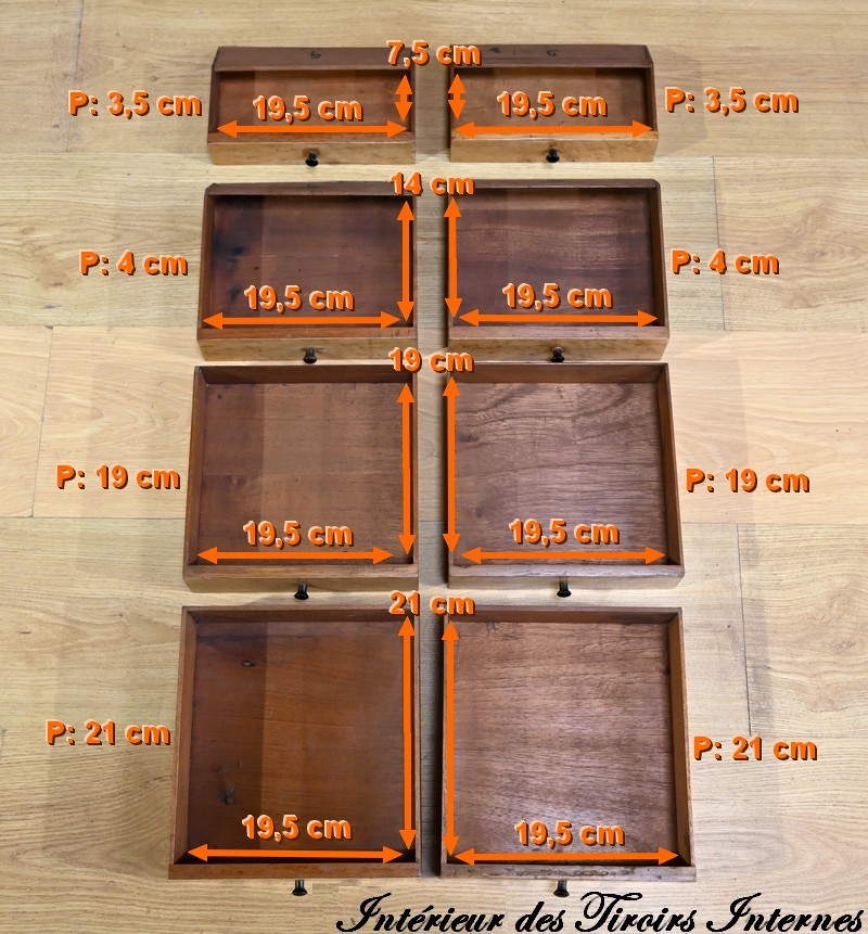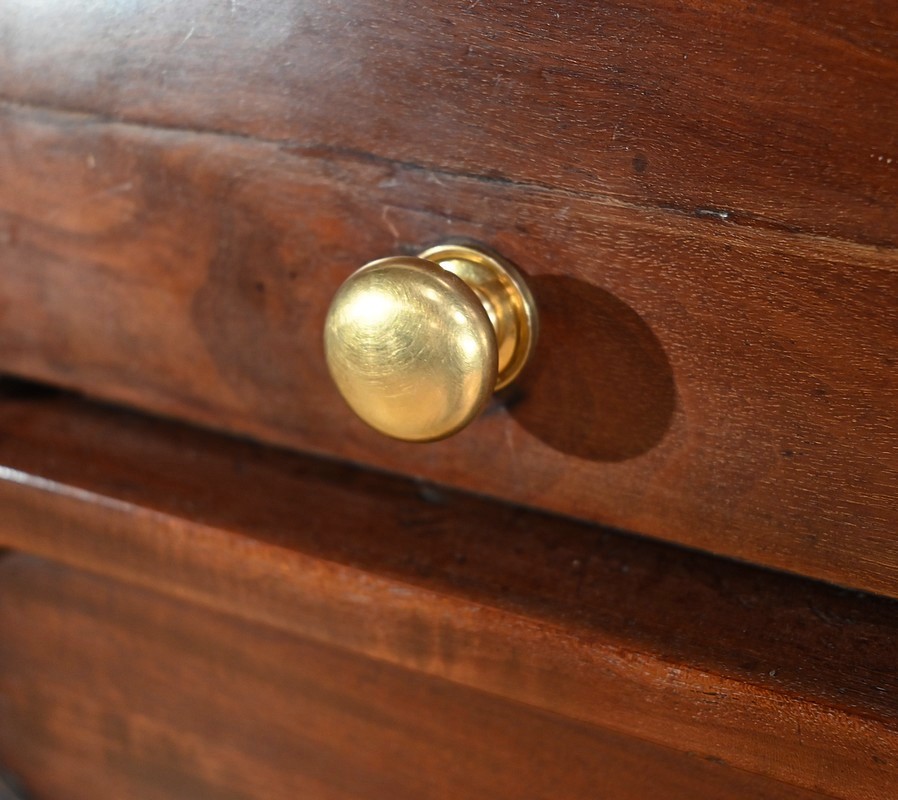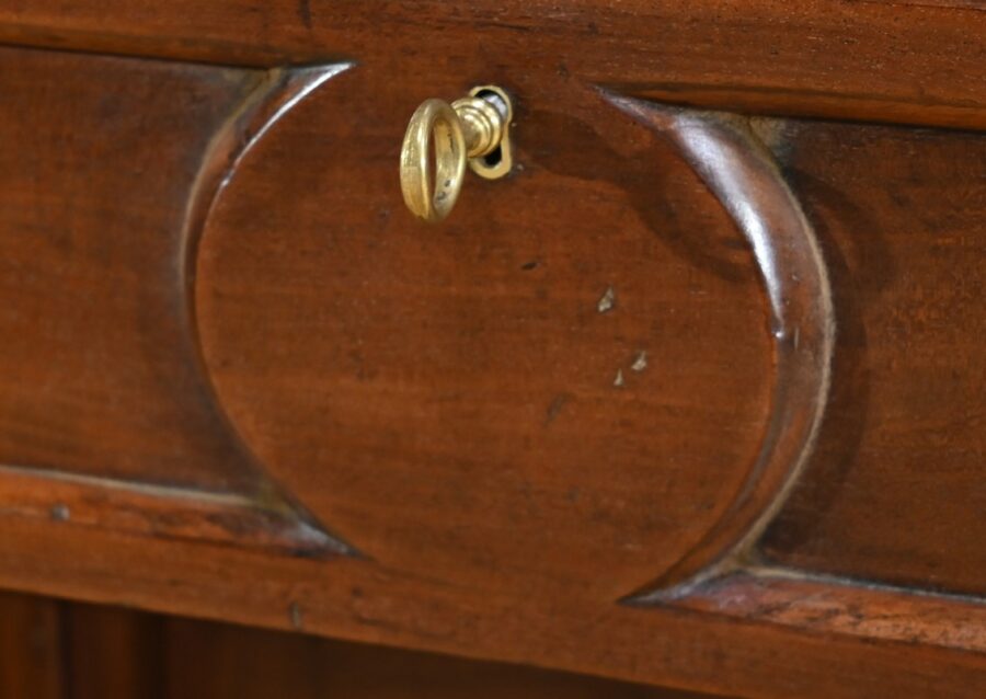 Ces 6 tiroirs, dont 4 présentent des serrures d’origine avec entrées filet et clés ajustées, sont munis de boutons ronds à cuvette en laiton