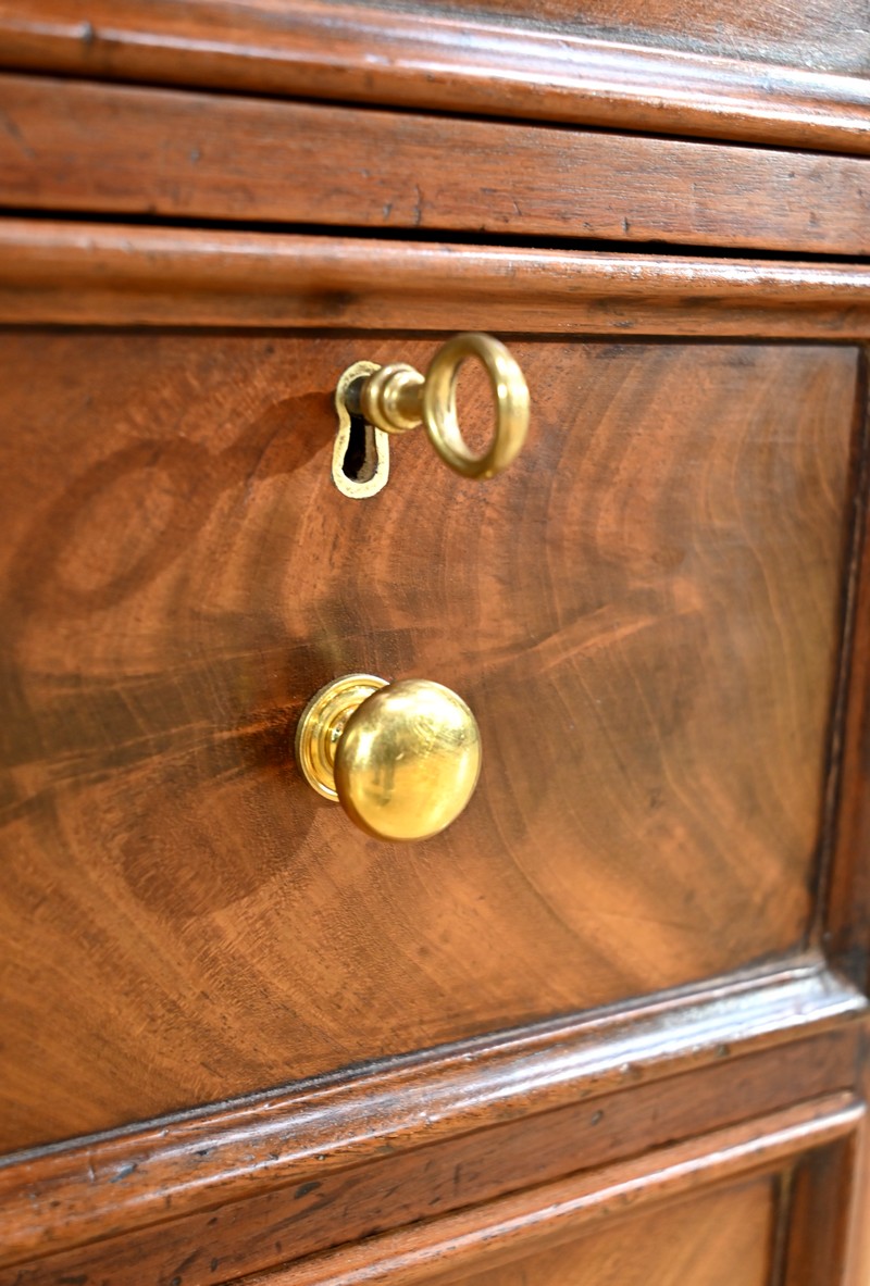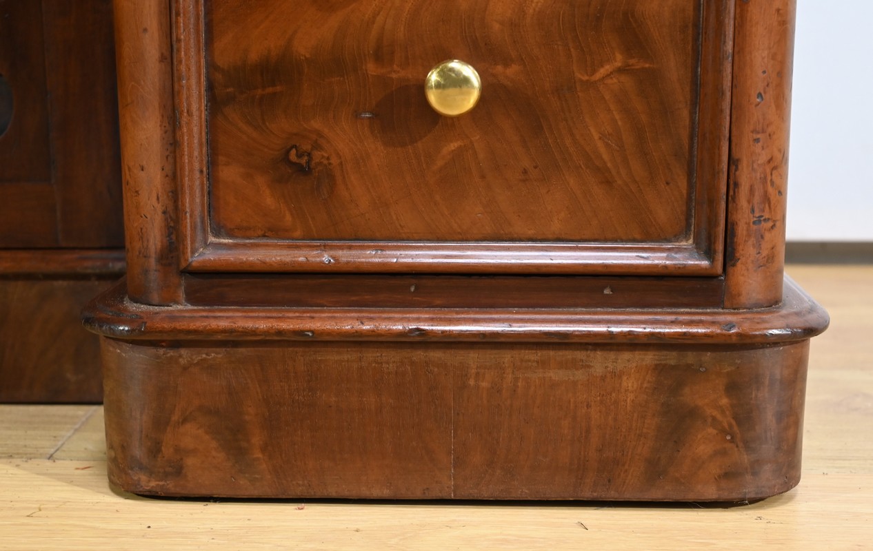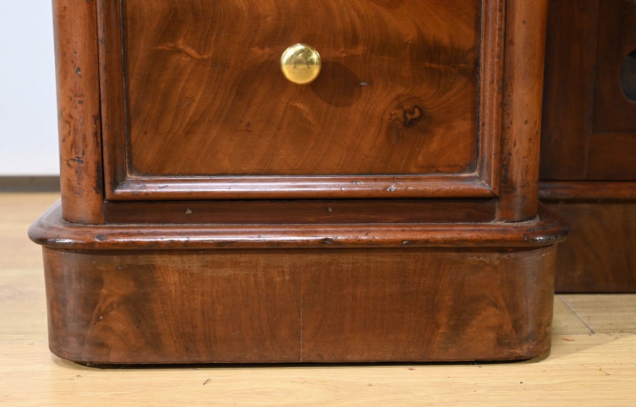 Ce meuble en acajou, comprend en partie basse deux caissons de 3 tiroirs de hauteurs différentes.