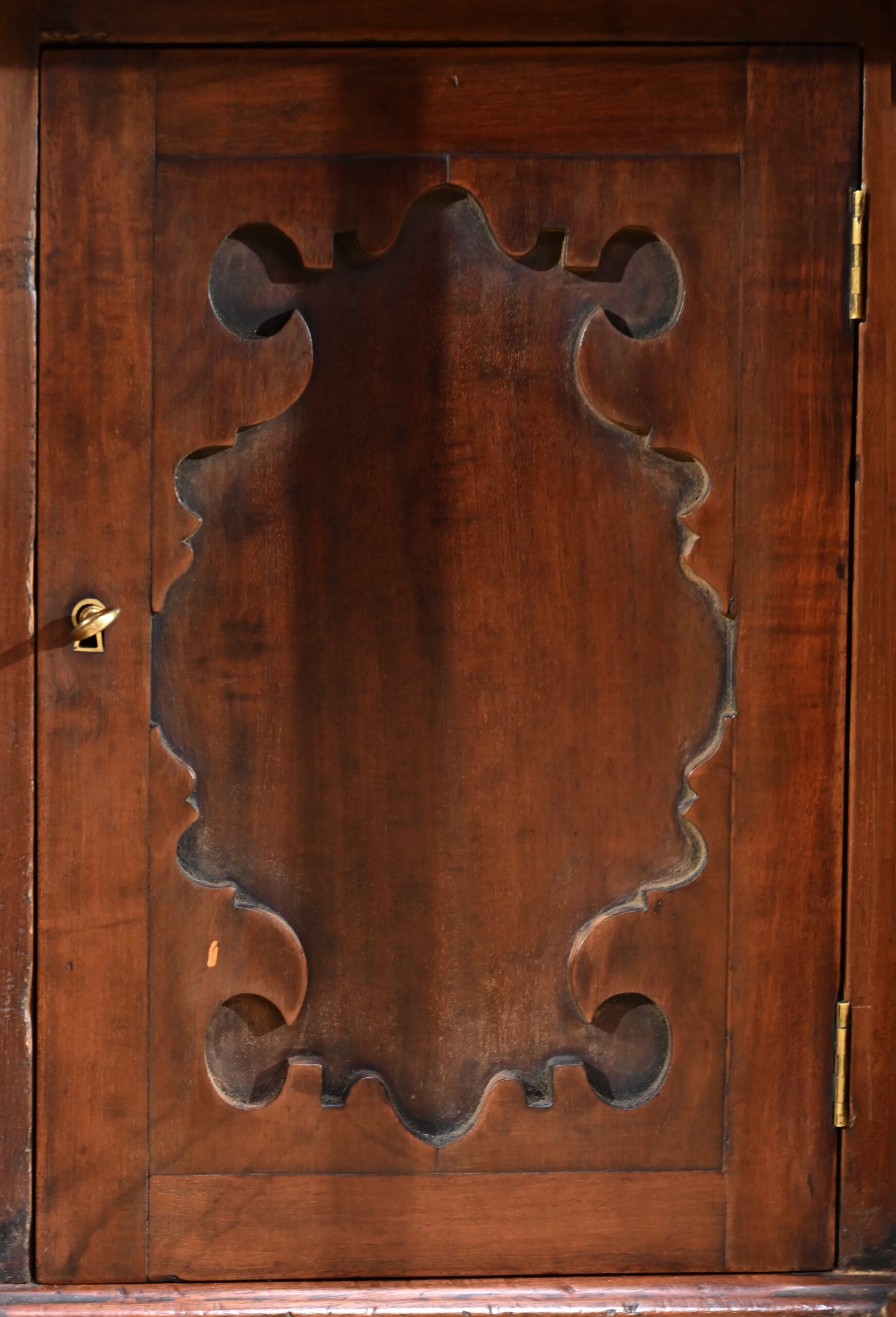 Le passage de jambe comporte une porte montée sur charnières avec panneau en retrait découpé et une serrure authentique en état de fonctionnement avec entrée et clé.