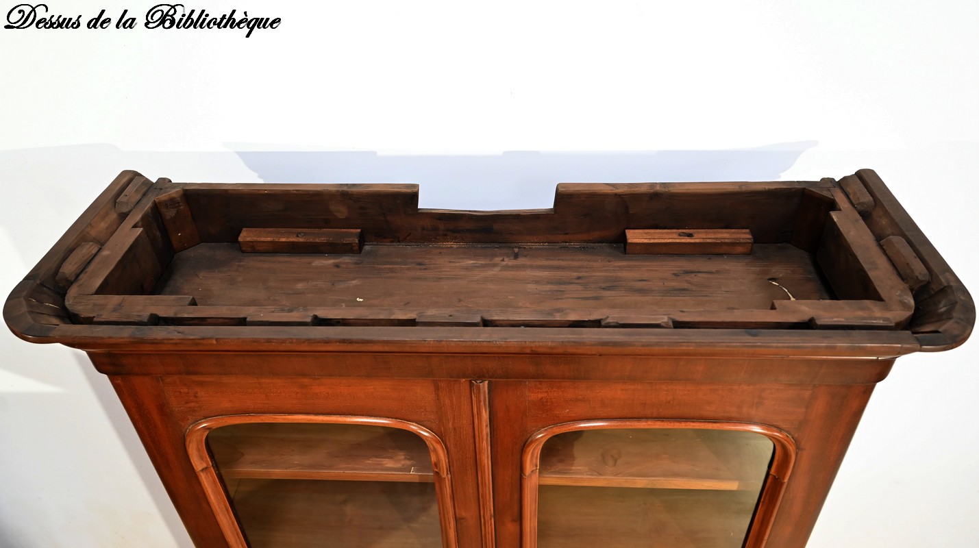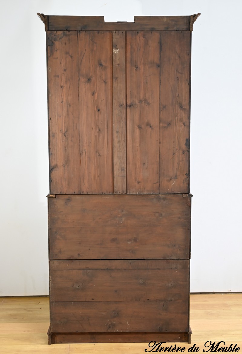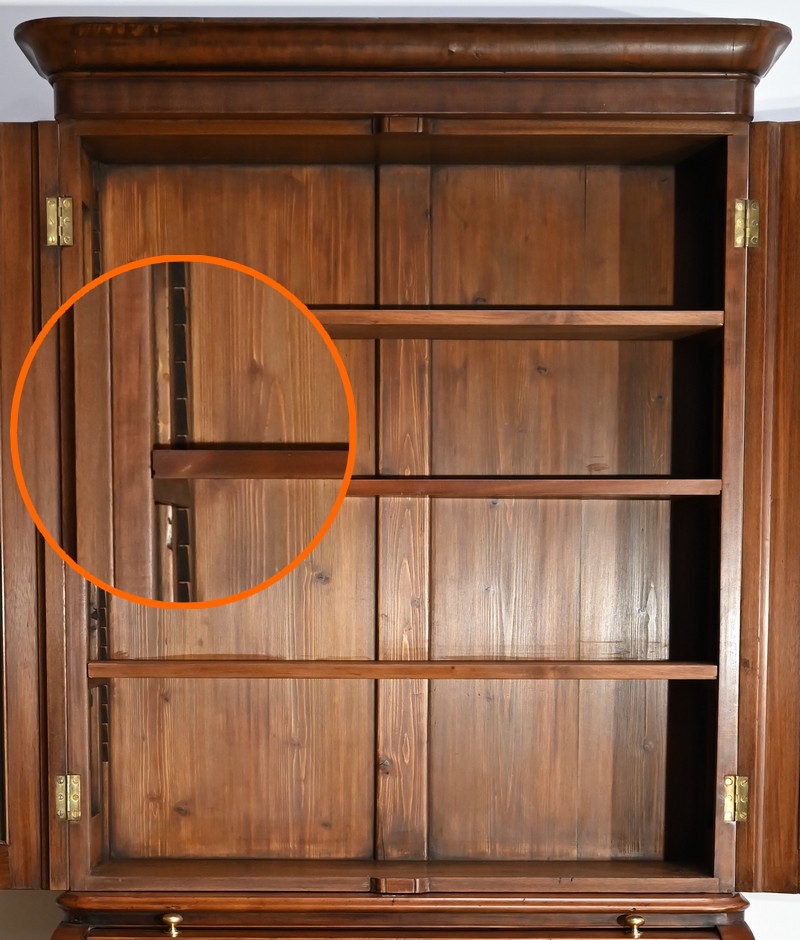 La partie bibliothèque de ce meuble, soulignée par une moulure intermédiaire, consiste en 2 portes, aux angles arrondis, flanquées de vitres avec moulures intérieures façon anse de panier.