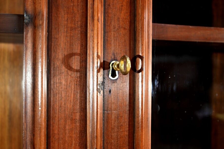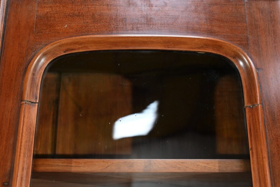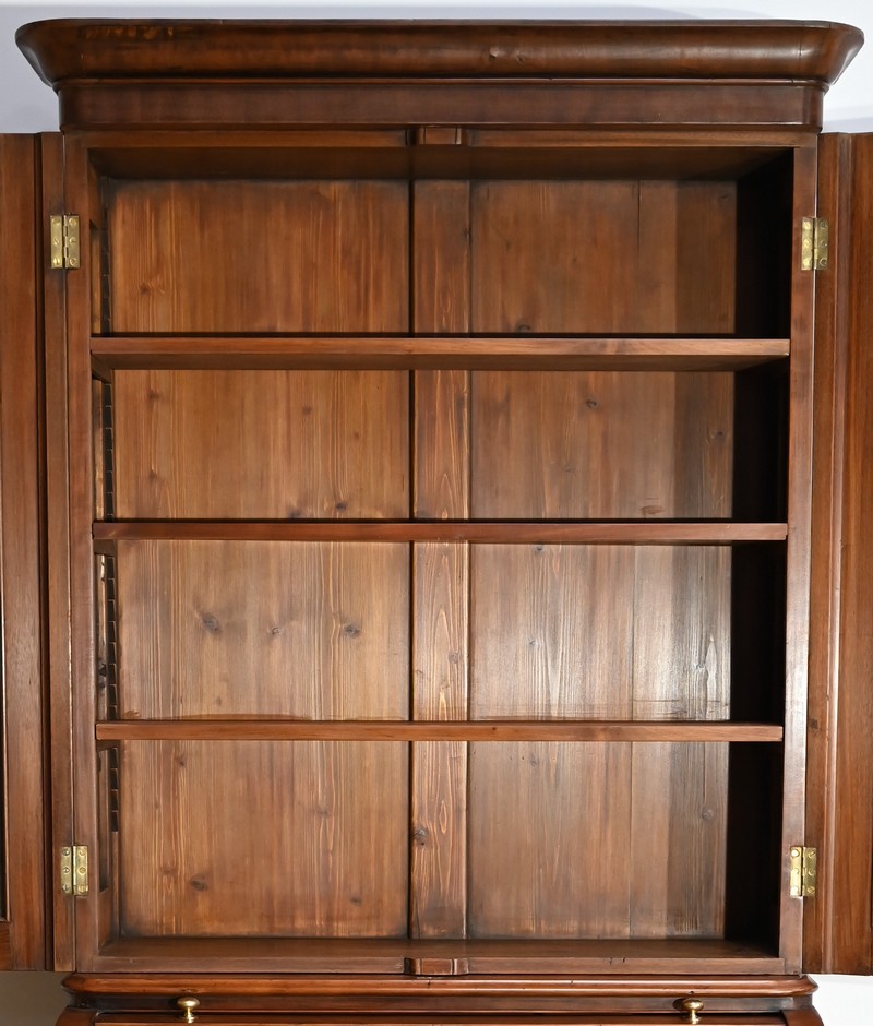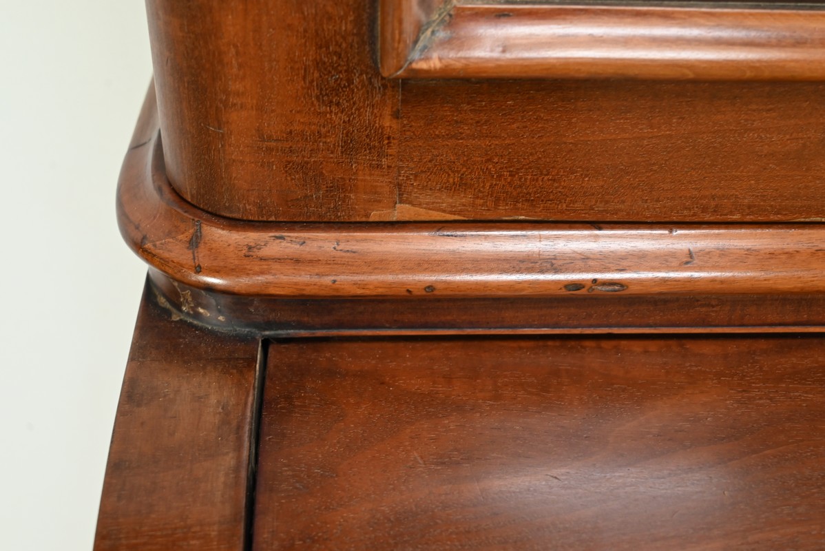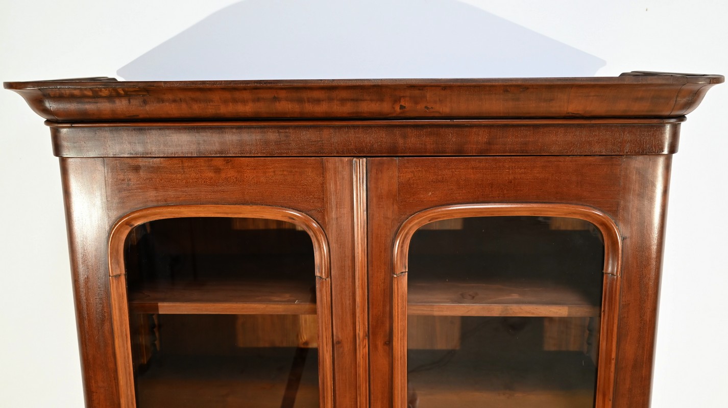 La partie bibliothèque de ce meuble, soulignée par une moulure intermédiaire, consiste en 2 portes, aux angles arrondis, flanquées de vitres avec moulures intérieures façon anse de panier.