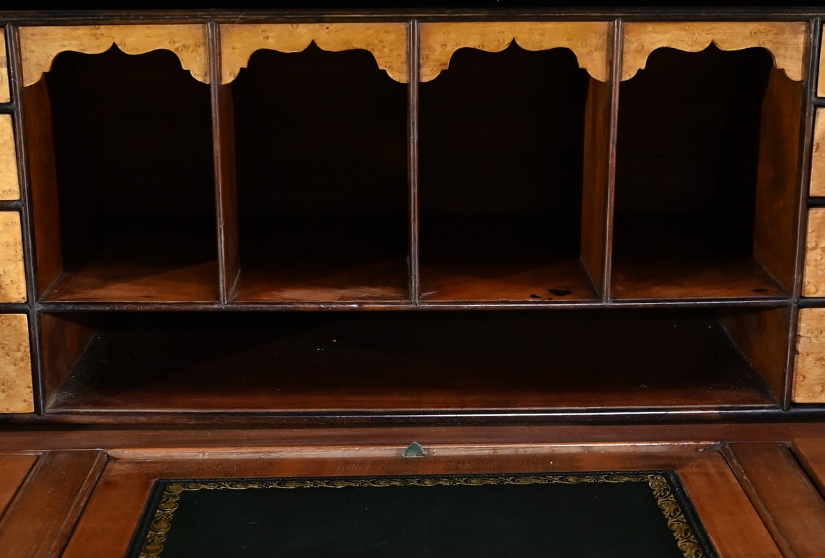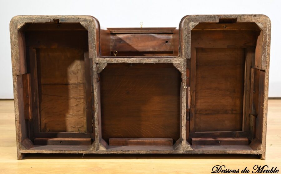 L’intérieur est agrémenté, de chaque côté, de 4 tiroirs en moucheté d’Erable avec boutons tournés en palissandre et d’une réserve à papier surmontée de 4 casiers à courriers.