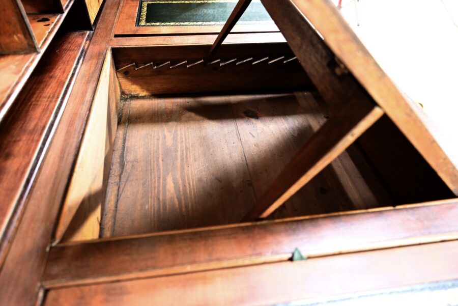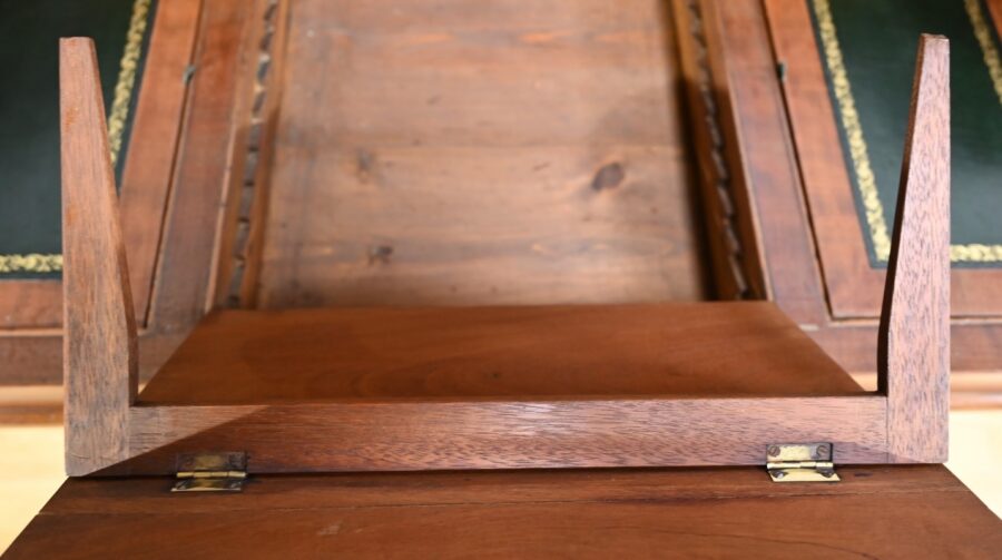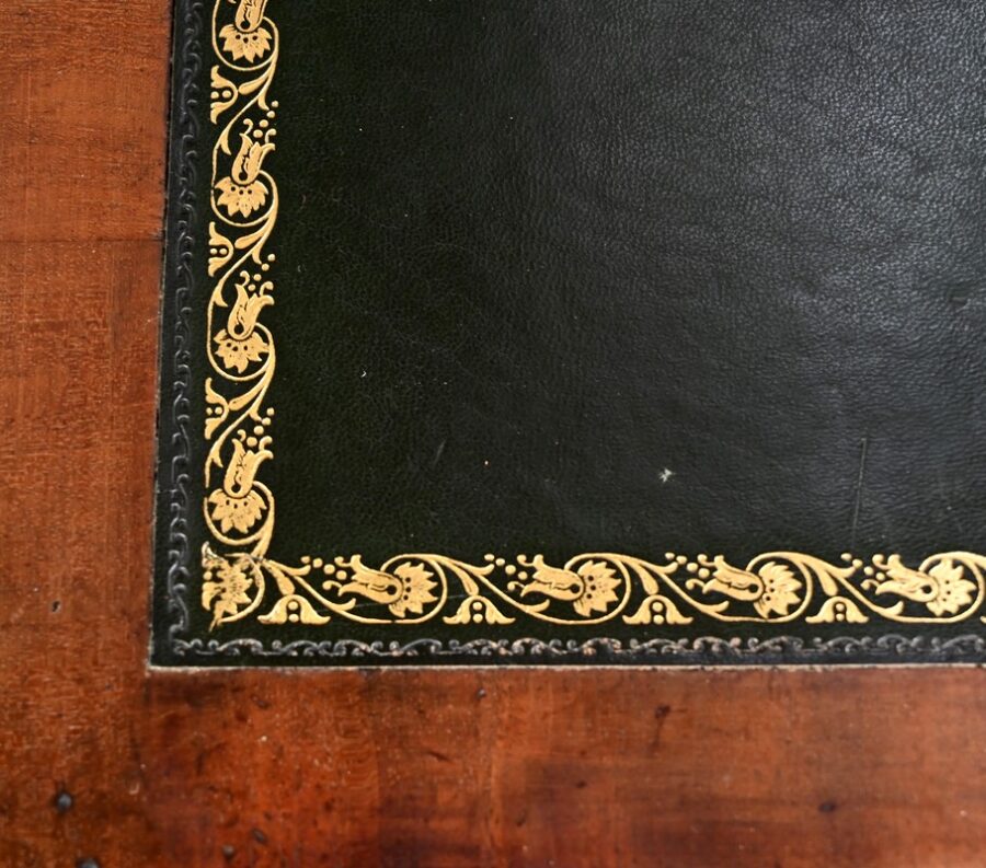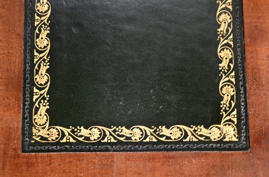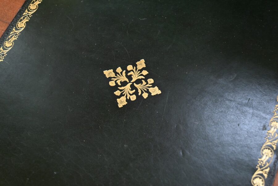 Ce tiroir, équipé d’une serrure authentique avec entrée et clé, laisse apparaître trois trappes, montées sur charnières, à cadre à coupe d’onglet recouvert de cuir vert avec vignette doré, et pour la plus grande, un motif central.
