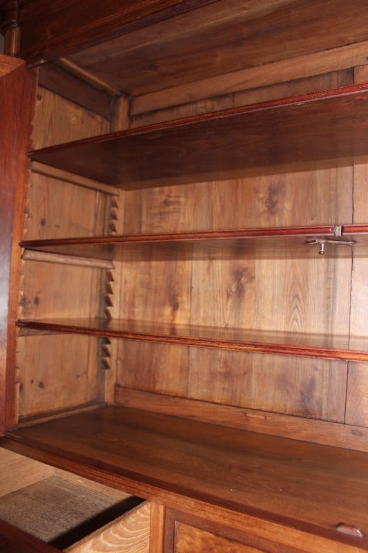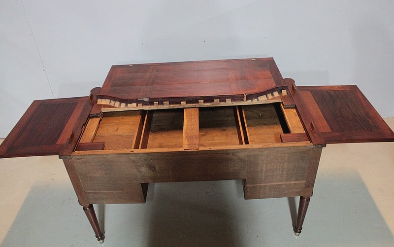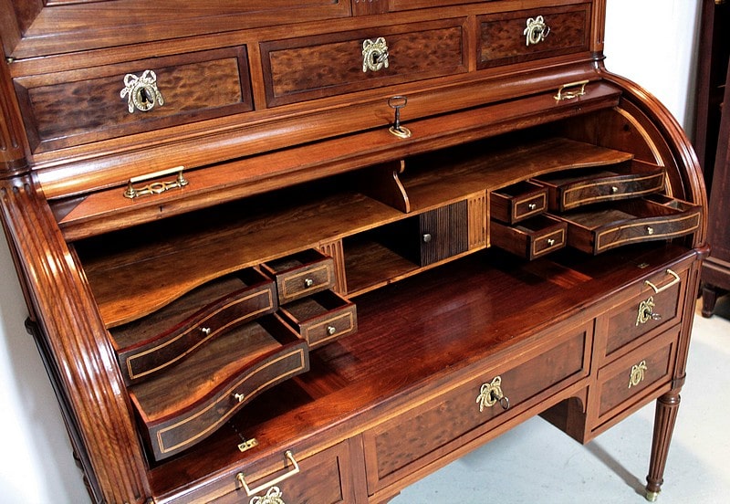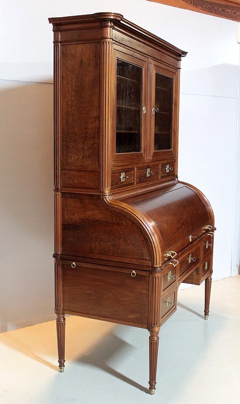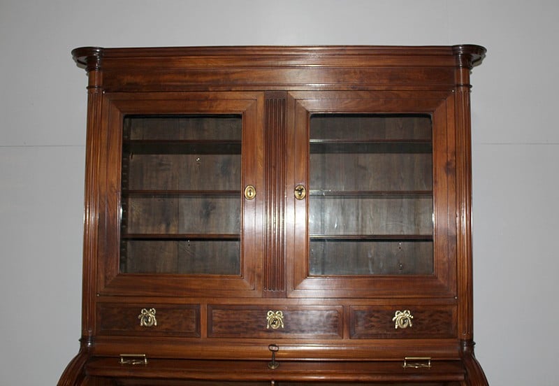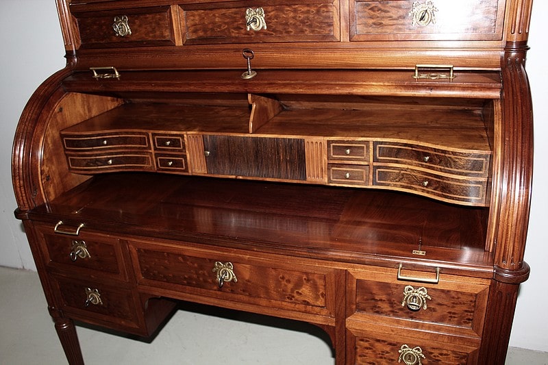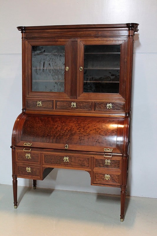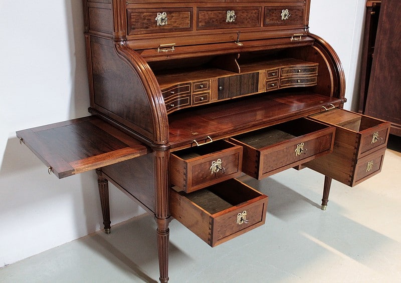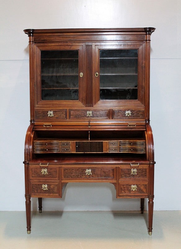 Il est composé de 3 éléments : une partie haute ouvrant à 2 portes vitrées (vitres d’origine) et 3 tiroirs, une partie cylindre dont l’intérieur est garni de 8 petits tiroirs et 1 casier ouvrant par une petite porte rideau, et enfin une partie bureau avec tablette centrale (de 118cm X 58cm) dont le fond est habillé de 5 faux tiroirs, et 2 tablettes latérales (de 55cm X 41cm), ouvrant en façade par 4 tiroirs dont un double à droite contenant un casier fermant à clé.