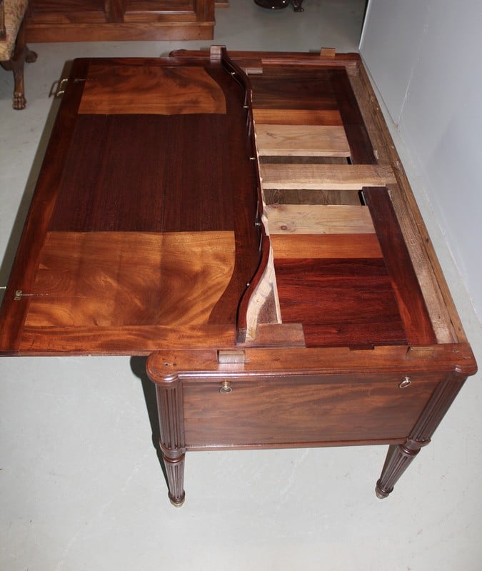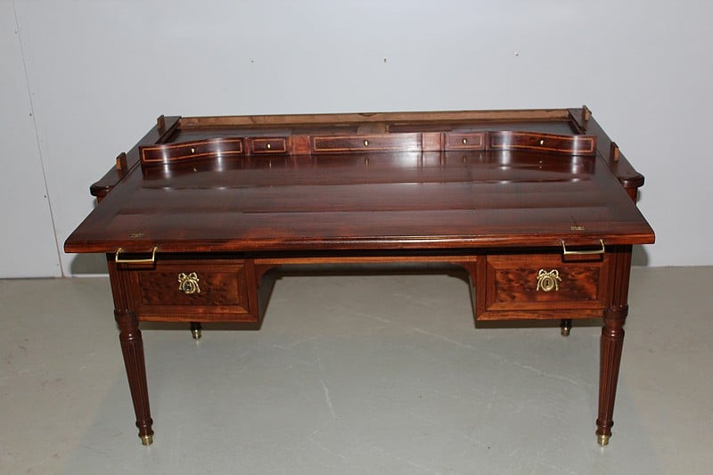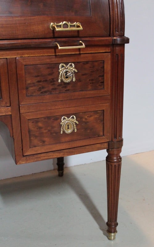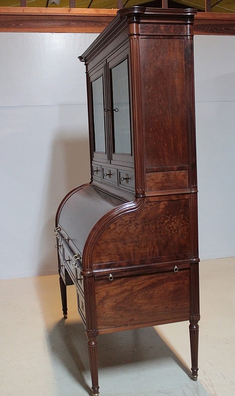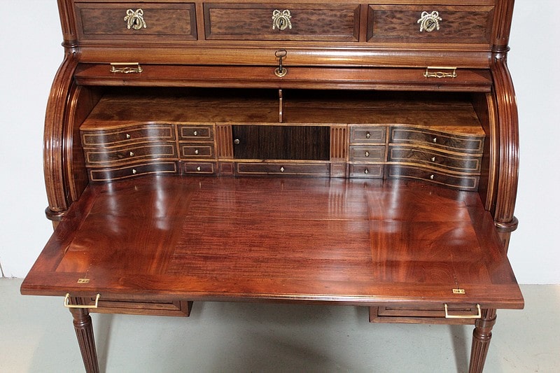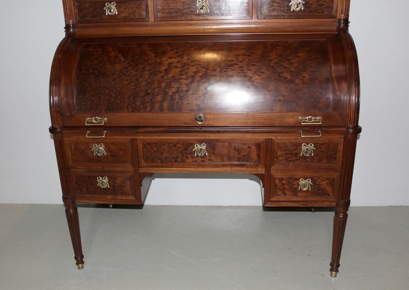 Grand Bureau à cylindre Louis XVI en Acajou de Cuba massif et placage d’acajou moucheté sur acajou massif pour les tiroirs. Il forme bibliothèque, garnie de 3 étagères sur crémaillères, et repose sur 4 pieds fuselés et cannelés terminés par des sabots de bronze.