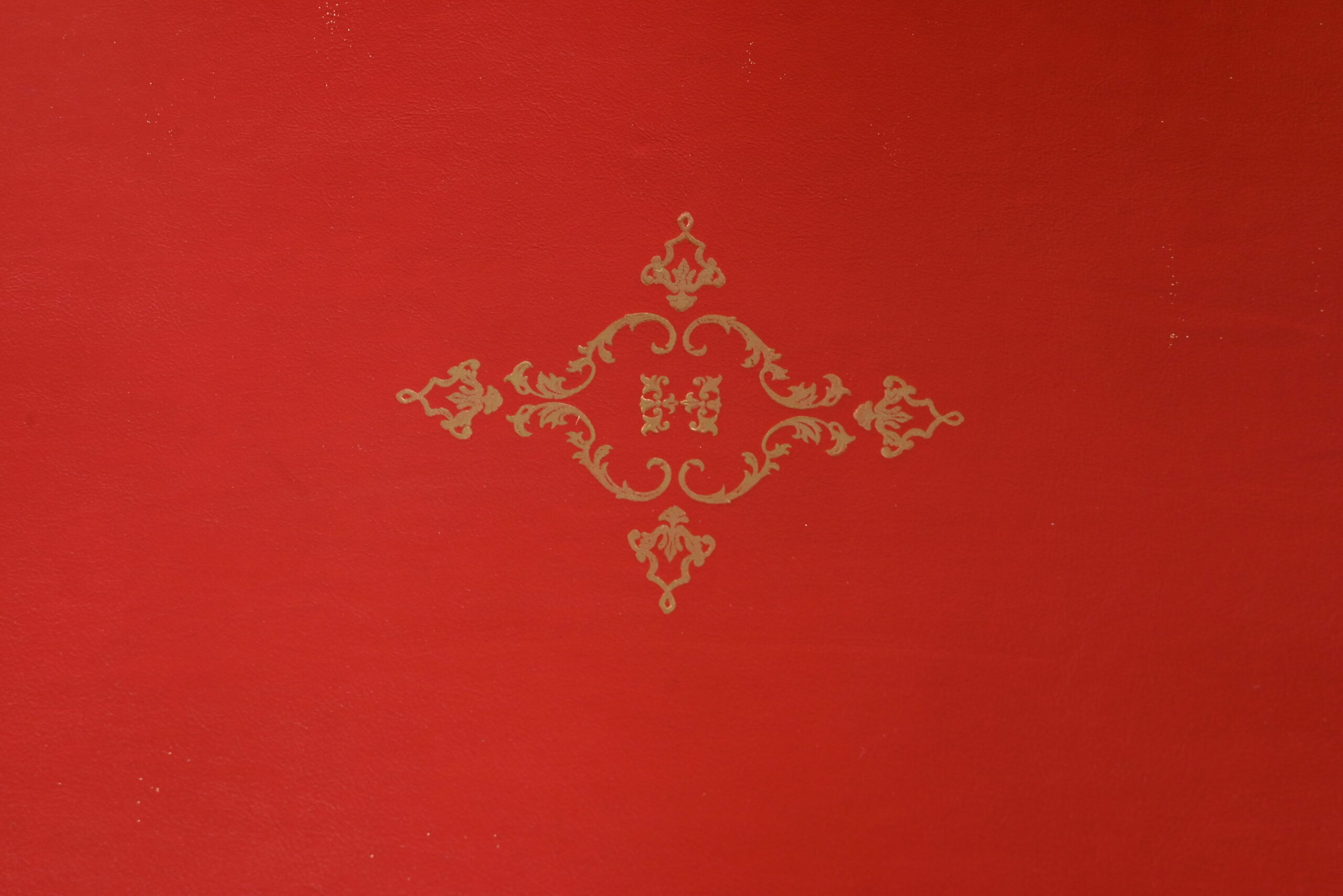 Il actionne simultanément l’ouverture d’une tablette foncée d’un cuir rouge, postérieur, orné de vignettes et motif dorés ajoutant une touche de luxe.
