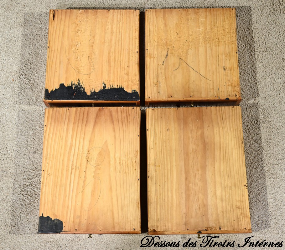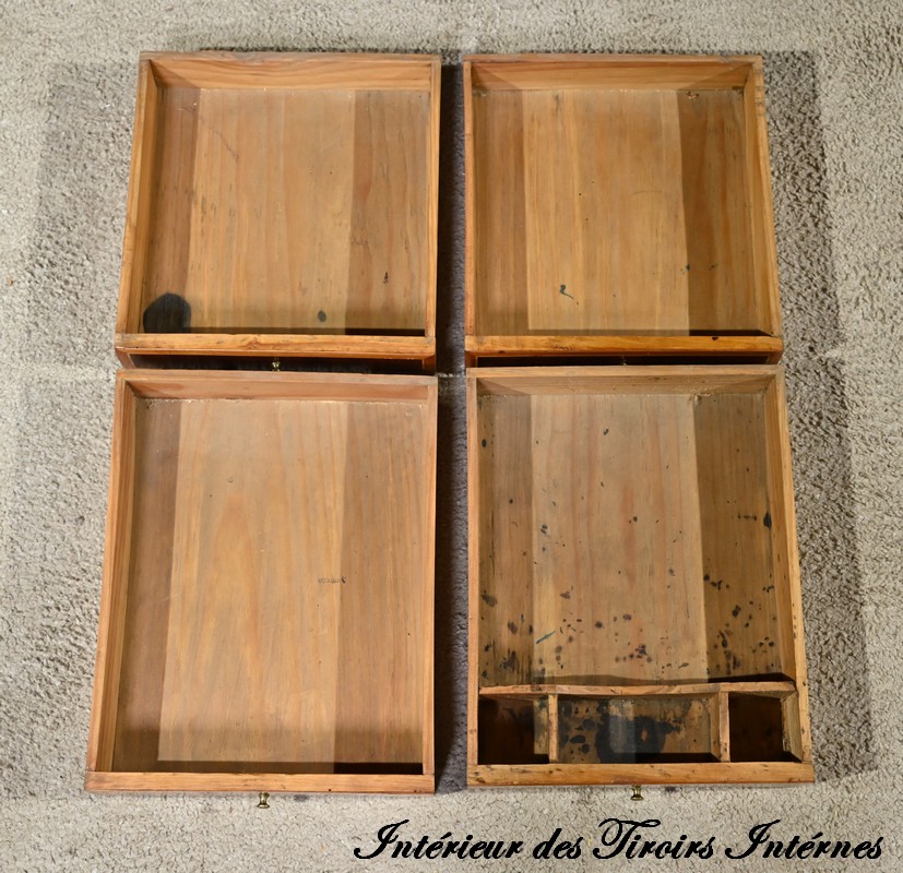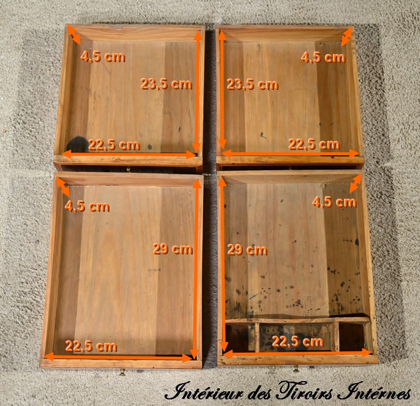 Les tiroirs intérieurs en acajou et bois clair, au nombre de quatre, munis de boutons lentille, ainsi que trois niches horizontales, offrent des solutions de rangement pratiques et esthétiques.