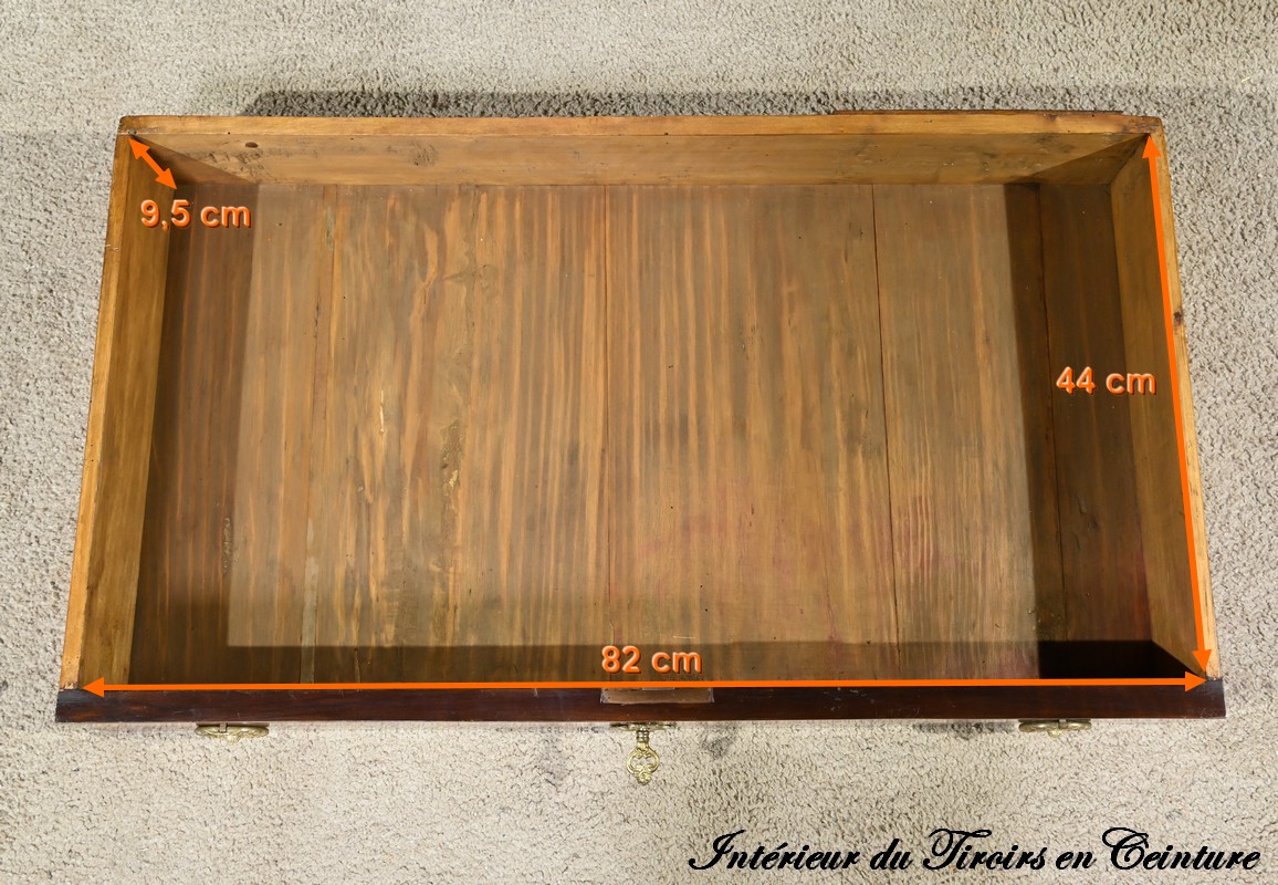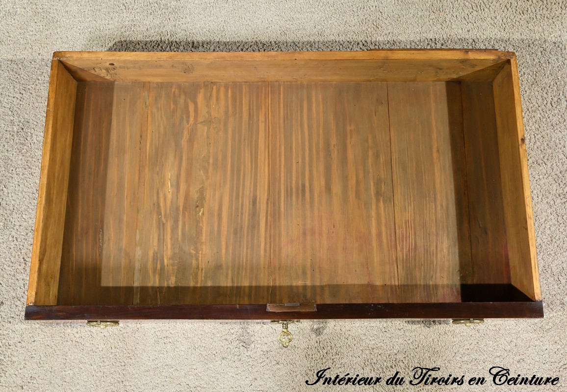 La ceinture chantournée comporte un large tiroir avec mascarons et anneaux de tirage. La présence de la serrure d’origine, accompagnée de son entrée et de sa clé, souligne l’authenticité et la valeur historique de cette pièce de mobilier.
