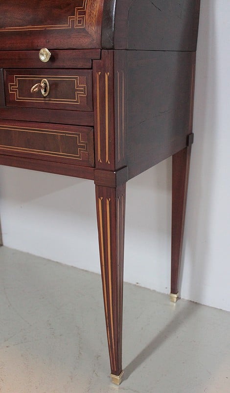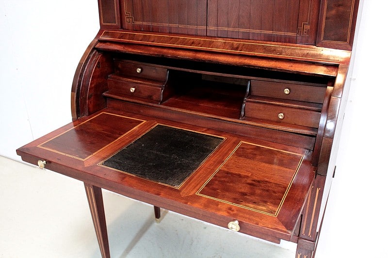 Bureau cylindre en acajou et acajou moucheté avec filets de buis.