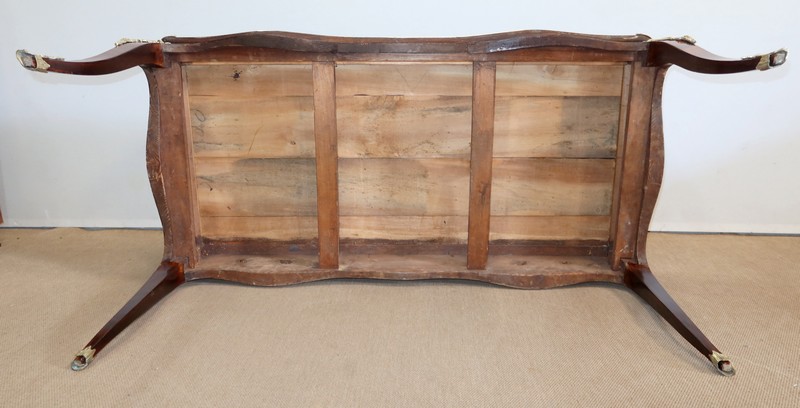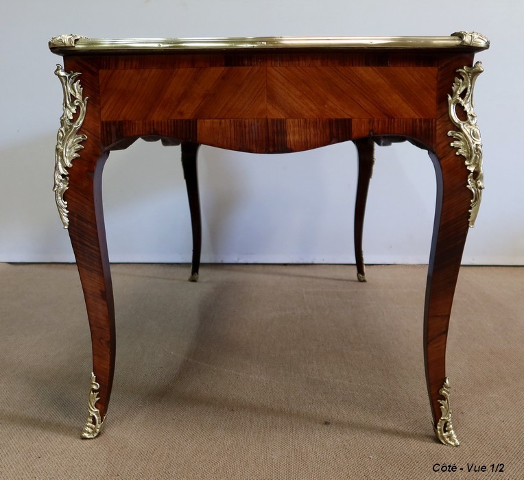 Élégant bureau de milieu à mouvement de style Louis XV, composé d’une harmonieuse structure en bois de rose et bois de violette. Son plateau à encadrement à mouvement présente une bordure en Bois de Violette, sublimé d’une moulure en bronze à profil et d’écoinçons à coquille et volutes dans chaque angle. Son dessus en cuir d’origine, avec vignette à froid dans son pourtour, comporte de légères marques du temps, qui apportent à ce meuble un authentique cachet. En façade, également mouvementée, ce bureau d’apparat ouvre par trois tiroirs, dont l’intérieur, les côtés et le fond sont en chêne : celui au centre est garni d’une importante entrée en bronze avec coquille et feuillage, tandis que ceux aux extrémités sont agrémentés en sus d’une poignée en bronze. Ces tiroirs sont munis d’une serrure d’origine en état de fonctionnement, ainsi que de leur clé. La face « arrière » est également habillée des mêmes ornements de bronzes, dans un souci d’esthétisme et d’équilibre, étant donné que les tiroirs sont factices. Ce bureau repose sur quatre pieds galbés, décorés en partie haute d’une importante chute en bronze, et en partie basse d’un sabot du même alliage. Vous serez charmés par l’agréable contraste des placages de Bois de Rose et de Bois de Violette, rehaussé par le faste et l’éclat des garnitures en bronze, qui font de ce Bureau d’Apparat un magnifique mobilier.