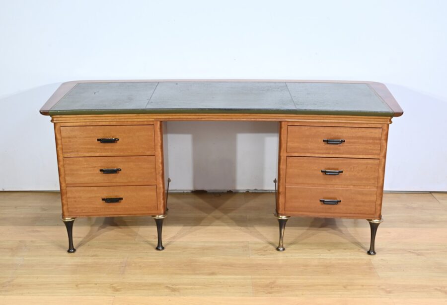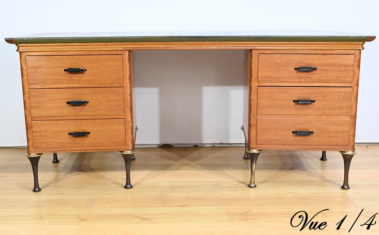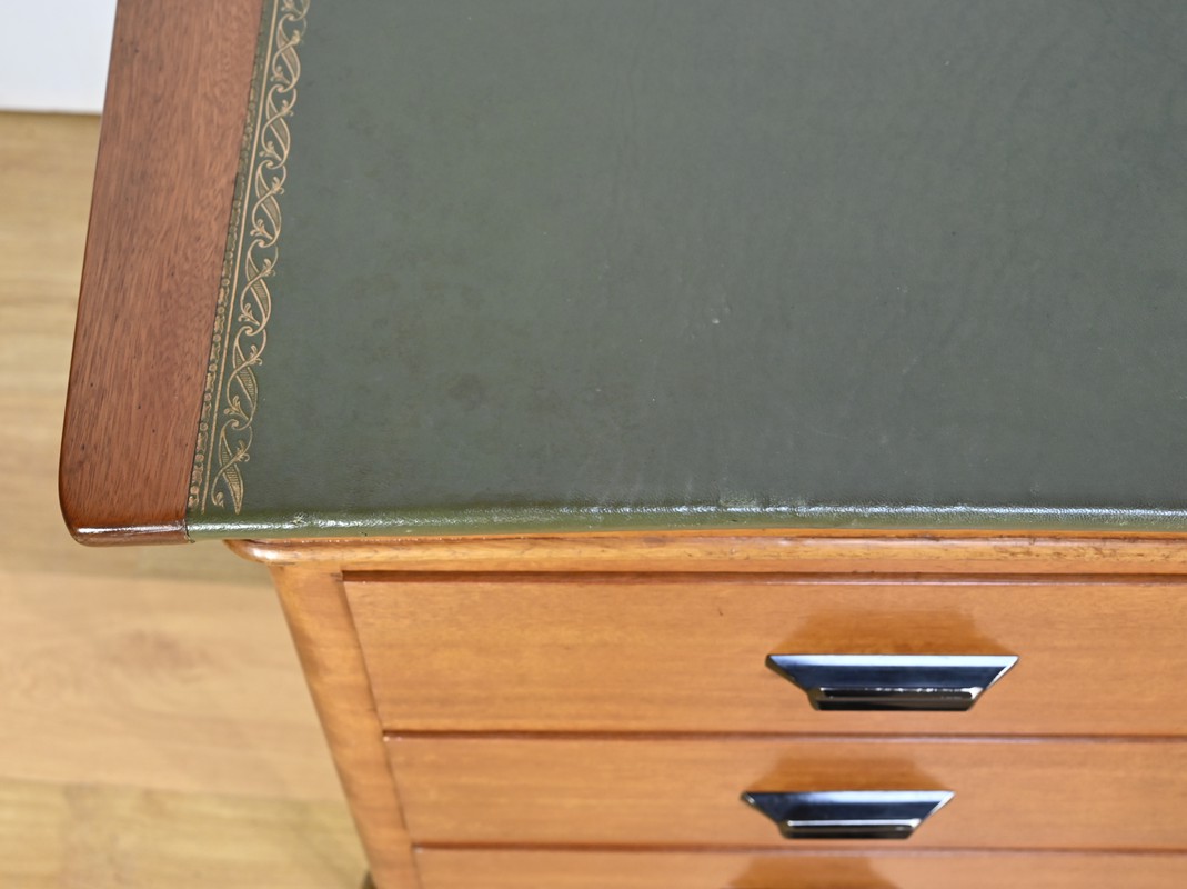 Ce bureau d’architecte en acajou massif et plaqué, légèrement concave en façade, présente un important plateau à débordement.