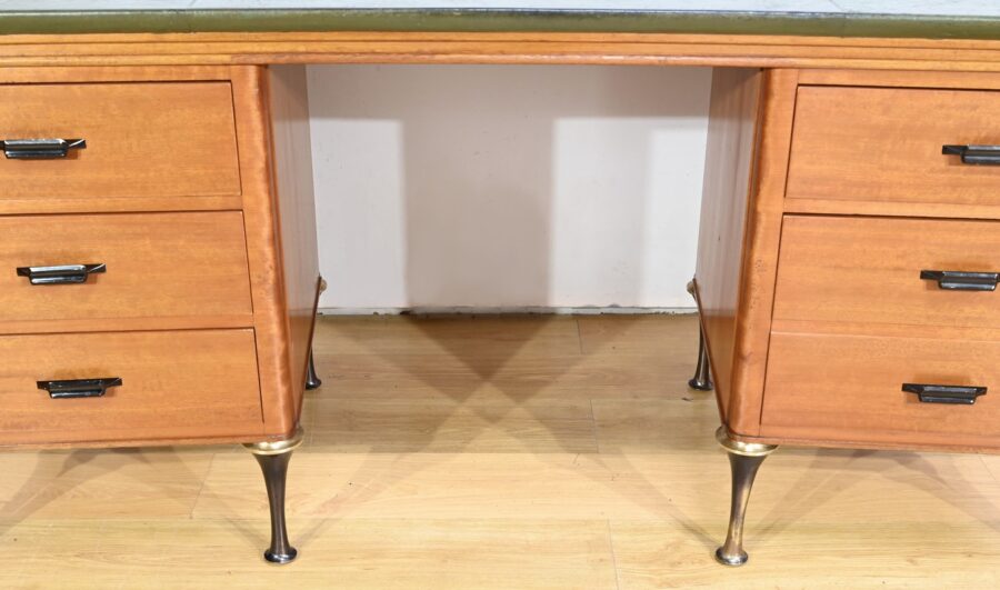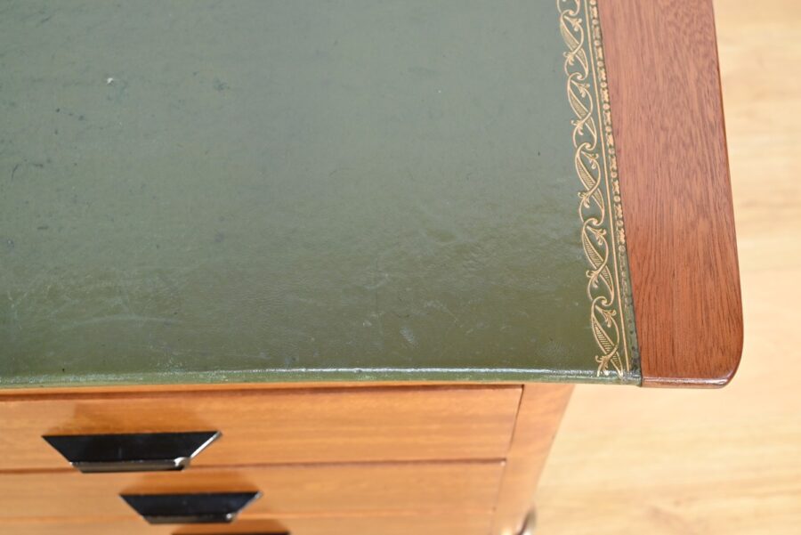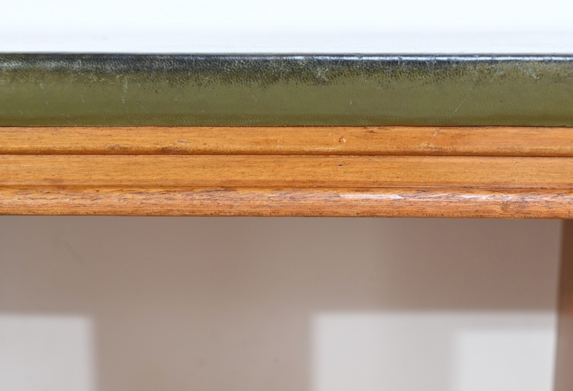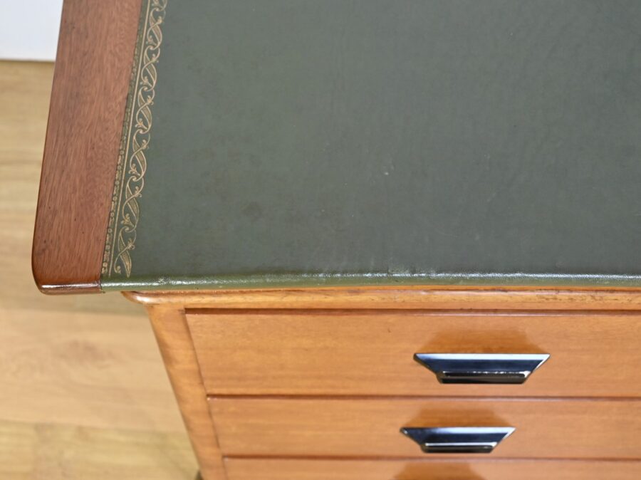 Le plateau est habillé d’un cuir vert, avec vignettes dorées, recouvrant le chant avant et souligné par un cadre à coupe d’onglet sur trois faces.