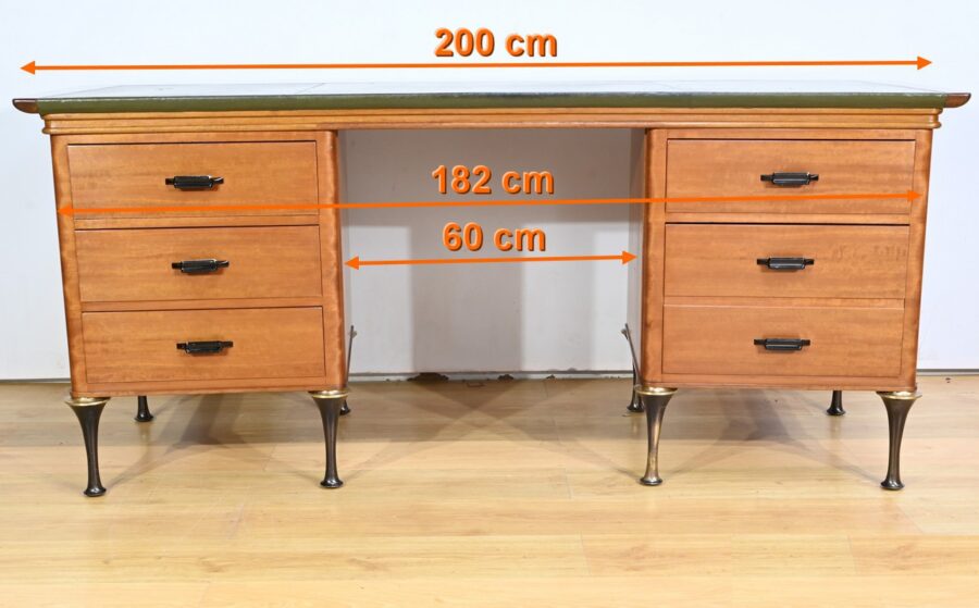 Ce dessus est porté par deux caissons avec trois tiroirs identiques à gauche et deux tiroirs à droite dont un, plus haut, à double façade.