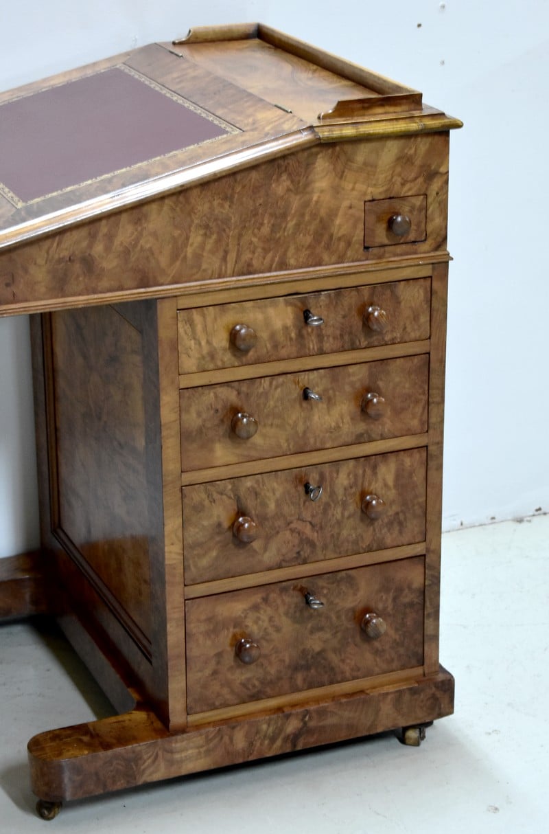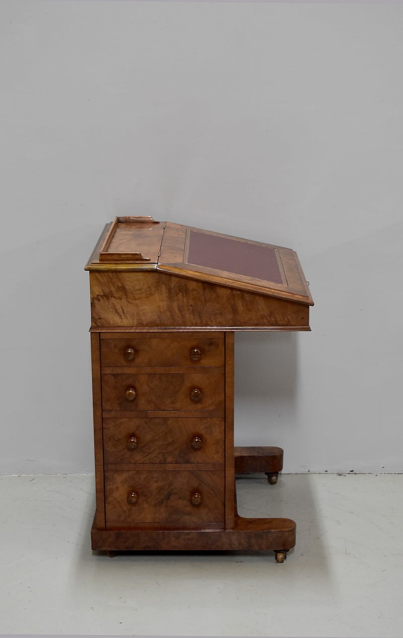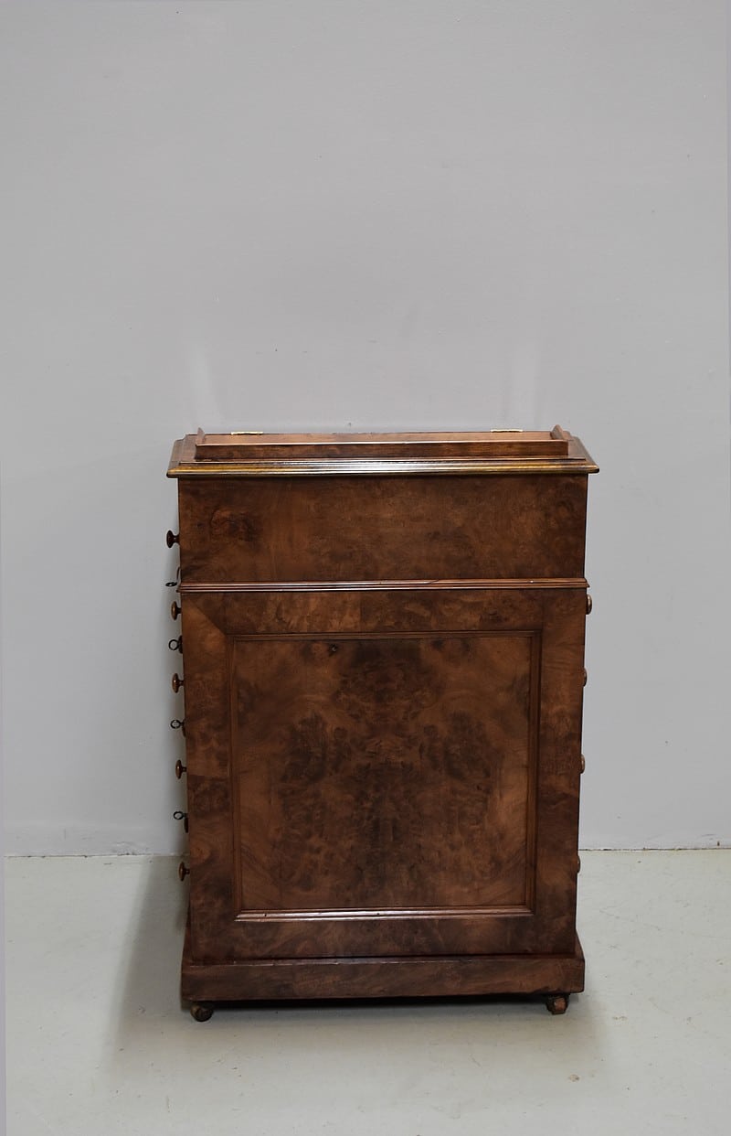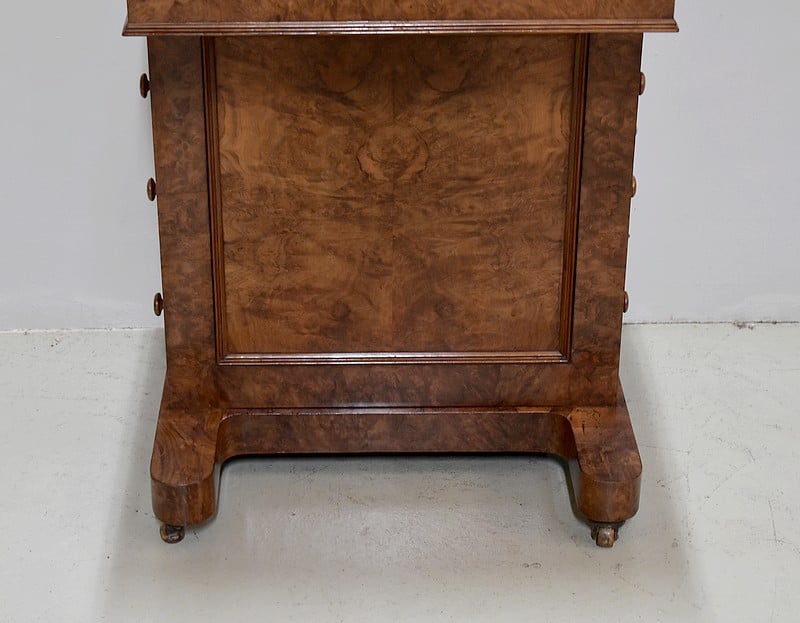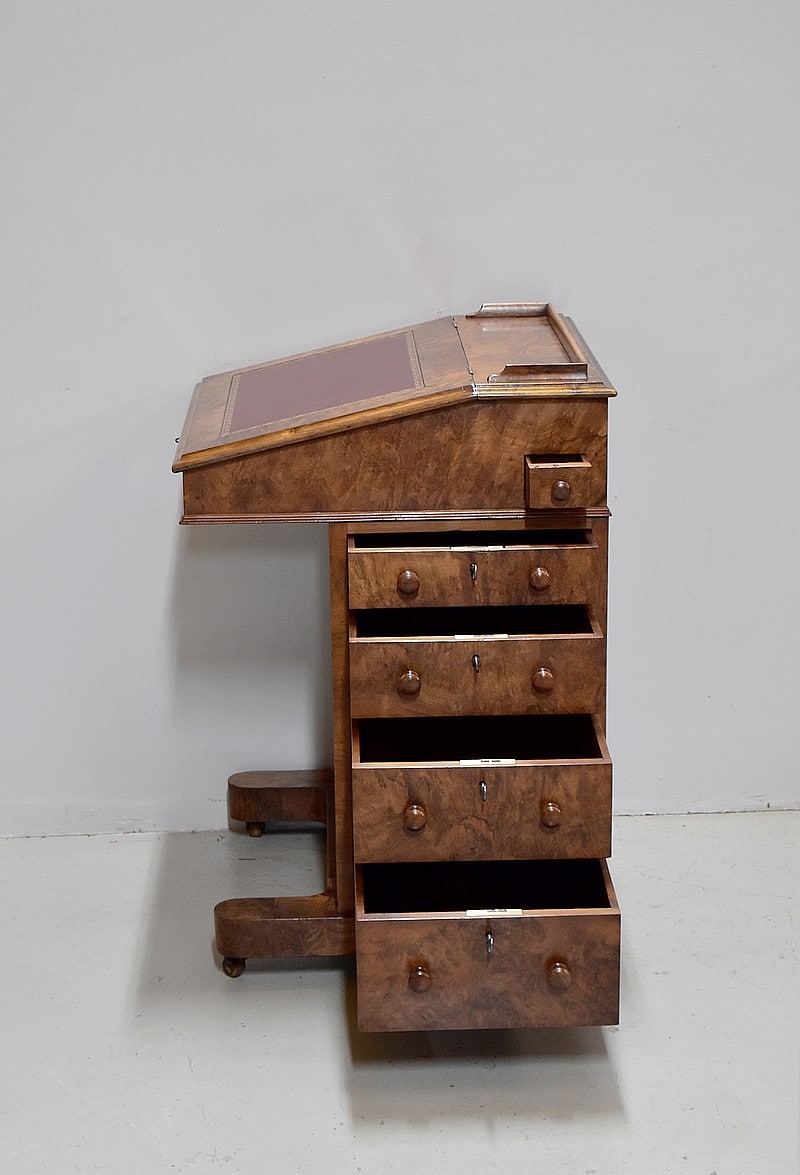 Bureau écritoire Anglais de milieu, Davenport en placage de Ronce de Noyer, mouluré toutes faces, sur roulettes.