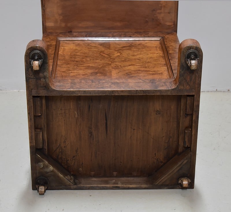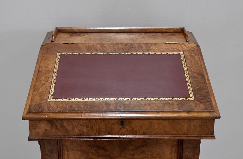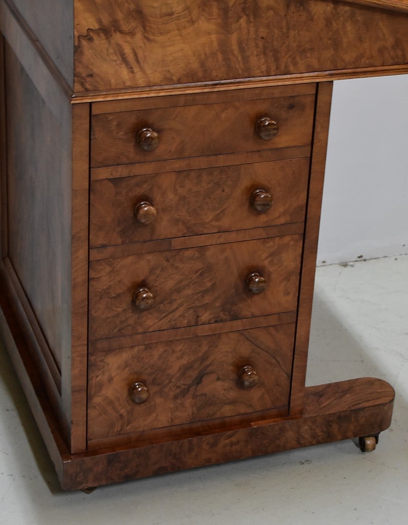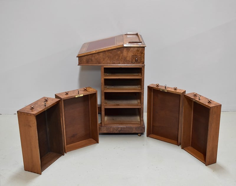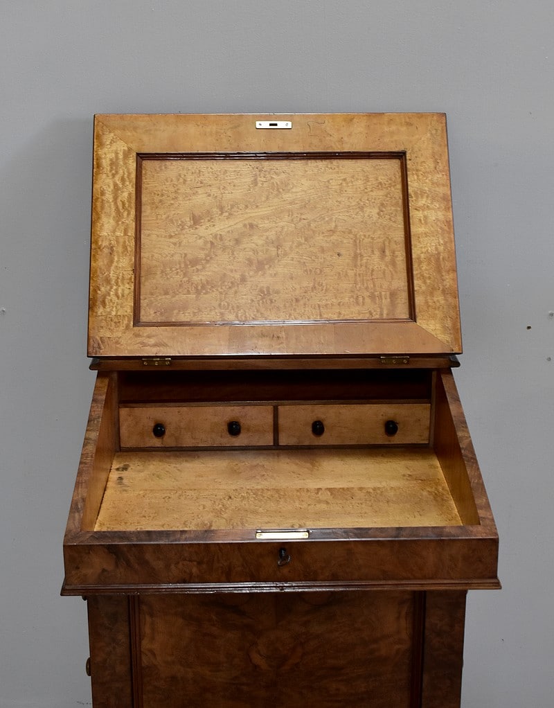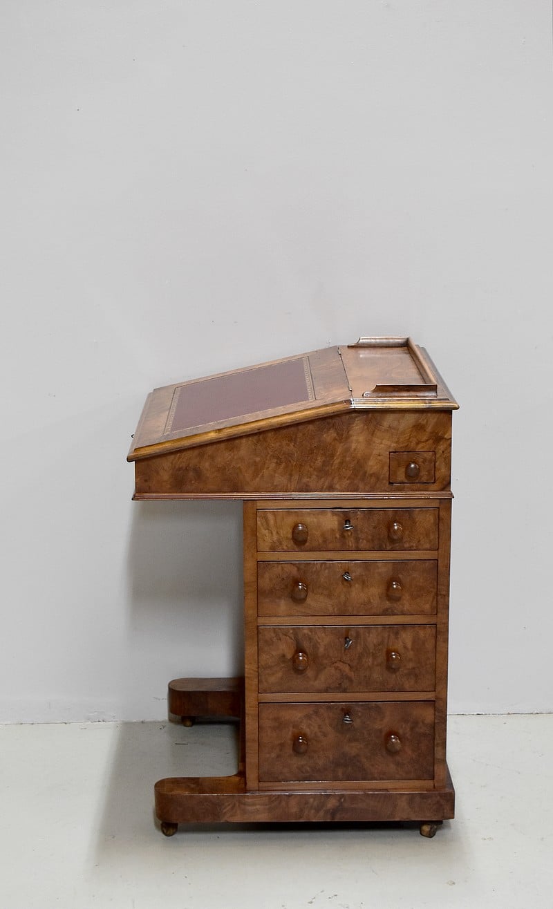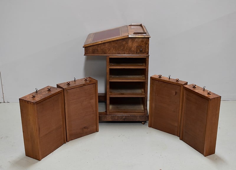 Bureau écritoire Anglais de milieu, Davenport en placage de Ronce de Noyer, mouluré toutes faces, sur roulettes.