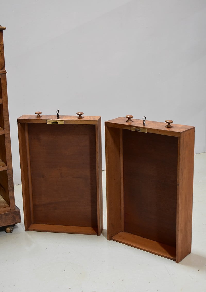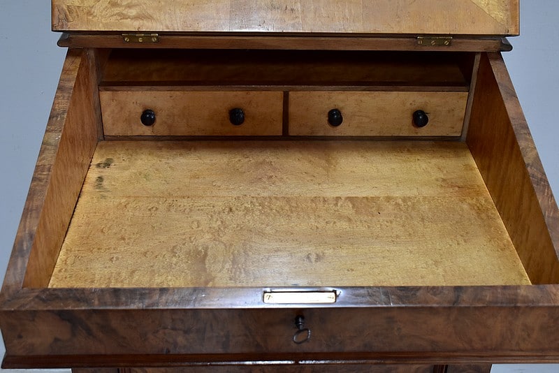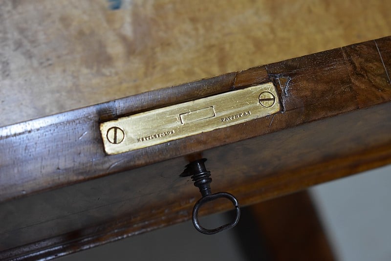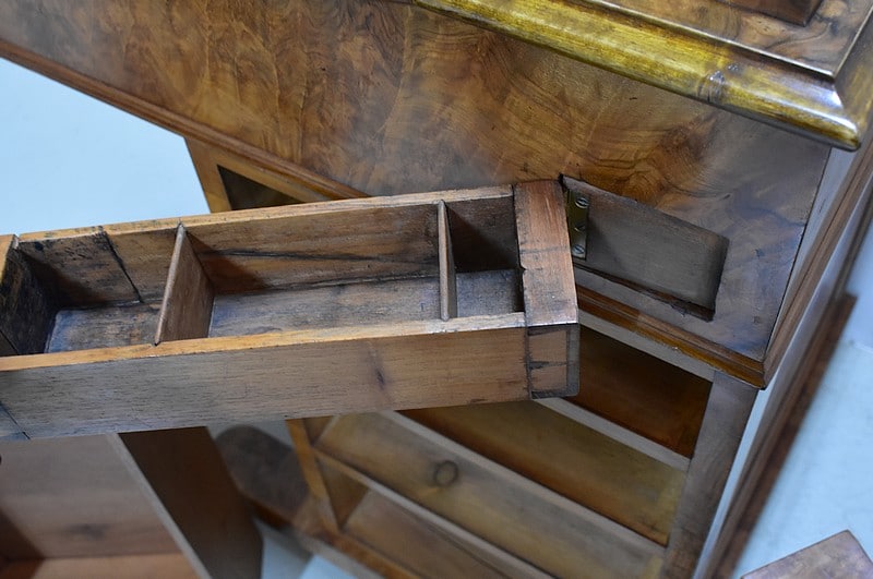 Il ouvre sur le côté droit par 4 tiroirs avec serrures d’origine, de hauteurs différentes en plus du petit en partie haute, tandis que le côté gauche est habillé de faux tiroirs.