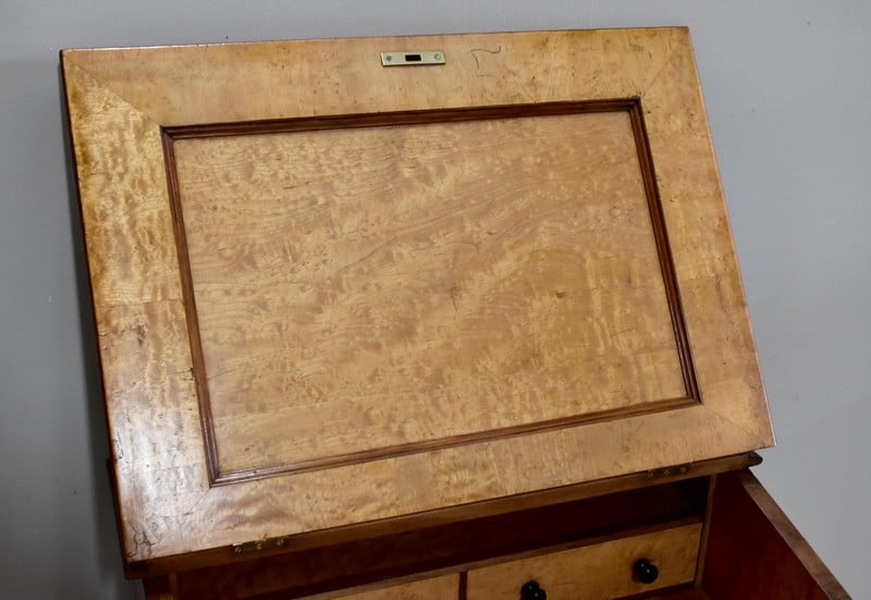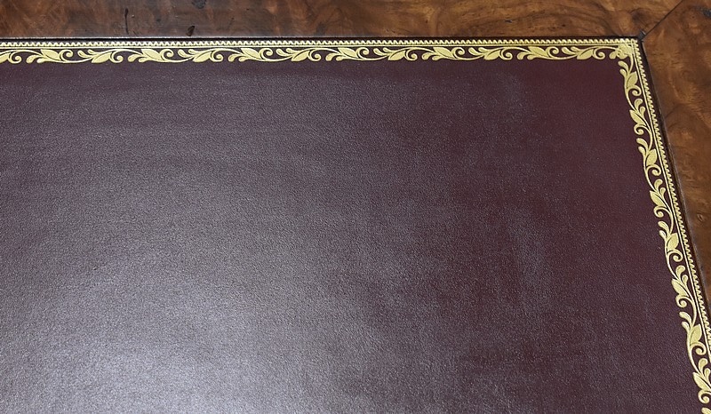 Son dessus incliné fermant à clef, gainé d’un cuir Bordeaux refait orné d’une frise dorée, qui se relève, découvrant un intérieur en érable moucheté.