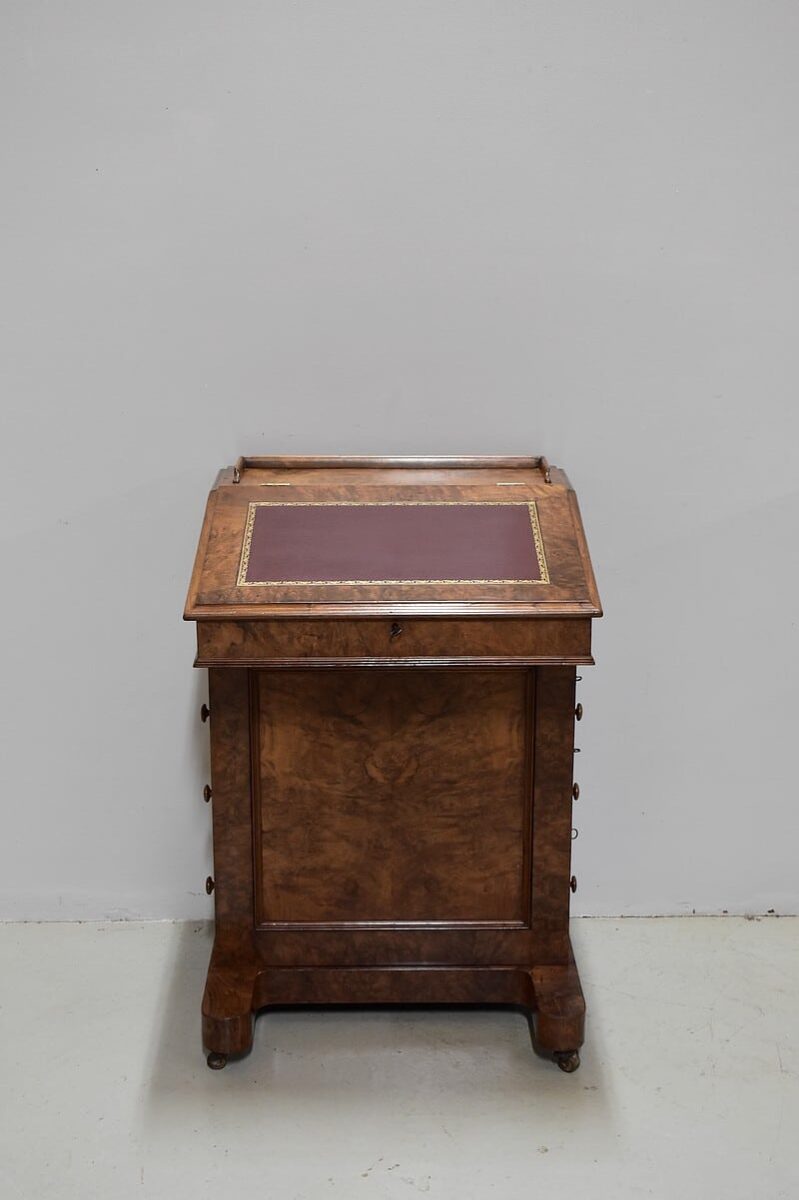 Bureau écritoire Anglais de milieu, Davenport en placage de Ronce de Noyer, mouluré toutes faces, sur roulettes.