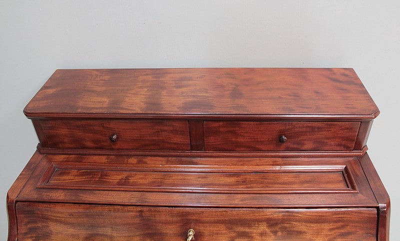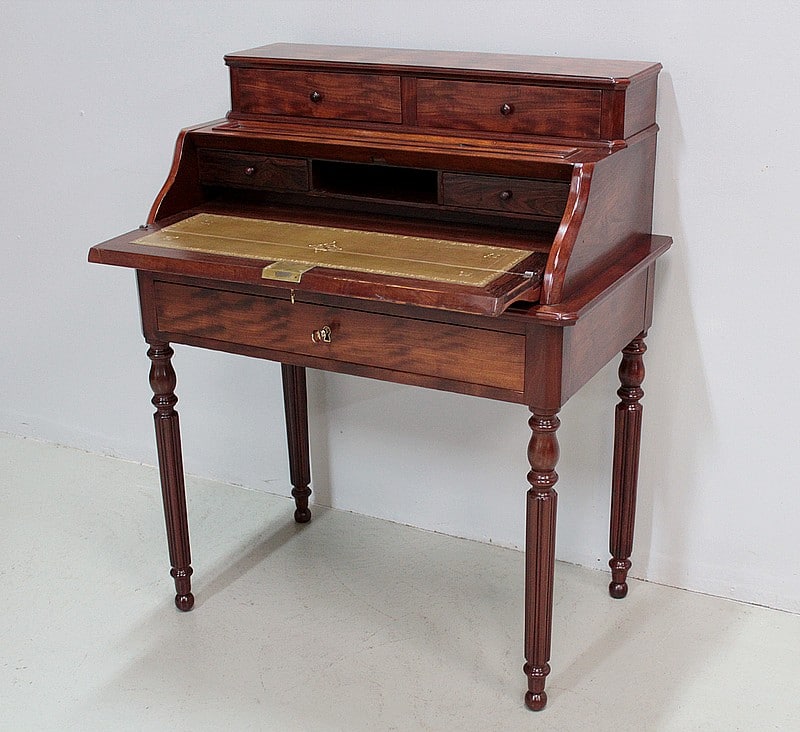 Il ouvre par 2 tiroirs dans le gradin, 1 grand tiroir en ceinture et un abattant à doucine découvrant un intérieur en palissandre composé de 2 petits tiroirs, 1 casier et un plan de travail, mesurant 70cm X 30cm, gainé d’un cuir vert bronze (changé).