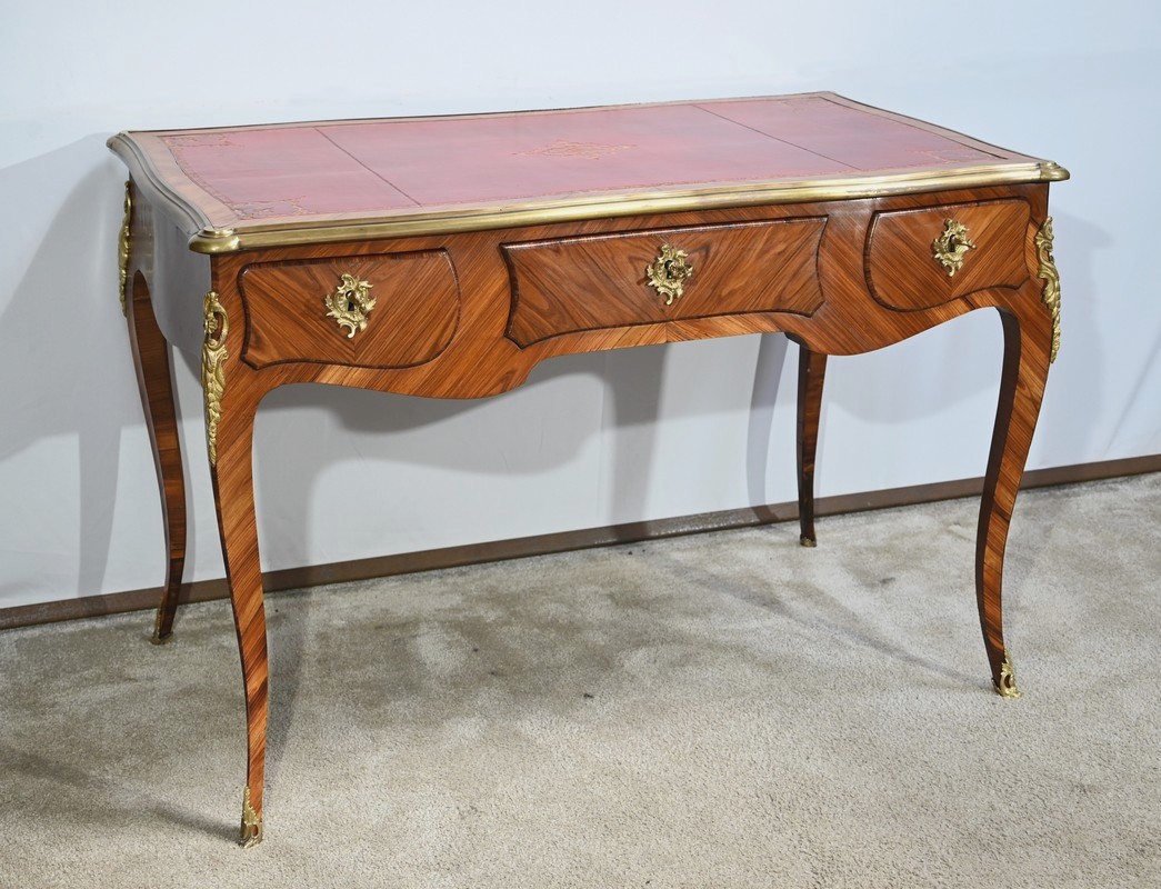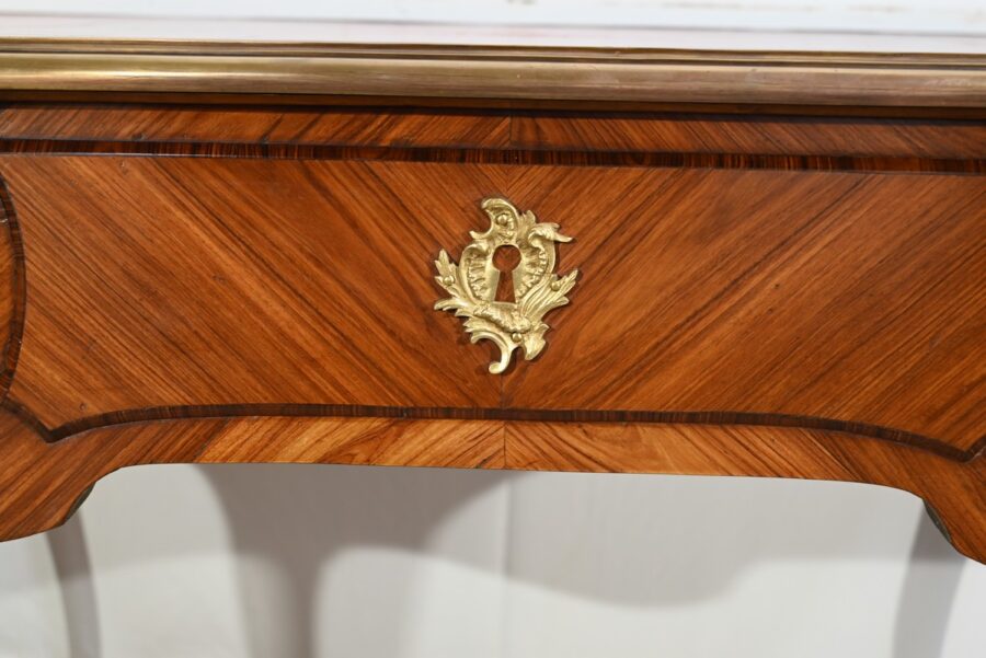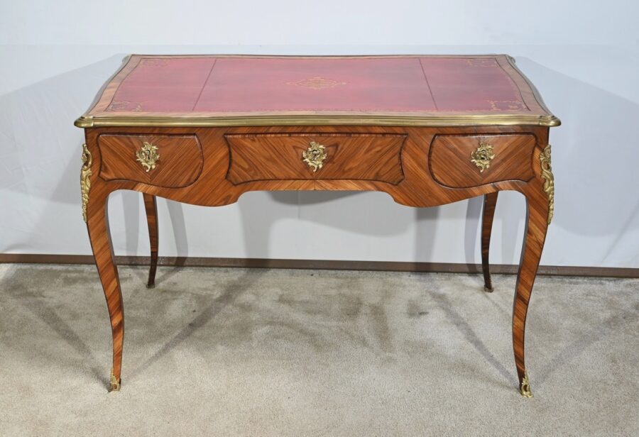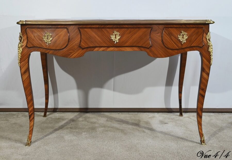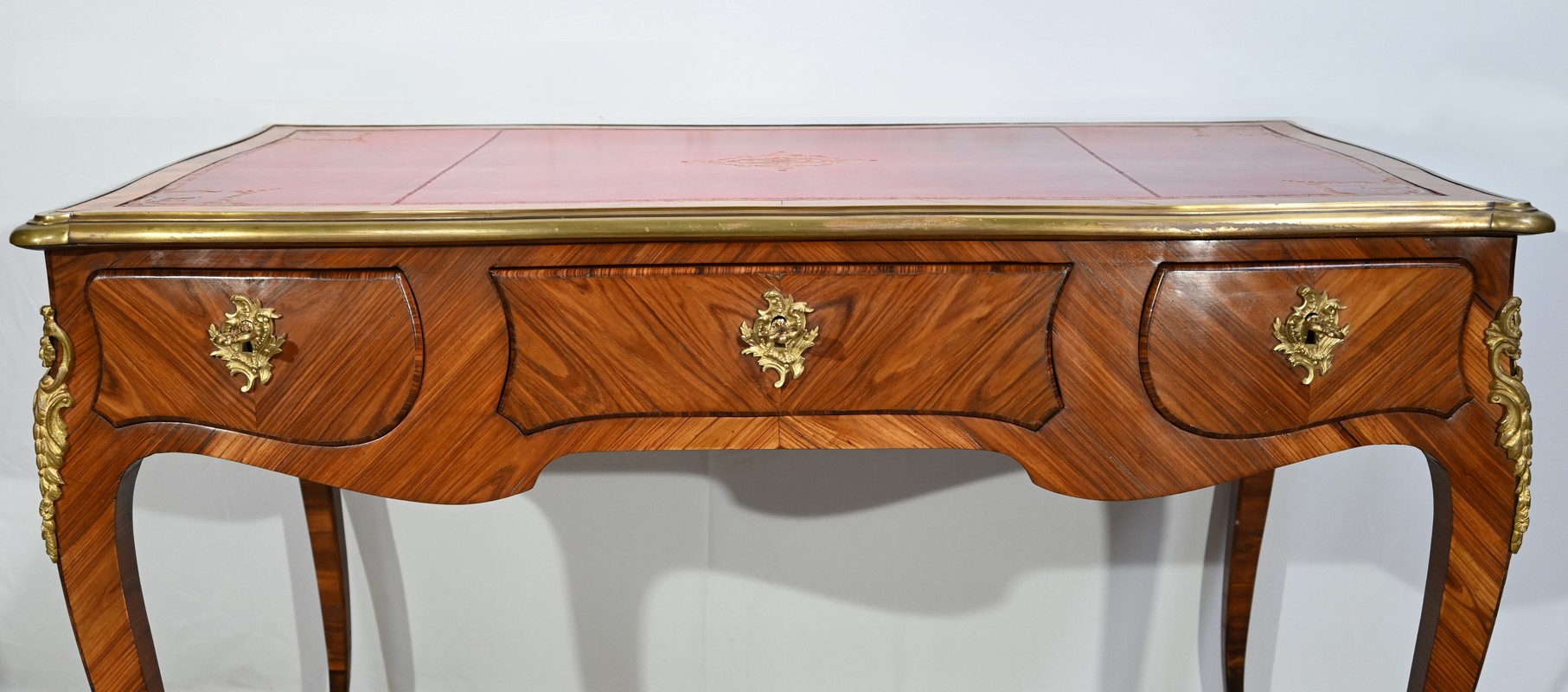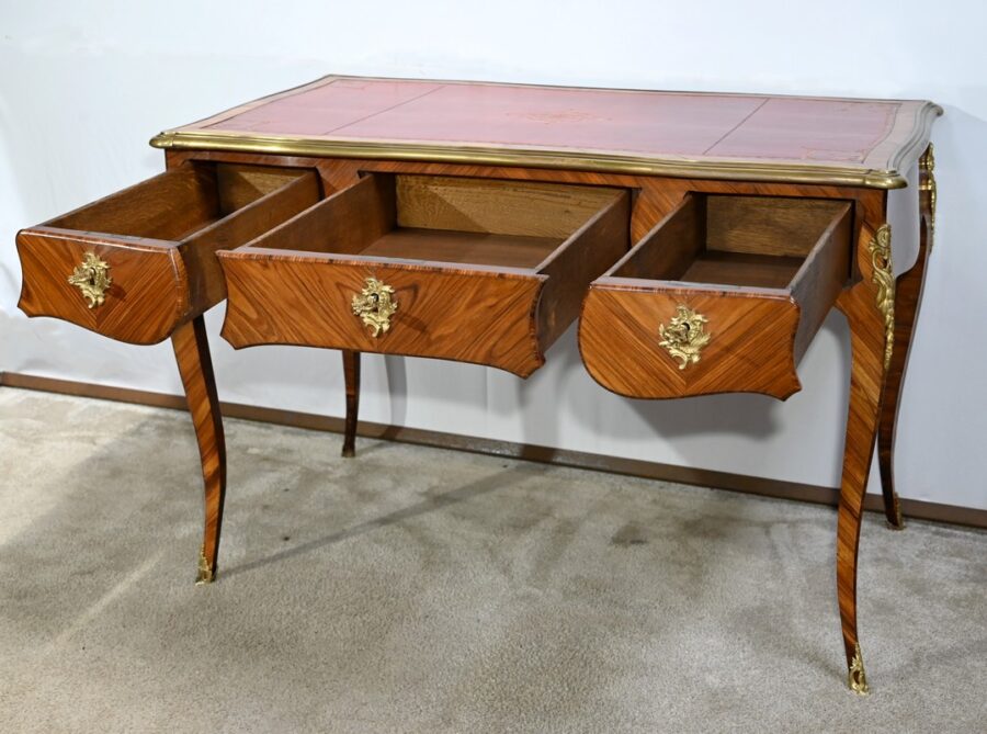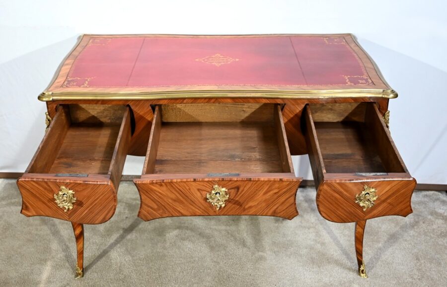 Ce bureau en placage de bois de rose ouvre en ceinture par trois tiroirs, à façade à débordement, à savoir deux petits et un grand central.