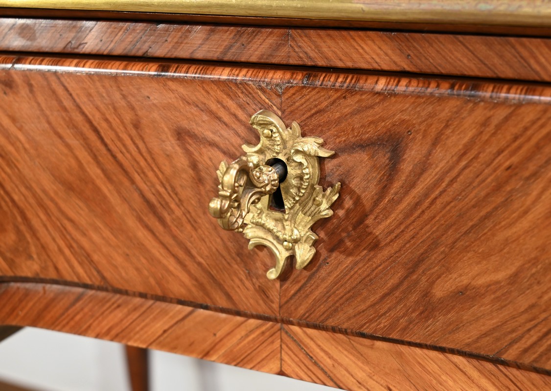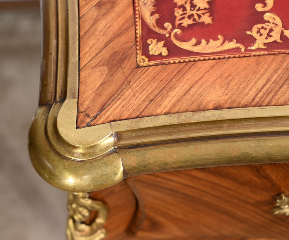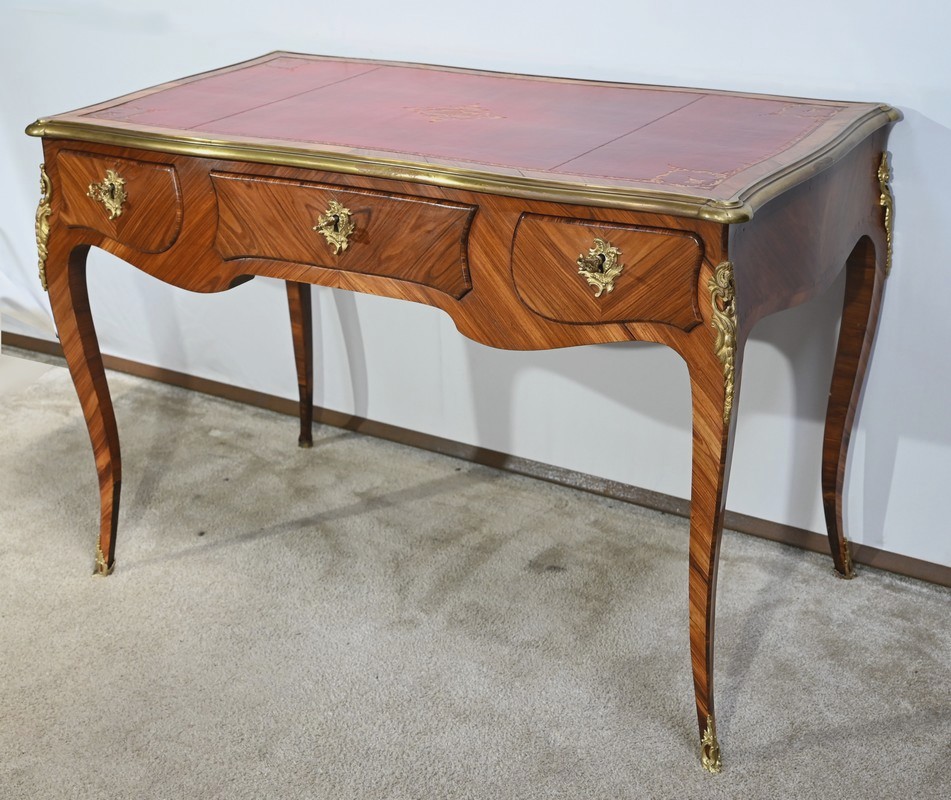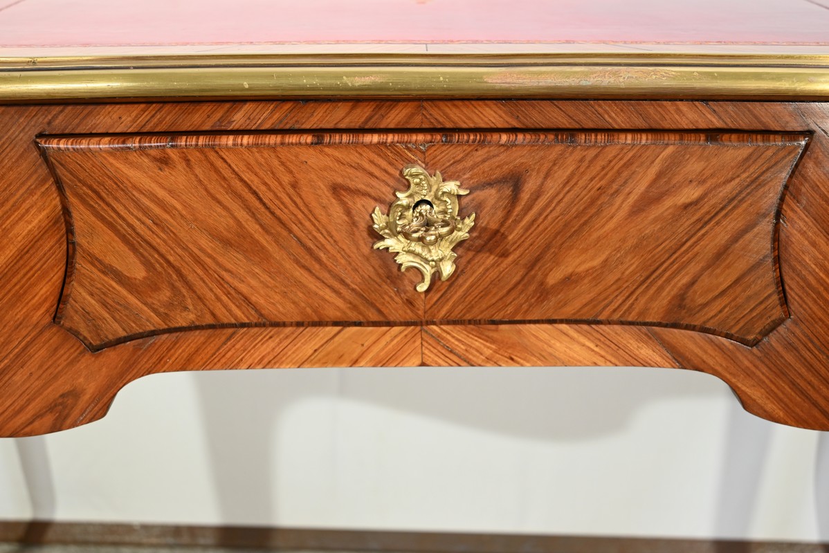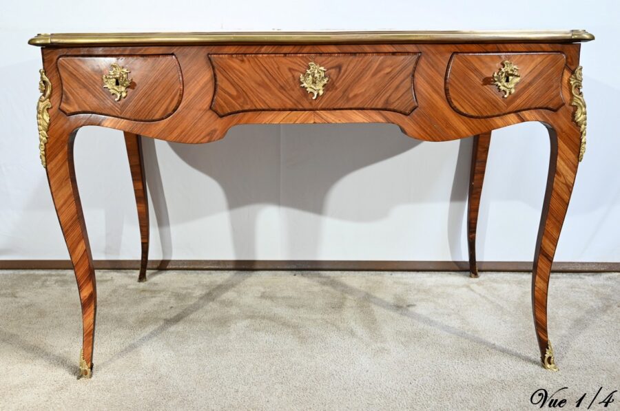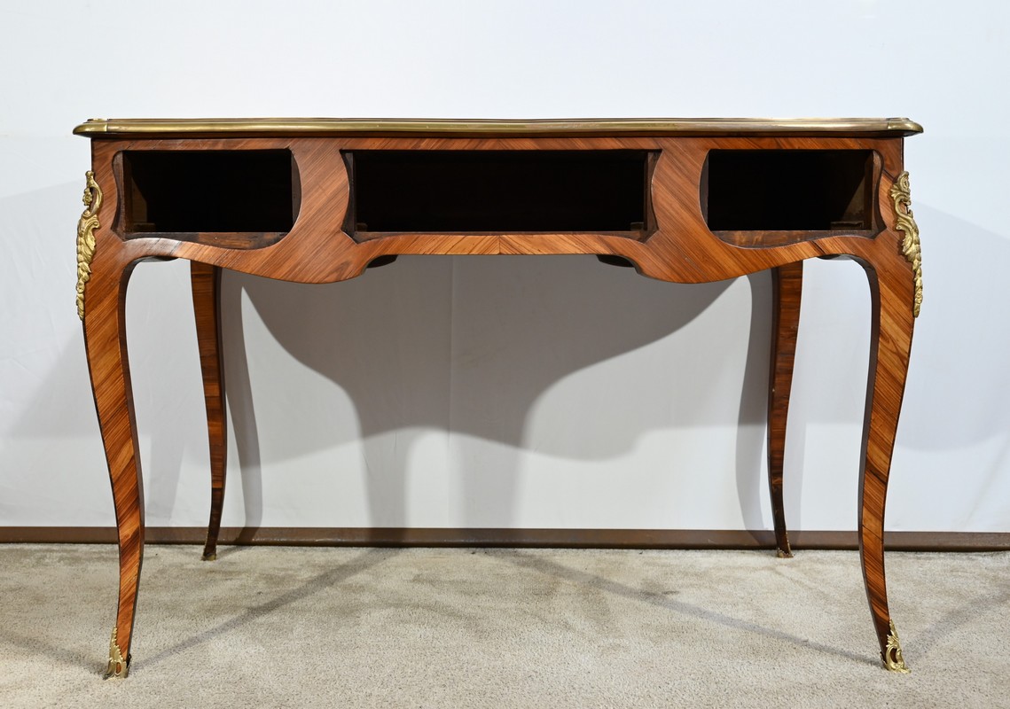 Ce bureau en placage de bois de rose ouvre en ceinture par trois tiroirs, à façade à débordement, à savoir deux petits et un grand central.