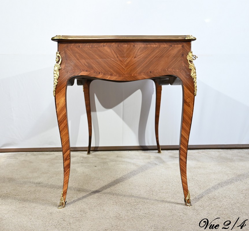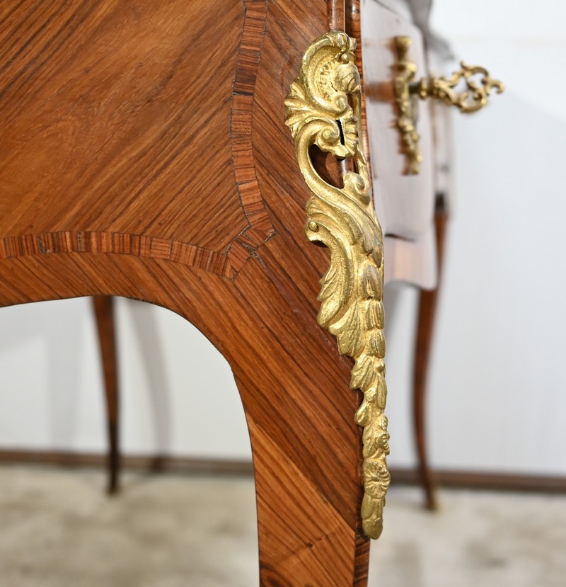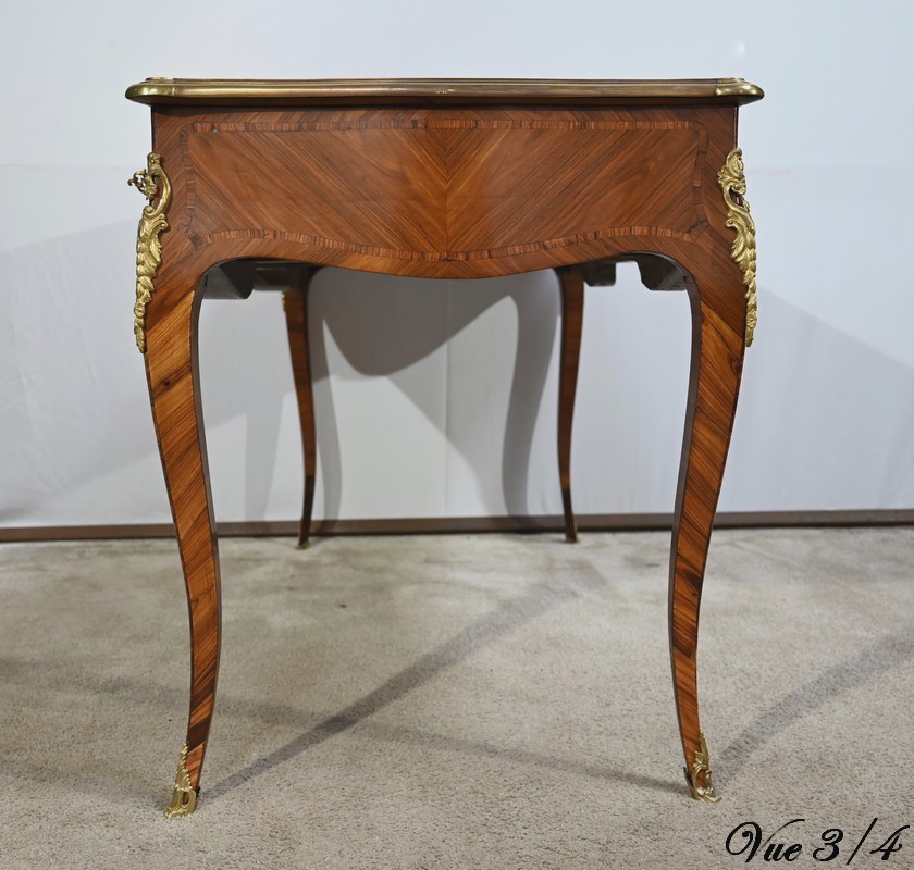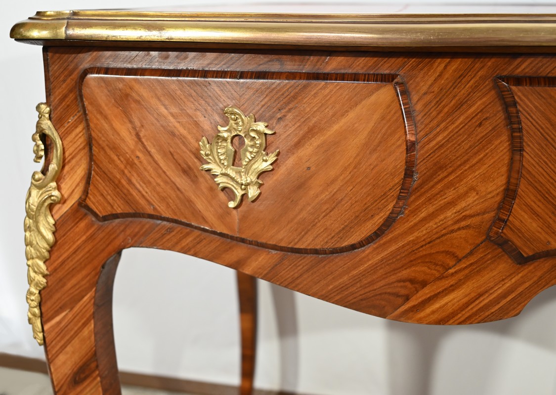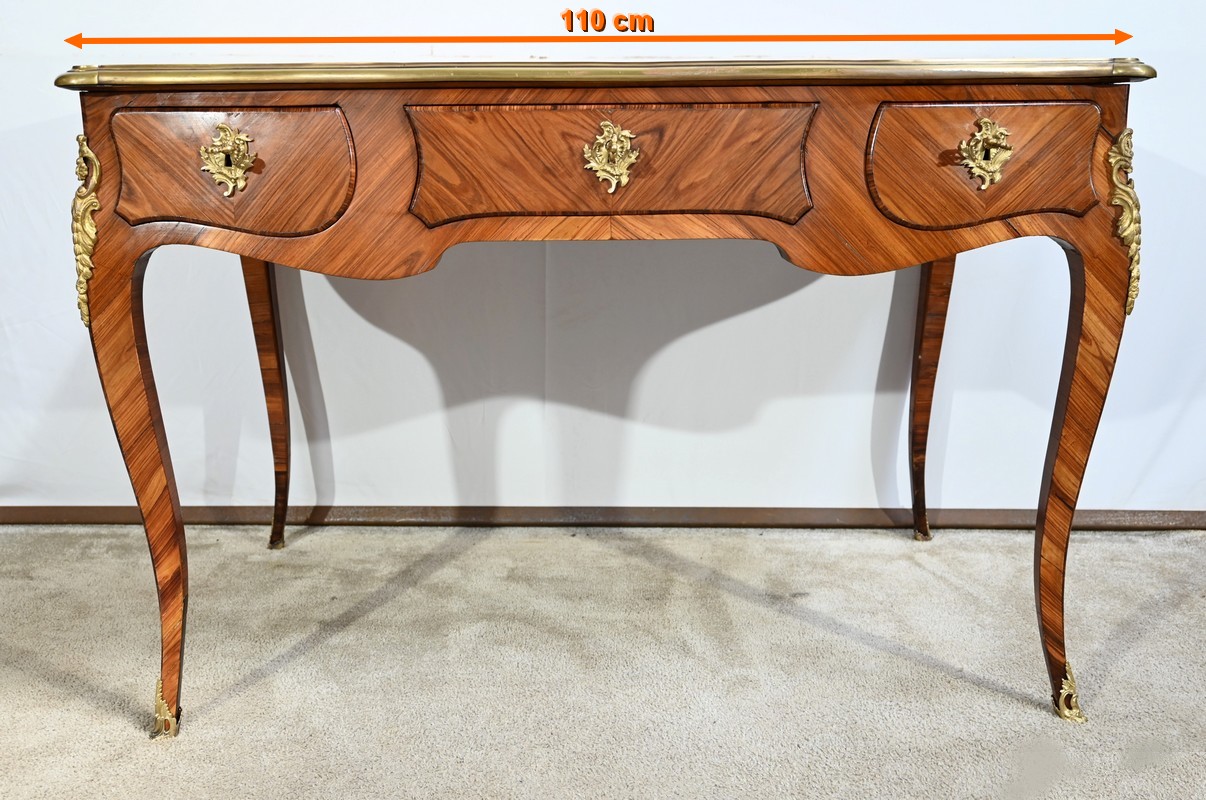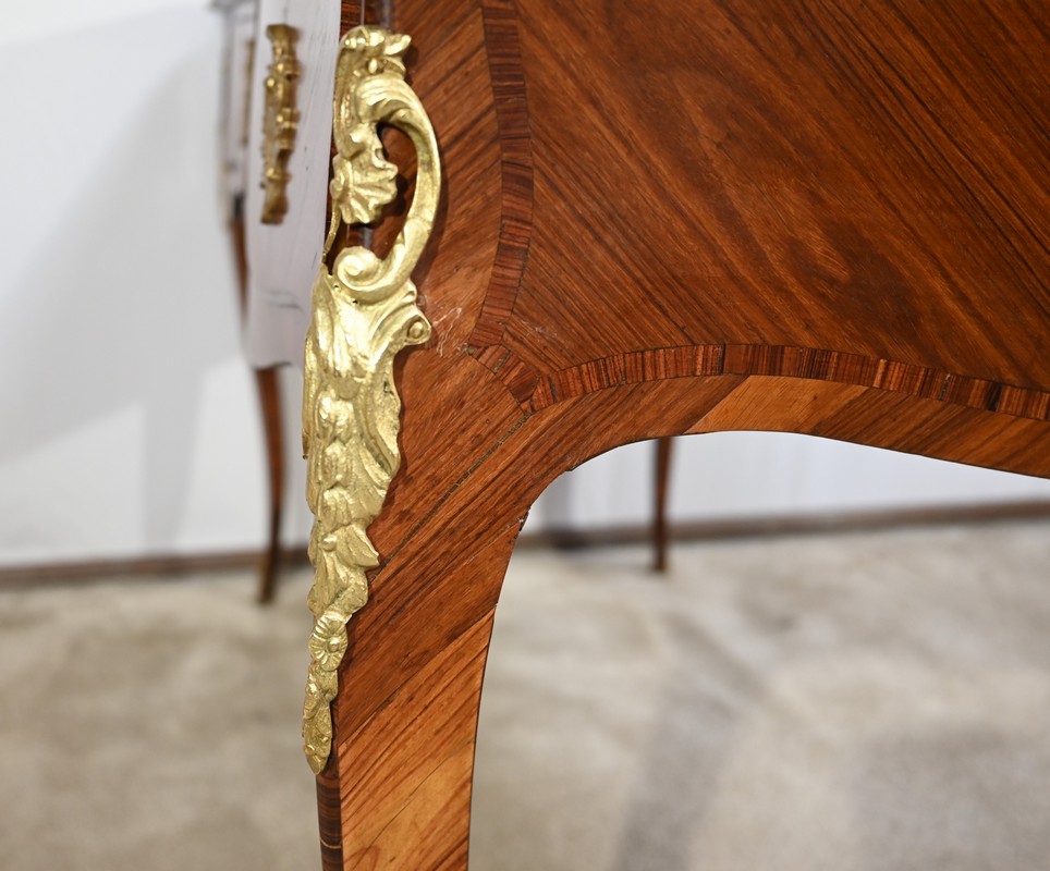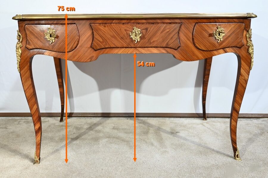 Ce bureau en placage de bois de rose ouvre en ceinture par trois tiroirs, à façade à débordement, à savoir deux petits et un grand central.
