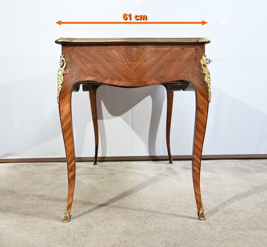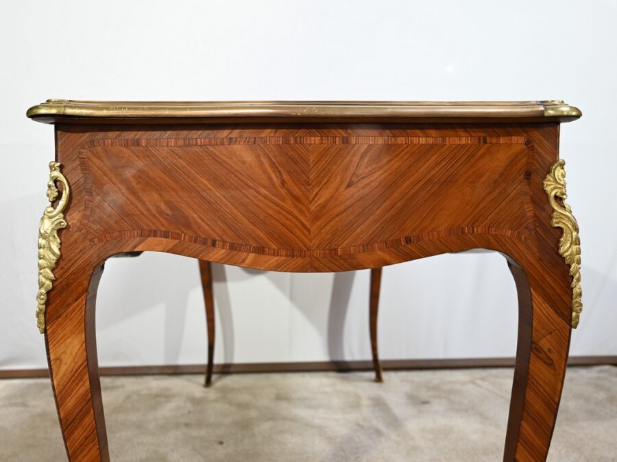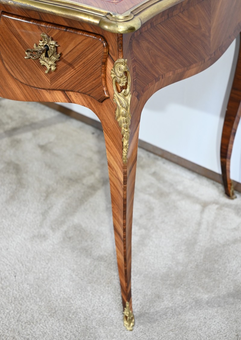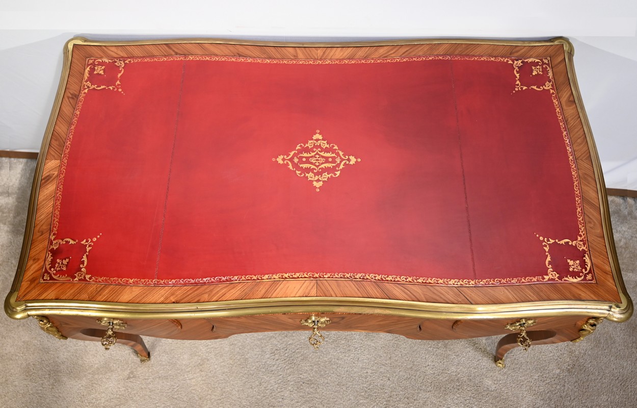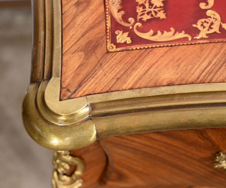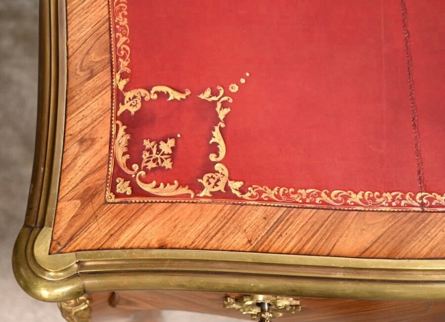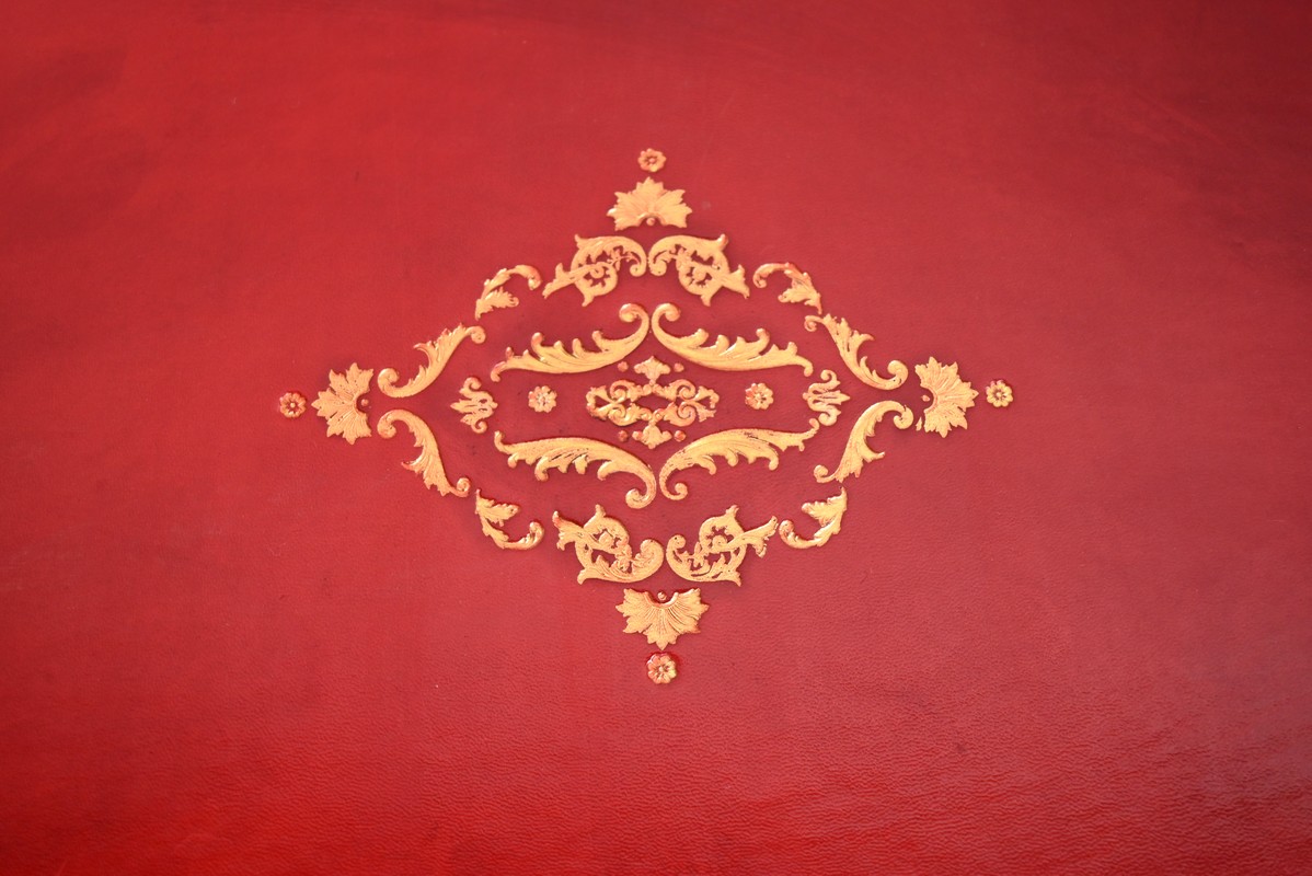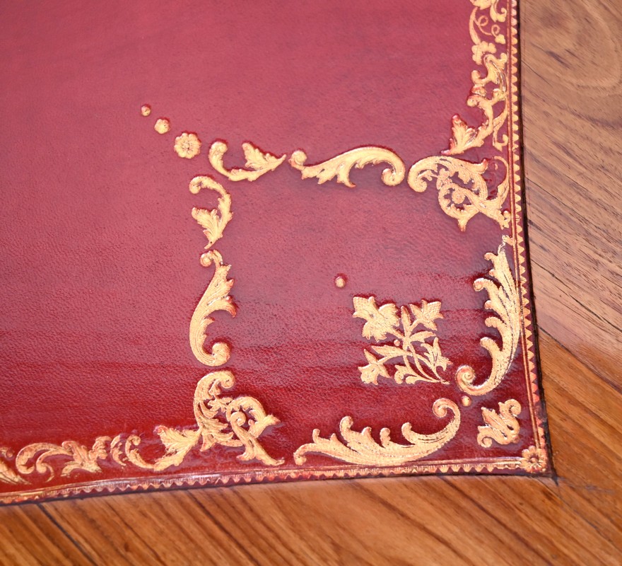 Le plateau est recouvert d’un cuir rouge authentique décoré de rinceaux dorés, de motifs d’angles et d’un motif central entouré d’une bande de placage en bois de rose en développé et bordé d’une double moulure en laiton.