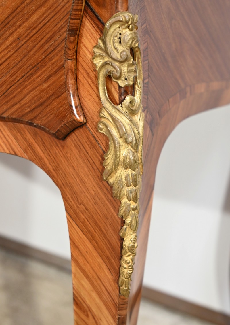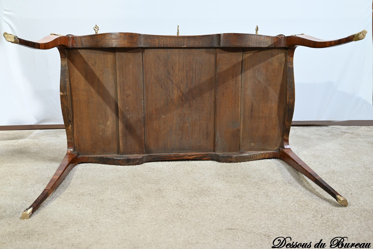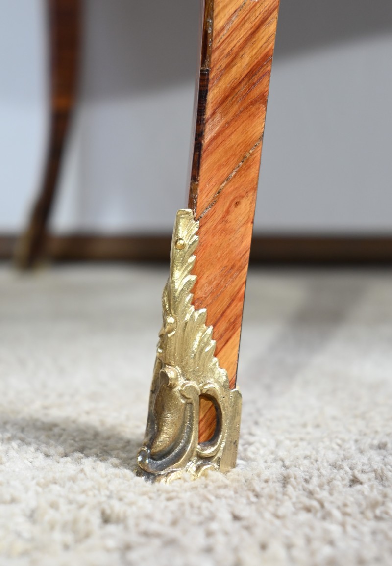 Les côtés sont plaqués en bois de rose disposé en ailes de papillon avec un rectangle marqueté en bois de violette plaqué verticalement.