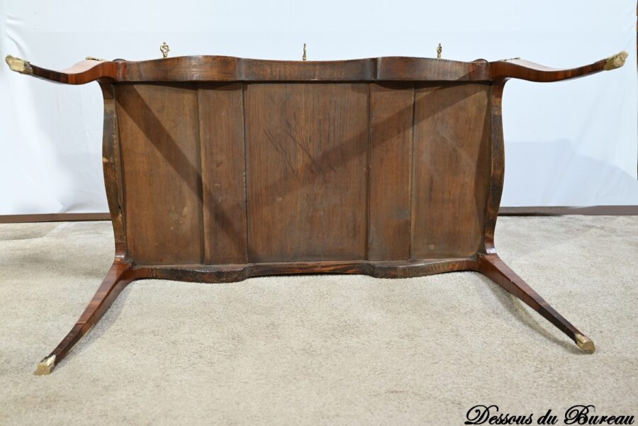 L’ensemble repose sur quatre pieds coup de fouet habillé de chutes et de sabots en bronze.