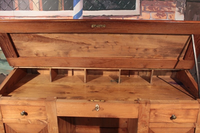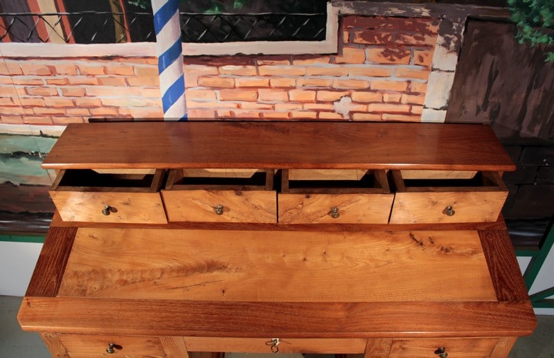 Bureau de pente à caissons en Frêne et acacia, surmonté d’un gradin ouvrant par 4 tiroirs. L’abattant renferme un espace plat avec 5 casiers. Quant à la partie basse, elle ouvre par 2 tiroirs et 2 portes. Le tiroir du milieu est un faux garni d’une entrée en os.