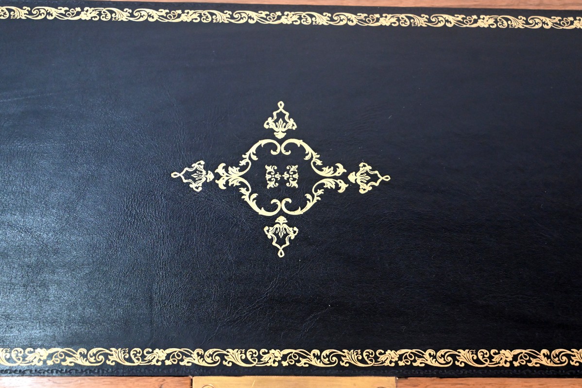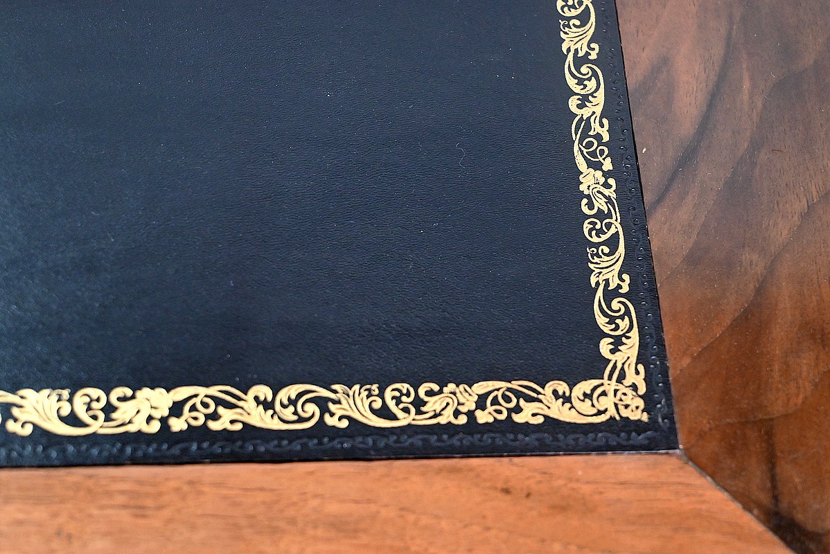 Ce meuble régional, entièrement en noyer massif, dispose d’un important abattant constitué d’un seul panneau au jointement parfait et d’un cadre à coupe d’onglet. Il est équipé d’une serrure d’origine fonctionnelle avec sa clé et son entrée bronze. Ouvert, il repose sur deux supports coulissants à boutons laiton. L’espace écritoire est foncé d’un cuir noir à vignette et motif central dorés. L’intérieur, dit à gradins, propose, de chaque côté, trois tiroirs en forme et, au centre, une porte formant tabernacle avec étagère. Particularité de ce meuble : sa niche, qui dissimule deux fermoirs. Ce système permet de condamner de façon alternée les deux petits tiroirs de la façade.